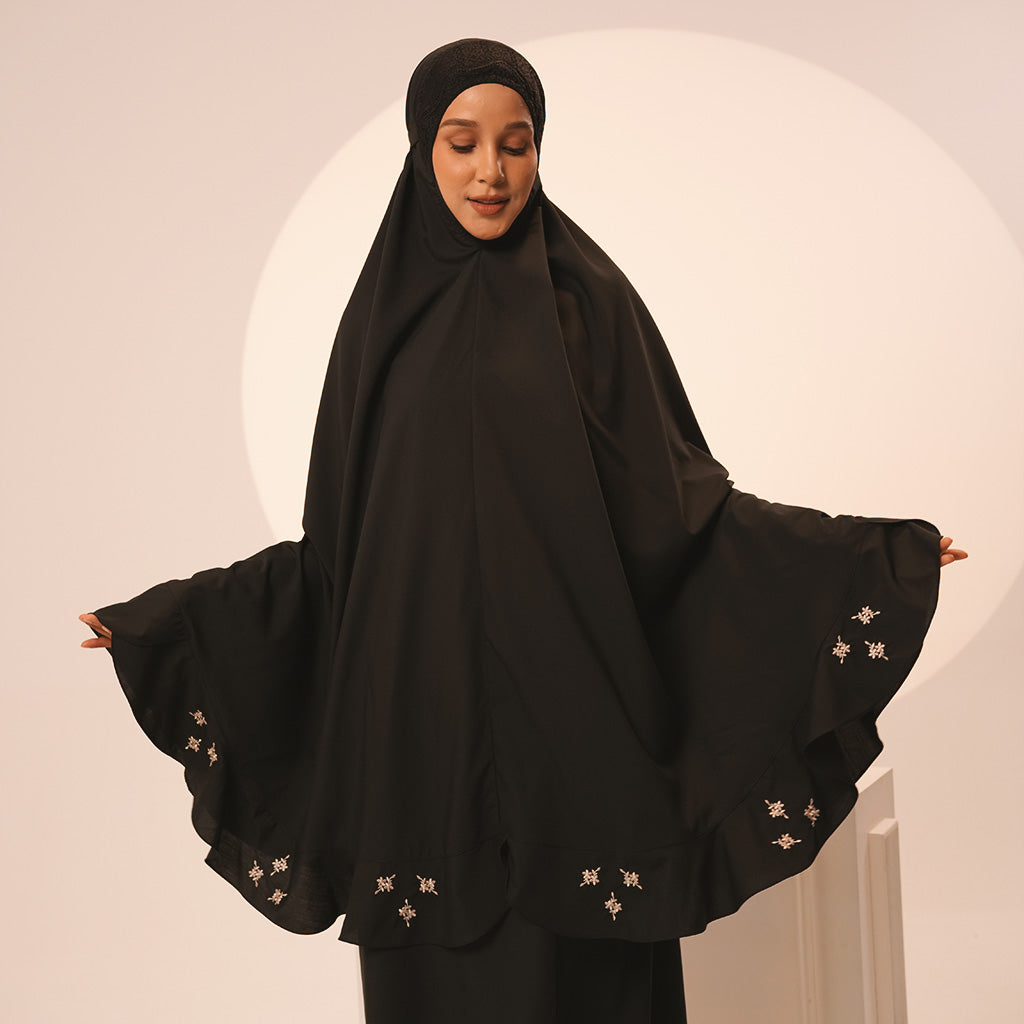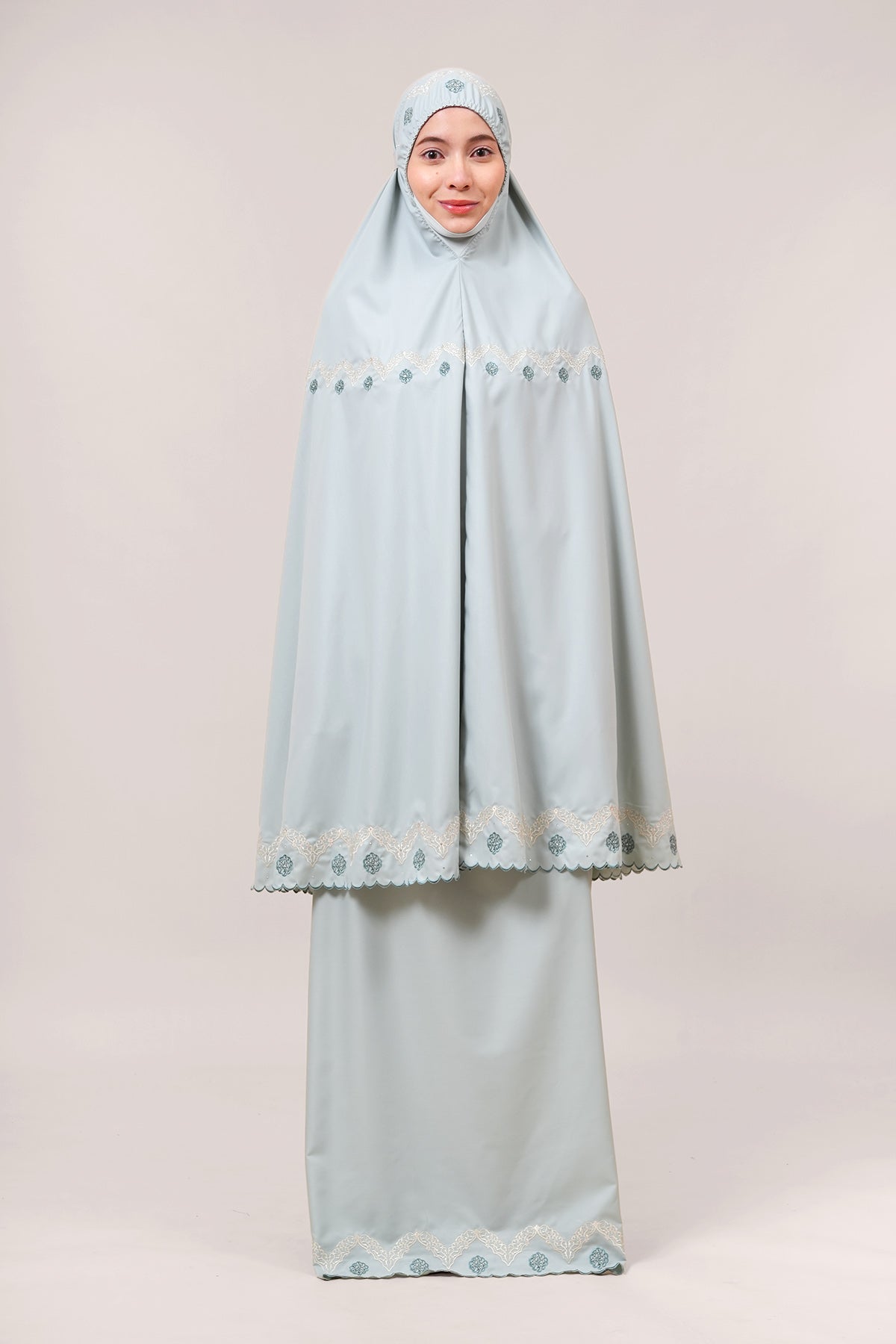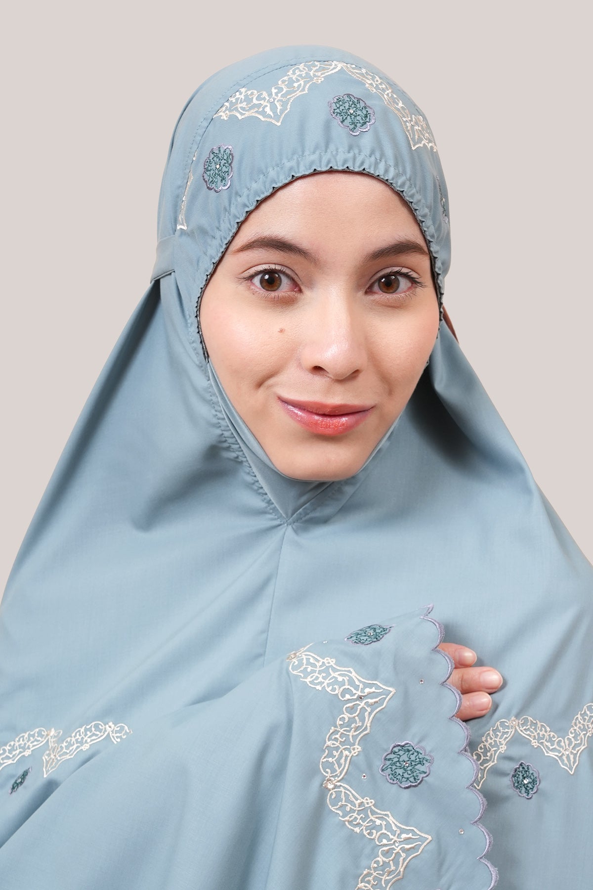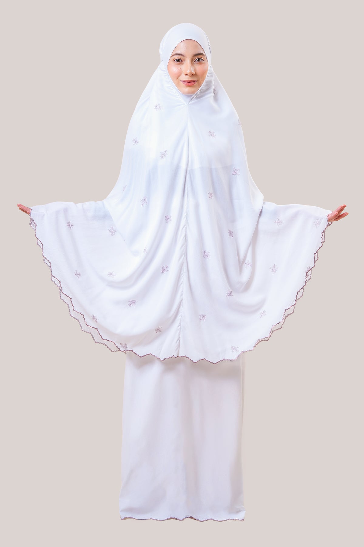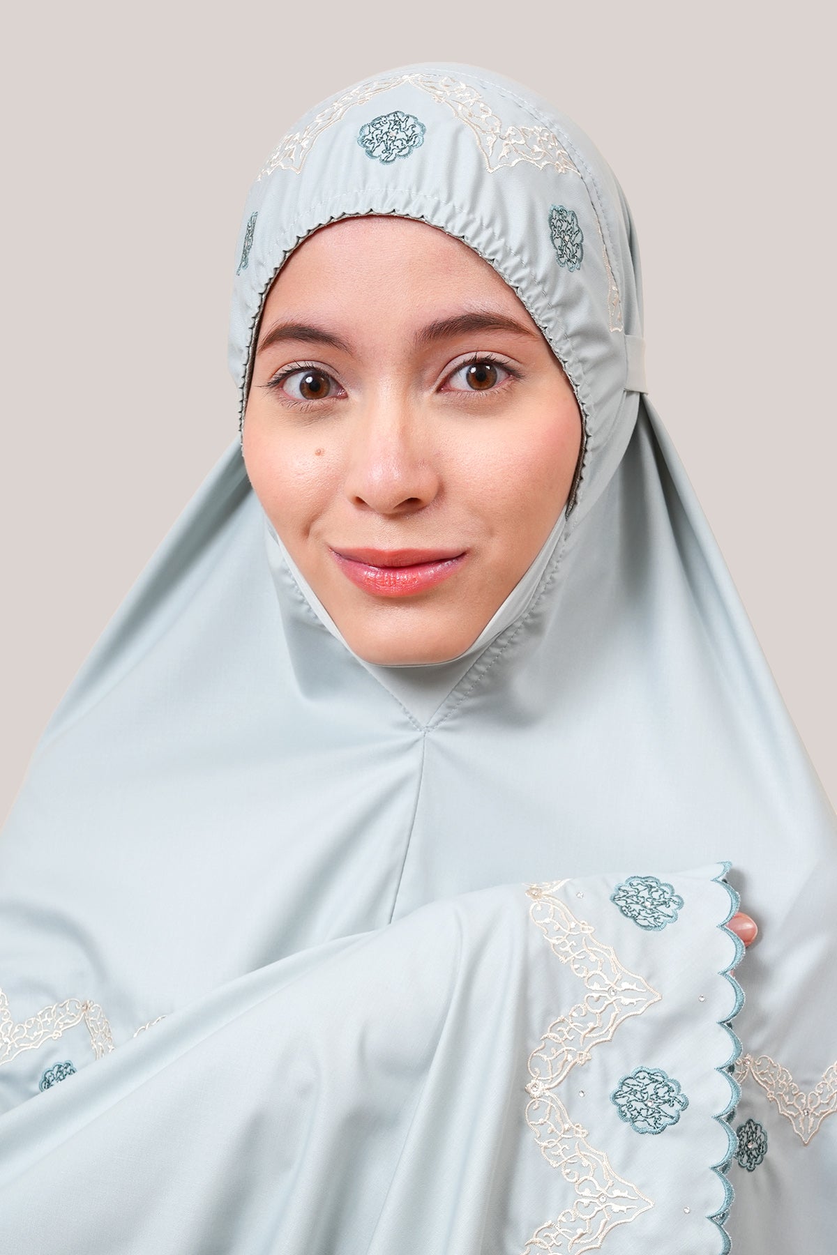 Beyond a telekung, Broderie Rania expresses modest elegance. The delicate embroidery, raised running-stitch petals, and crystal accents make it a prayerwear that radiates serenity, femininity, and sophistication.