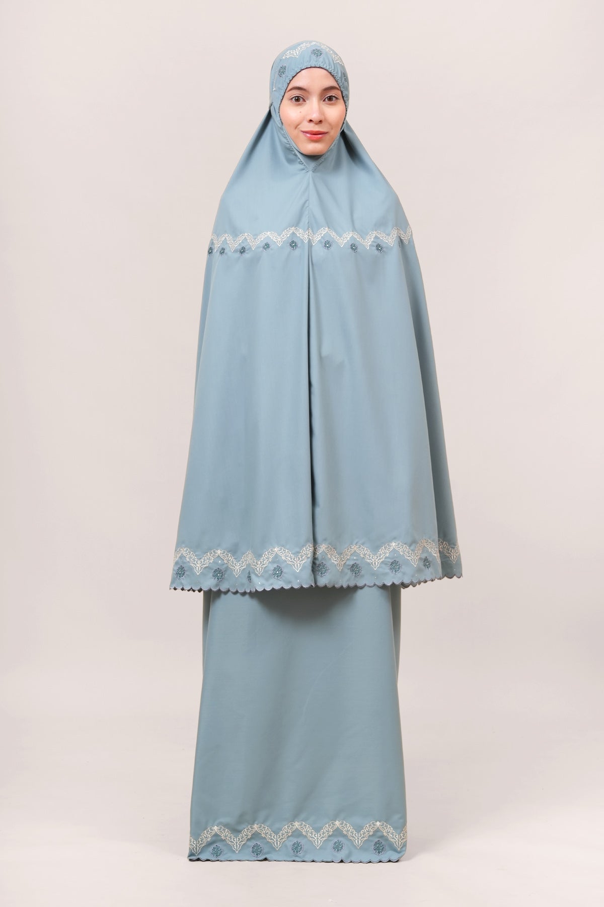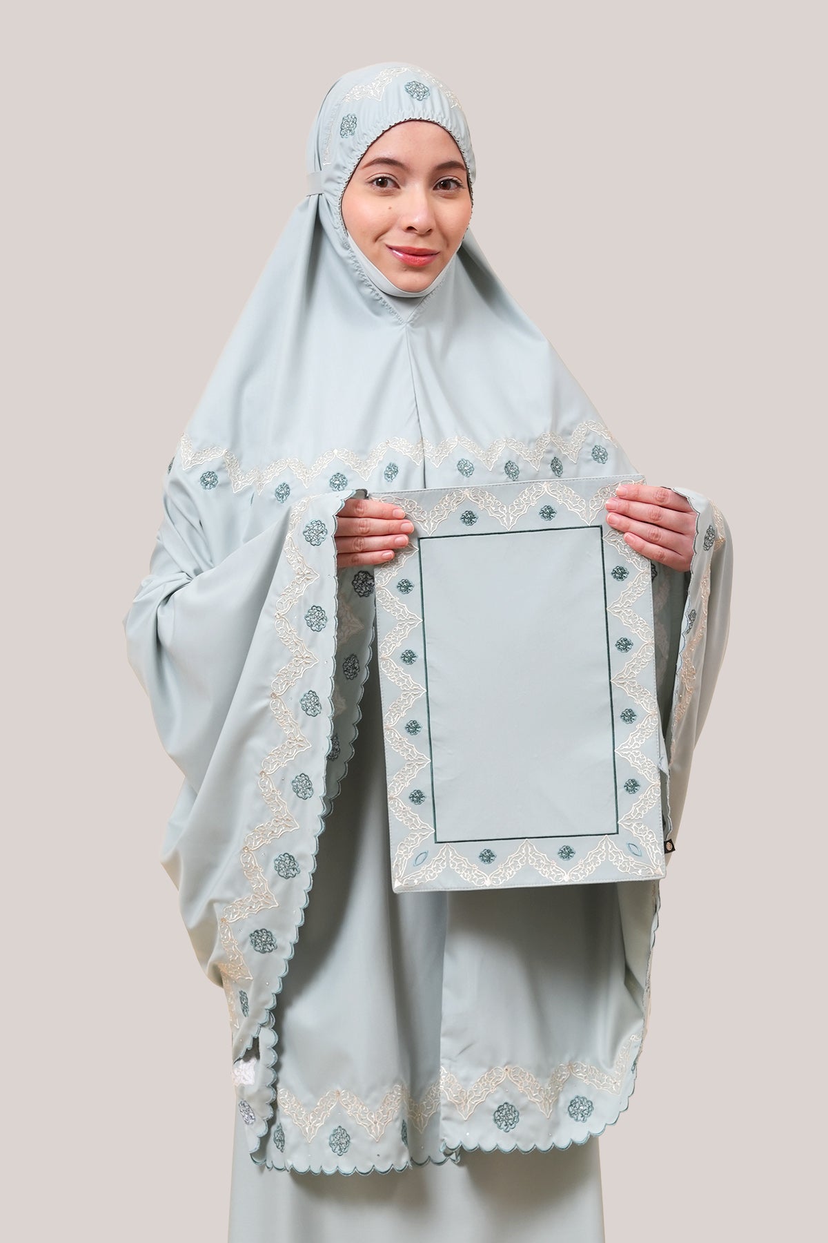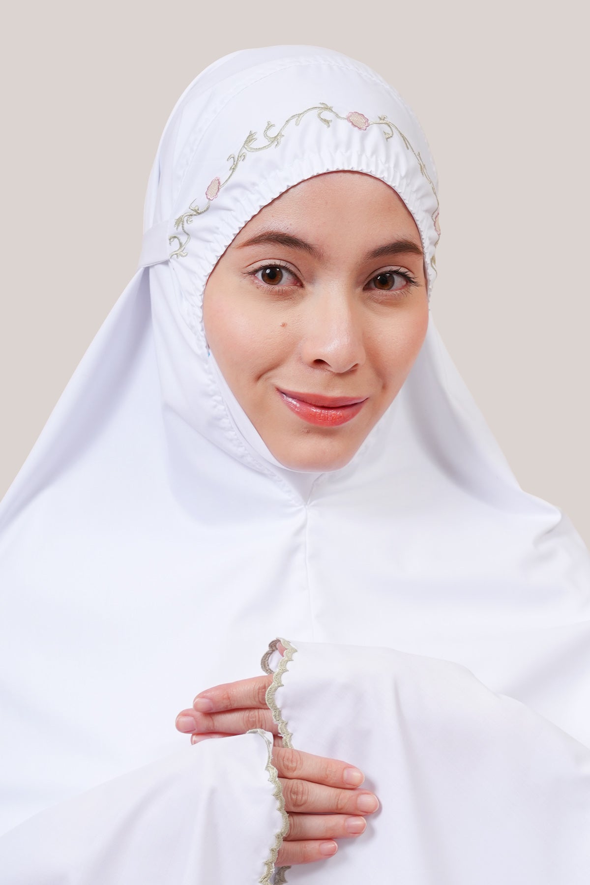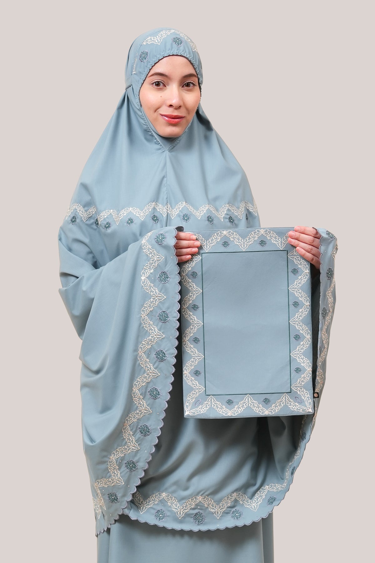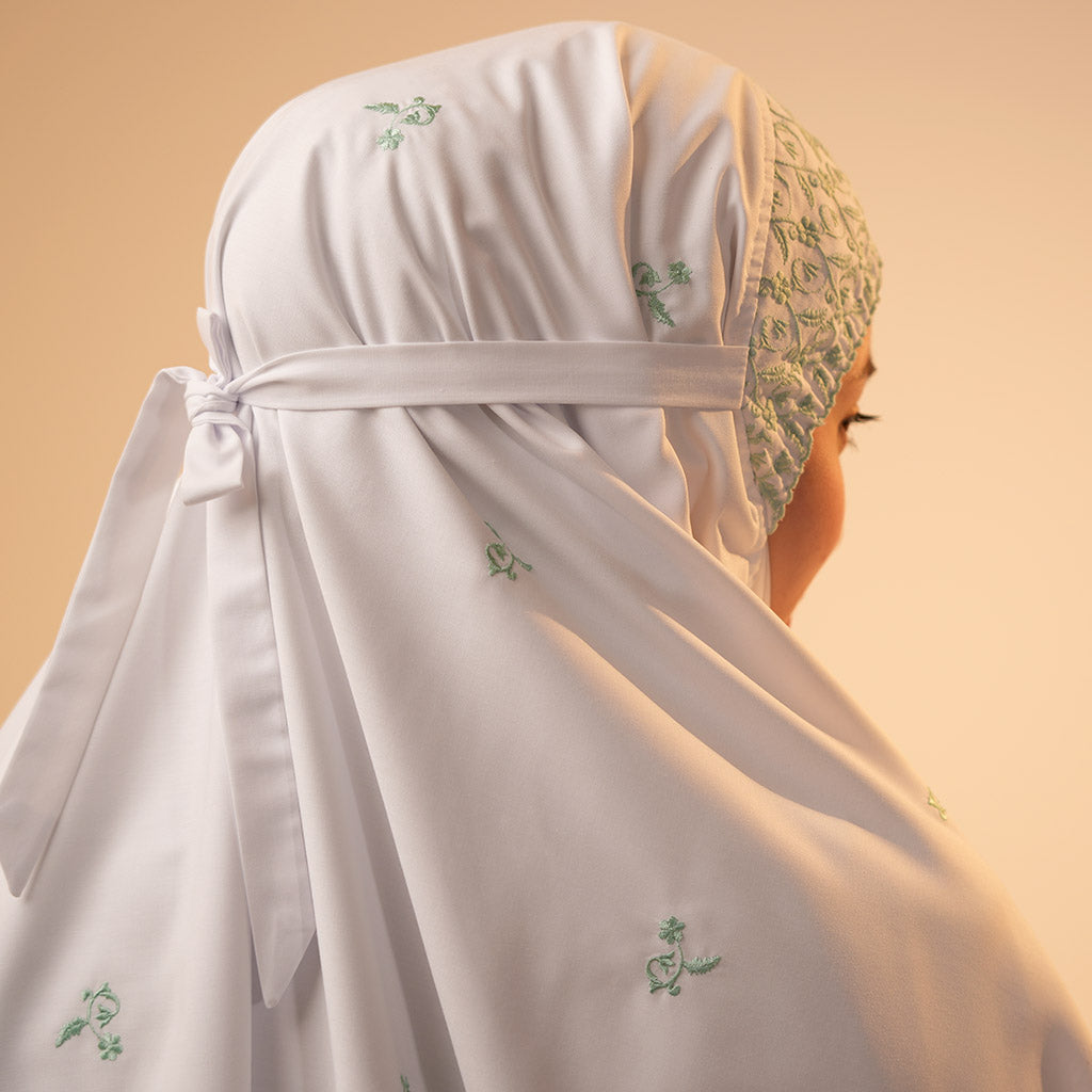 Beyond a telekung, Broderie Rania expresses modest elegance. The delicate embroidery, raised running-stitch petals, and crystal accents make it a prayerwear that radiates serenity, femininity, and sophistication.
