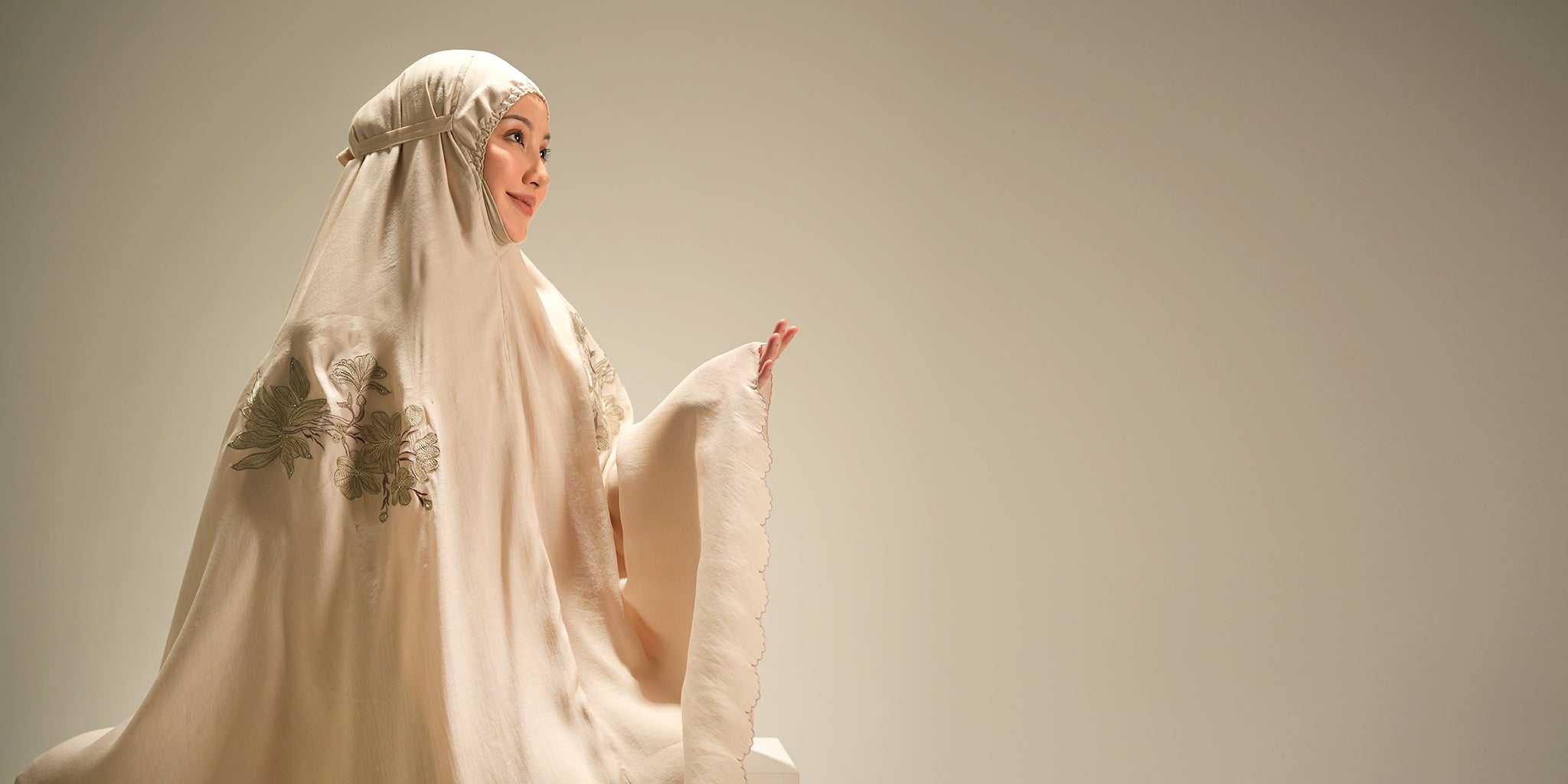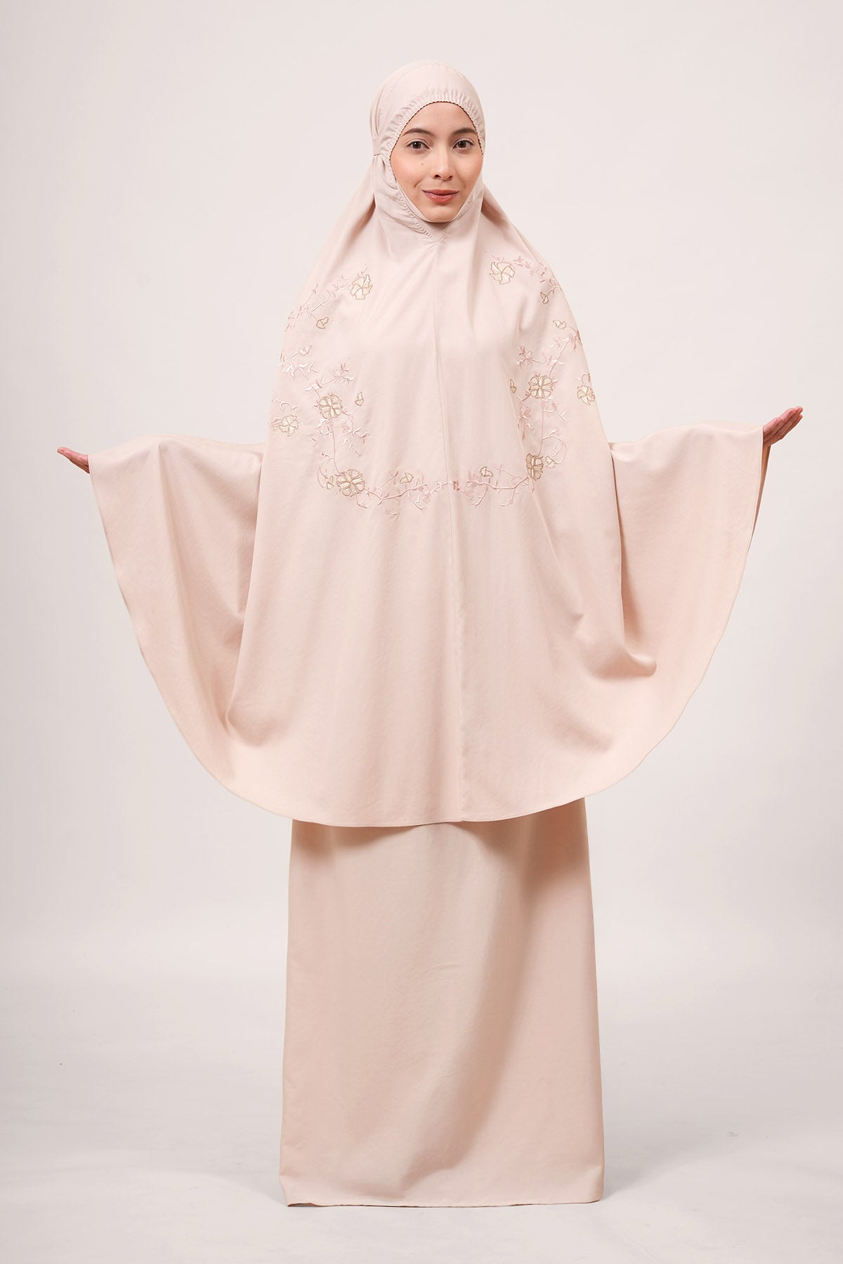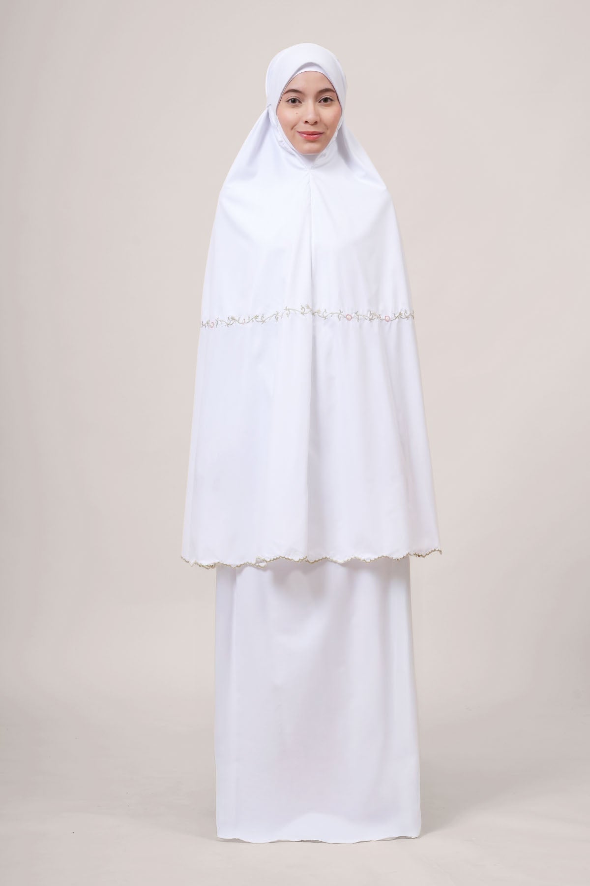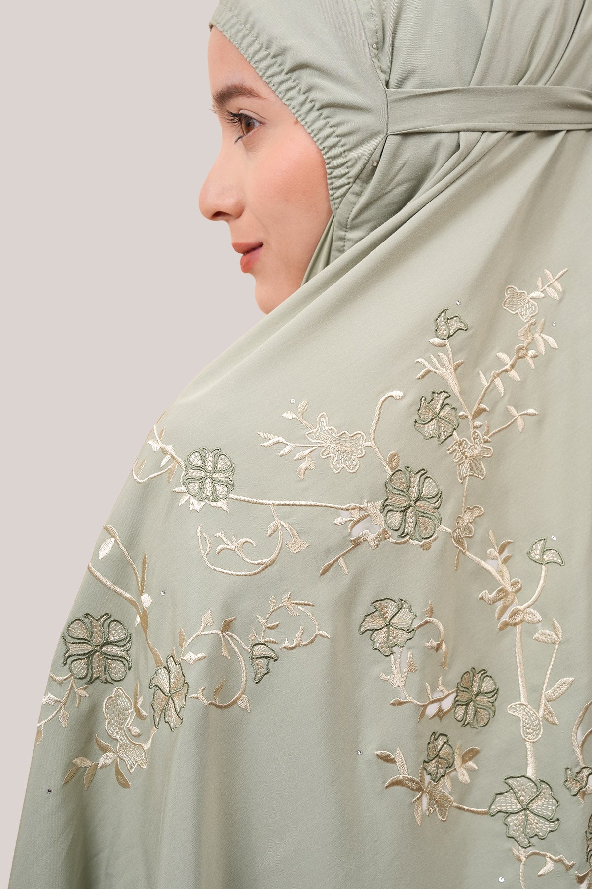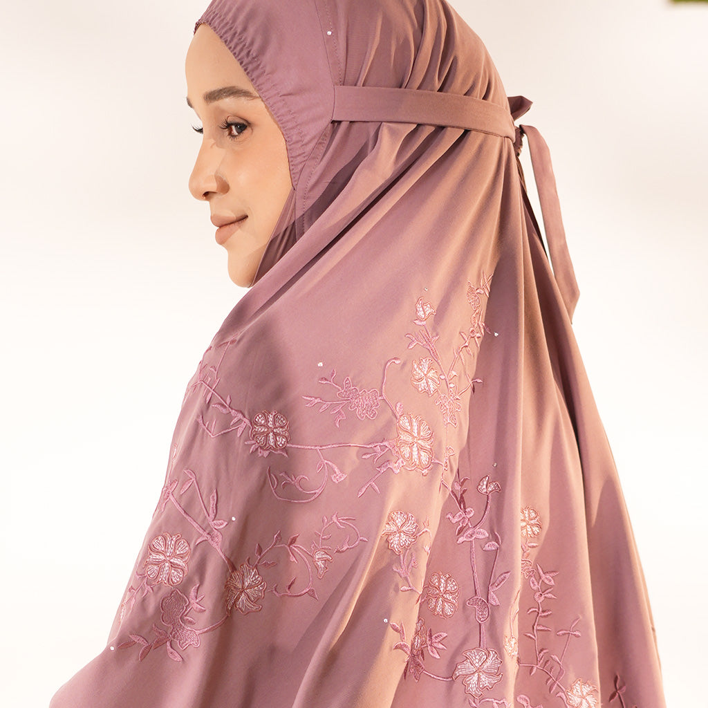 Beyond a telekung, Broderie Rania expresses modest elegance. The delicate embroidery, raised running-stitch petals, and crystal accents make it a prayerwear that radiates serenity, femininity, and sophistication.