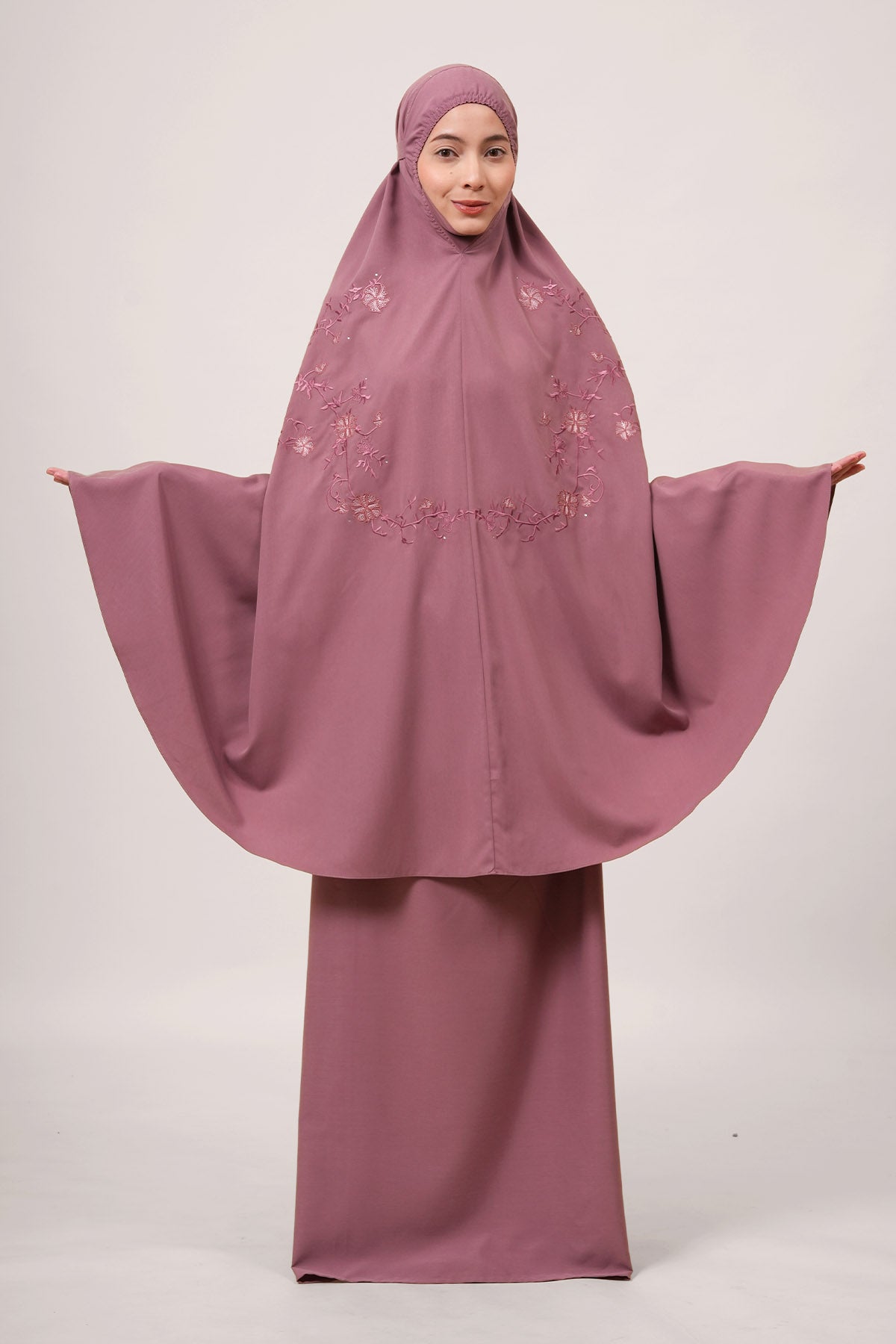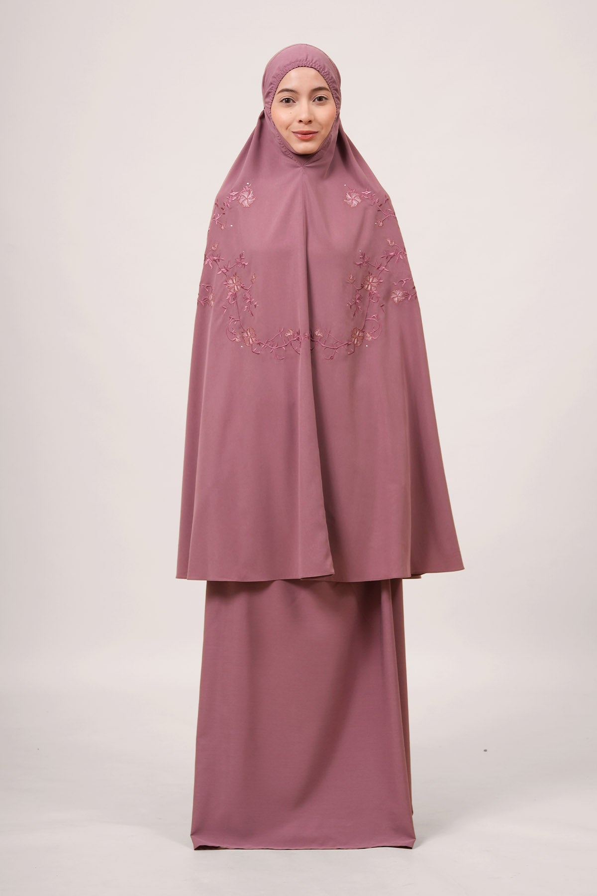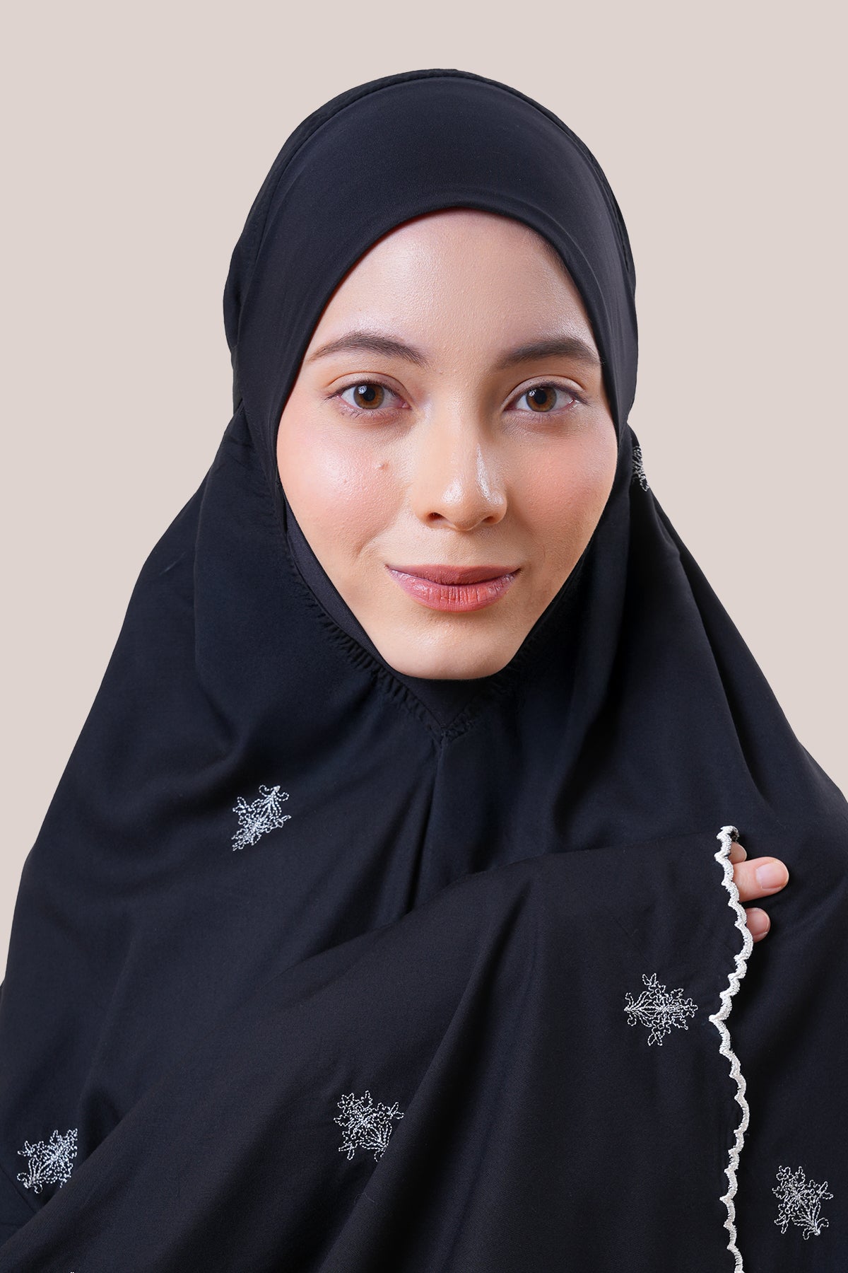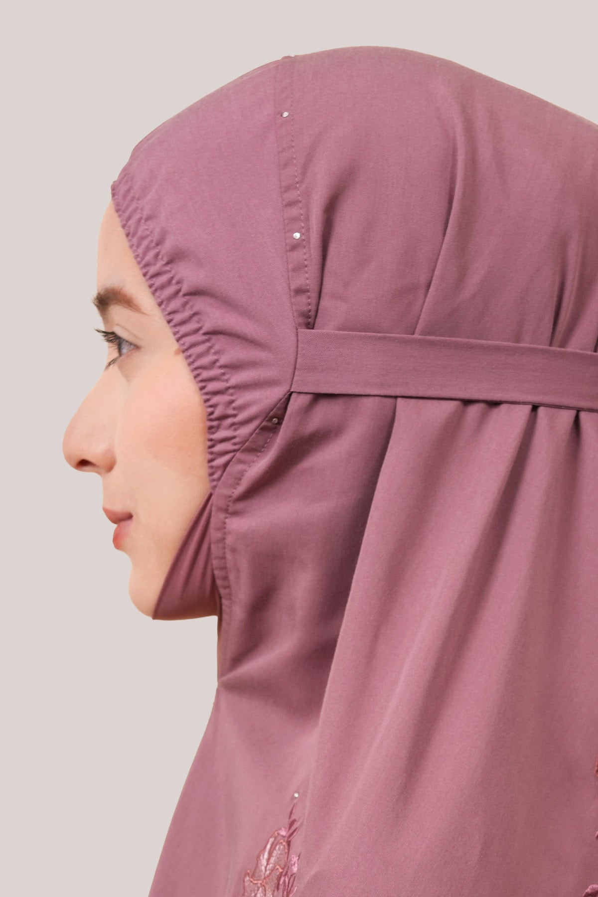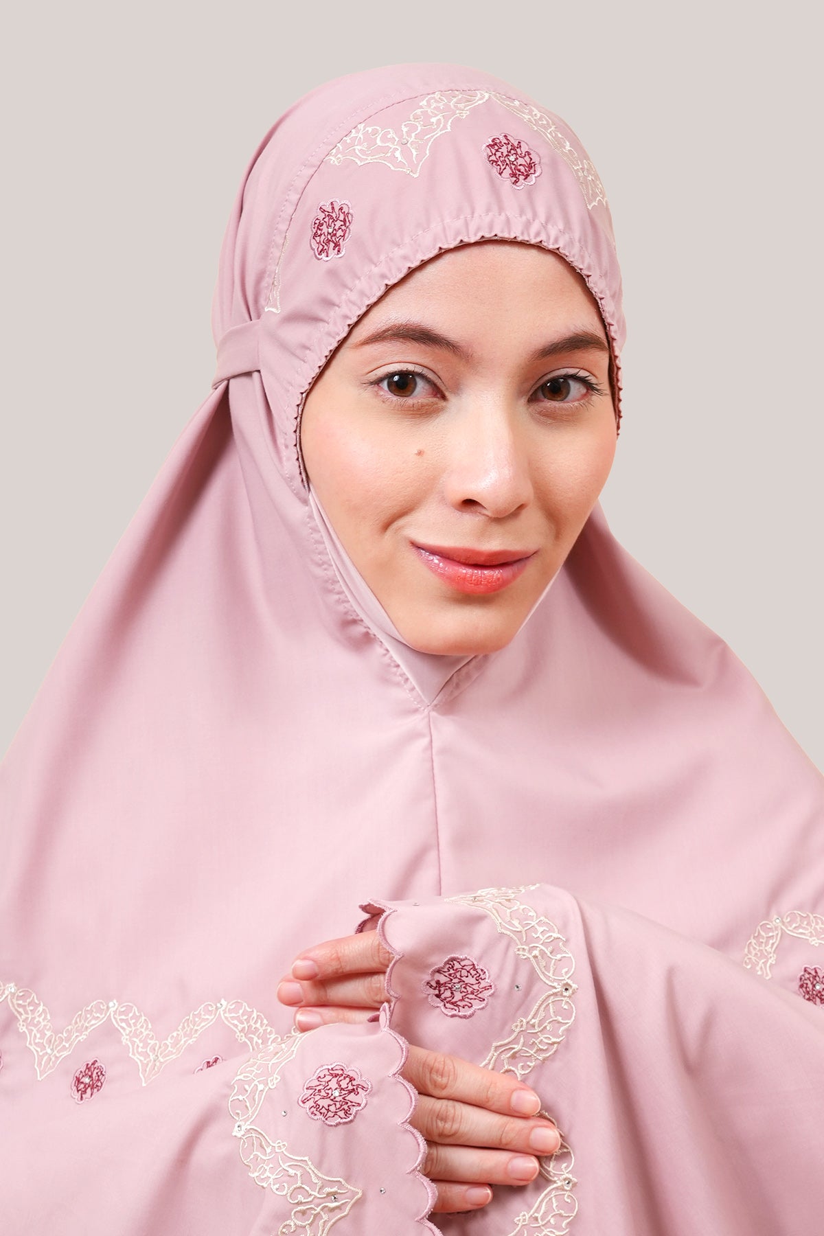 Beyond a telekung, Broderie Rania expresses modest elegance. The delicate embroidery, raised running-stitch petals, and crystal accents make it a prayerwear that radiates serenity, femininity, and sophistication.