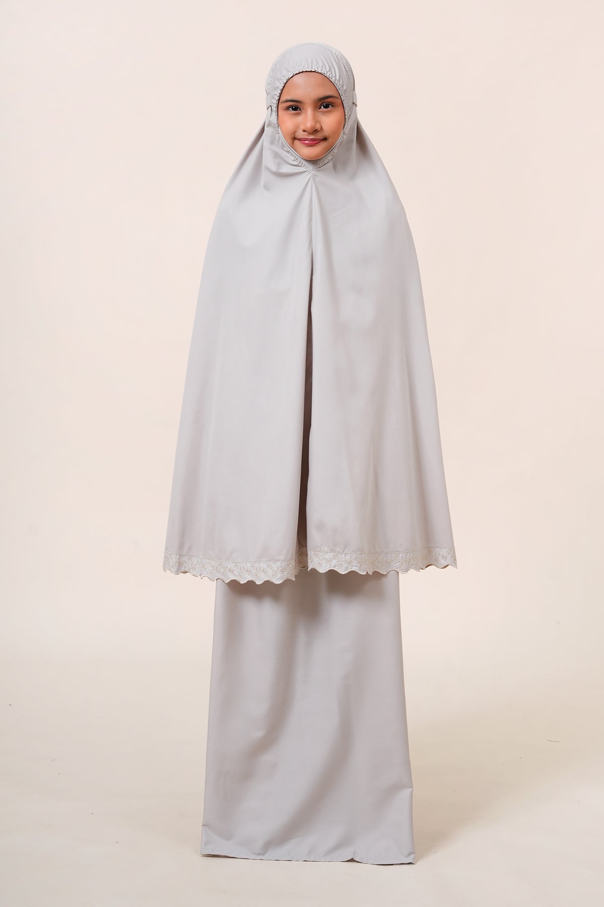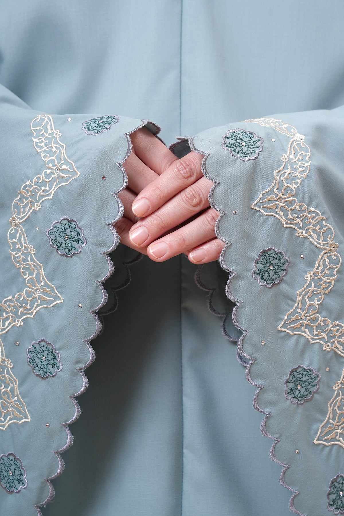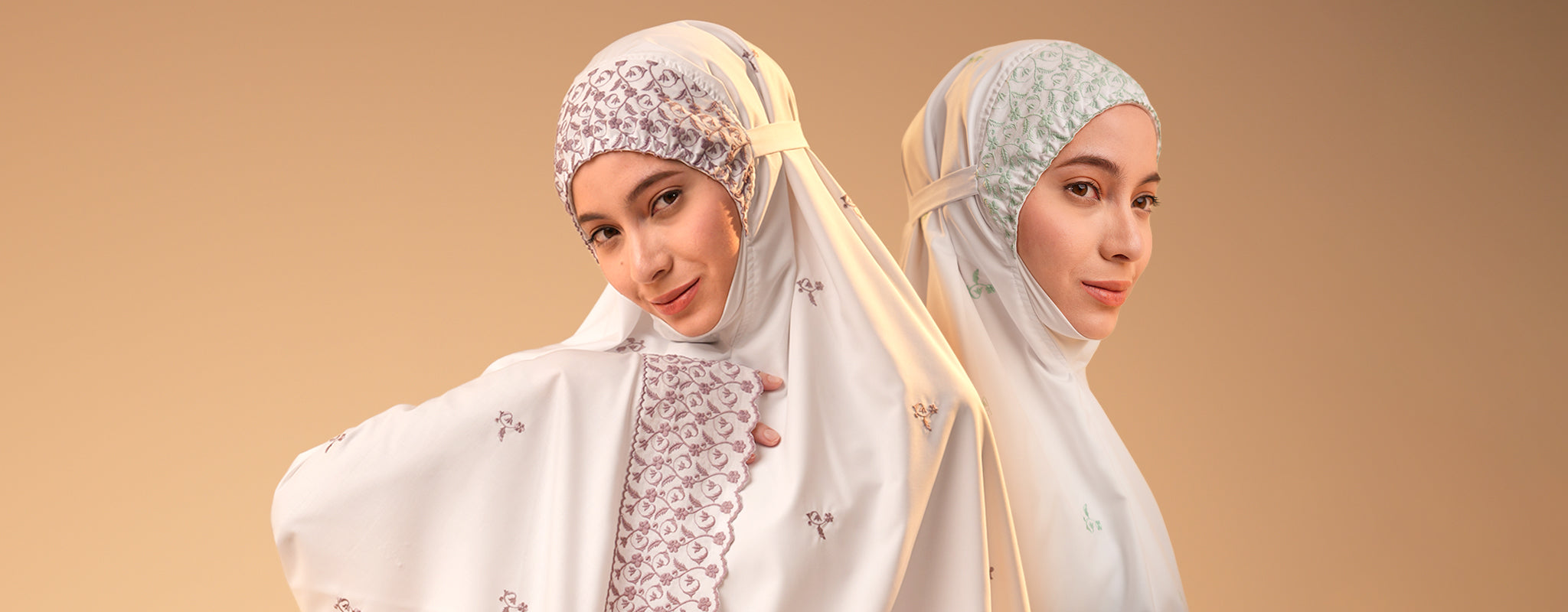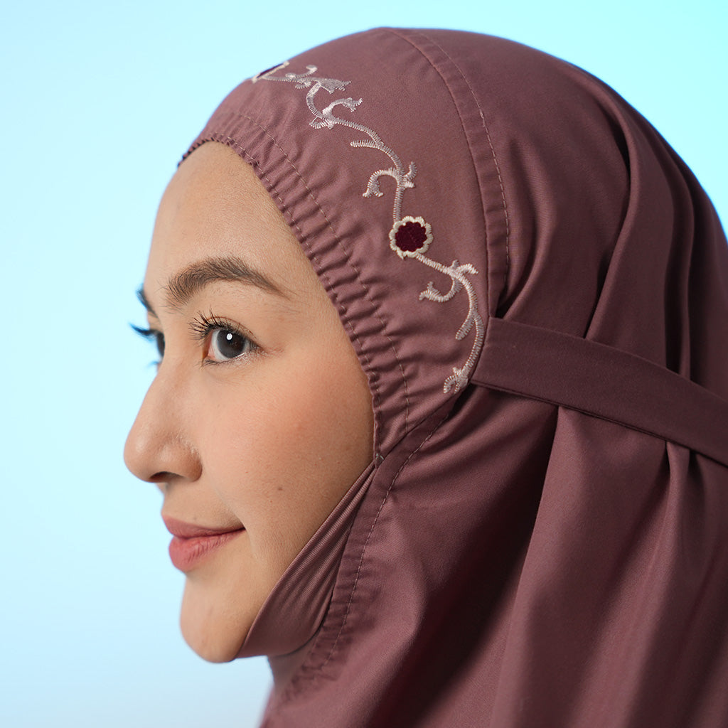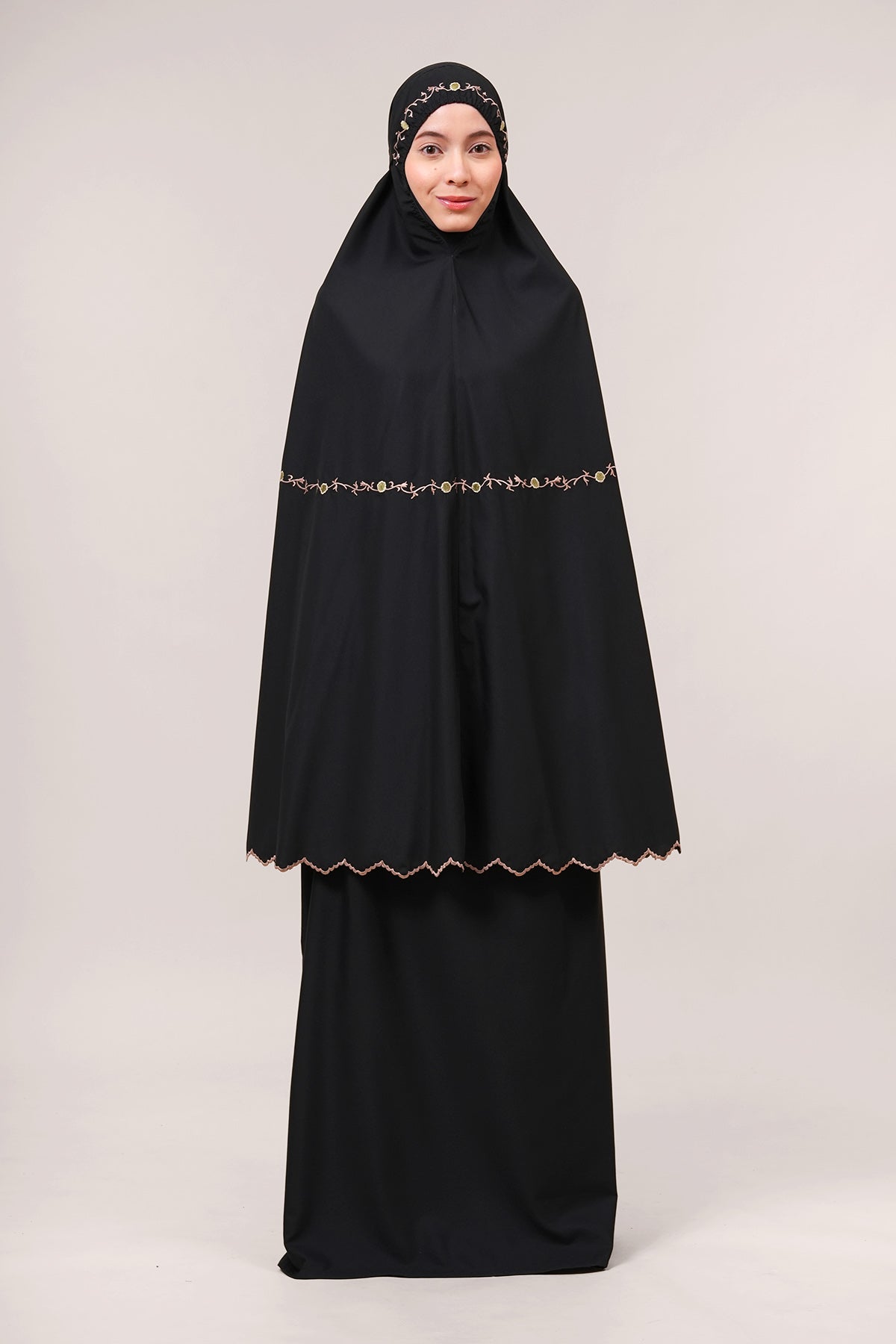 Beyond a telekung, Broderie Rania expresses modest elegance. The delicate embroidery, raised running-stitch petals, and crystal accents make it a prayerwear that radiates serenity, femininity, and sophistication.