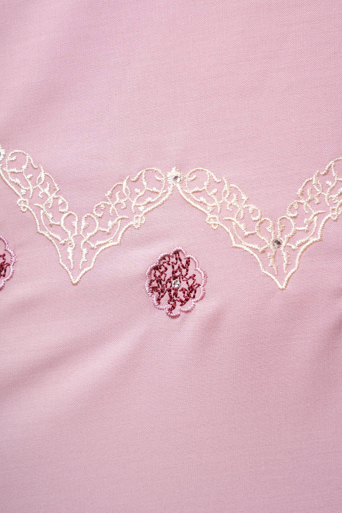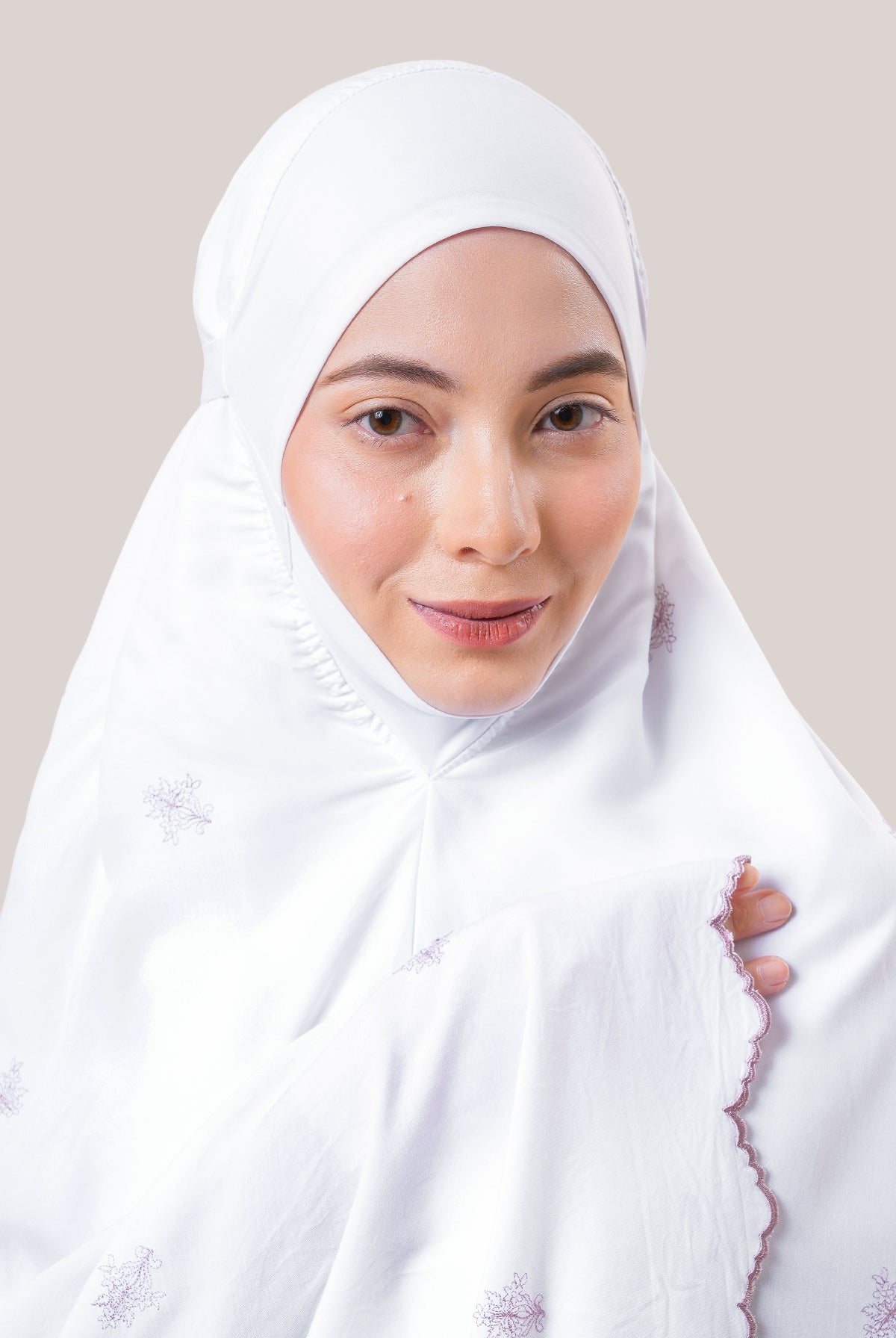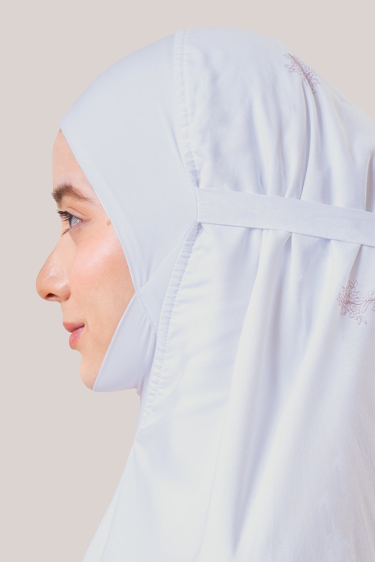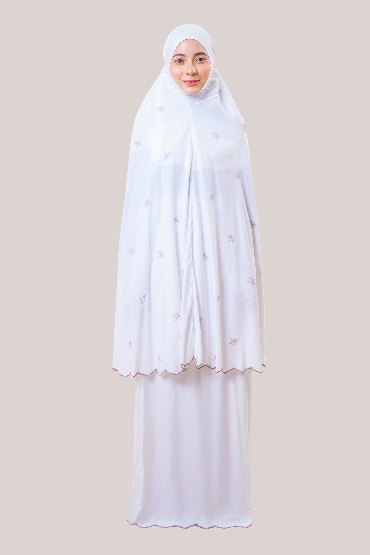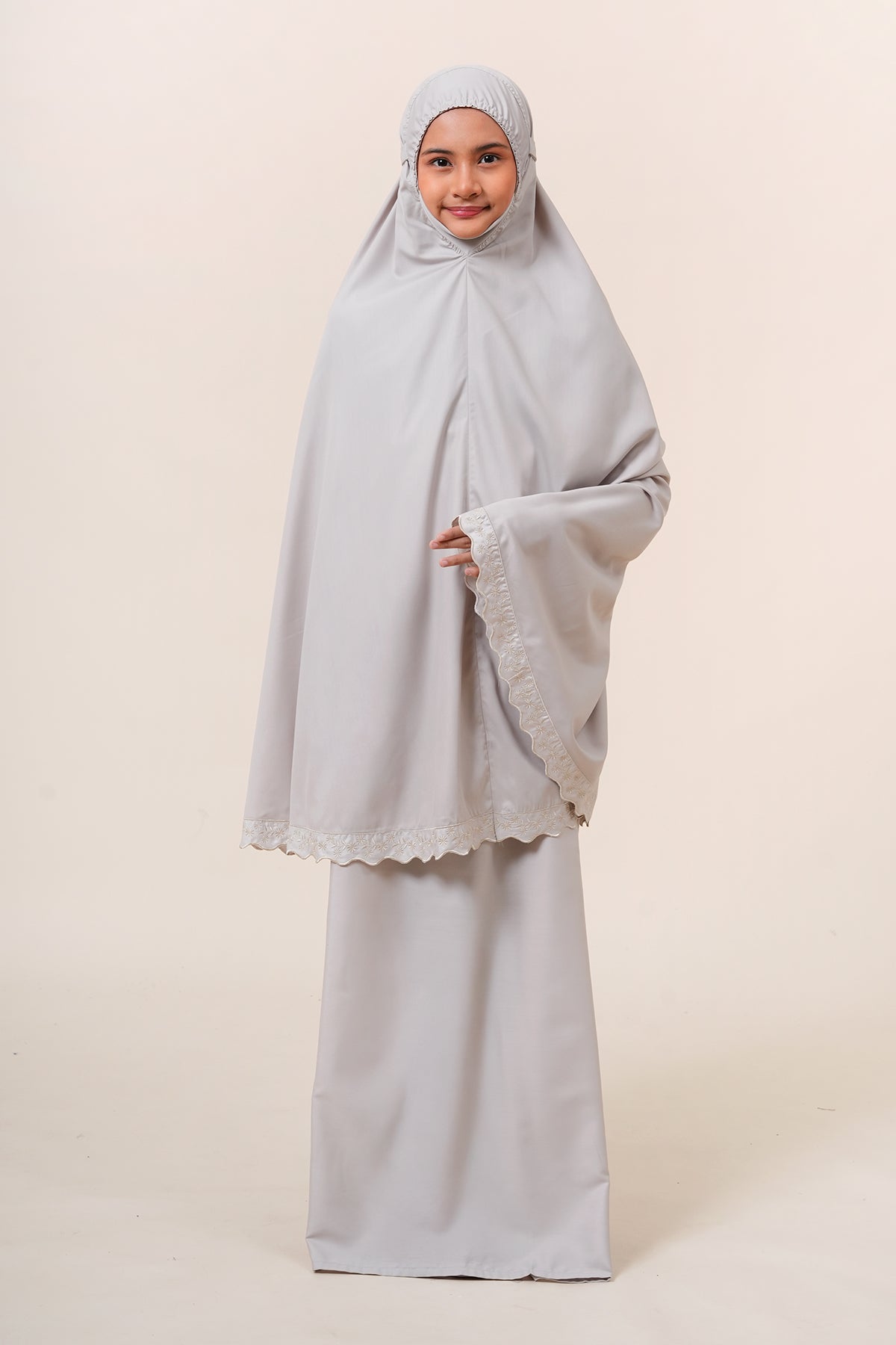 Beyond a telekung, Broderie Rania expresses modest elegance. The delicate embroidery, raised running-stitch petals, and crystal accents make it a prayerwear that radiates serenity, femininity, and sophistication.