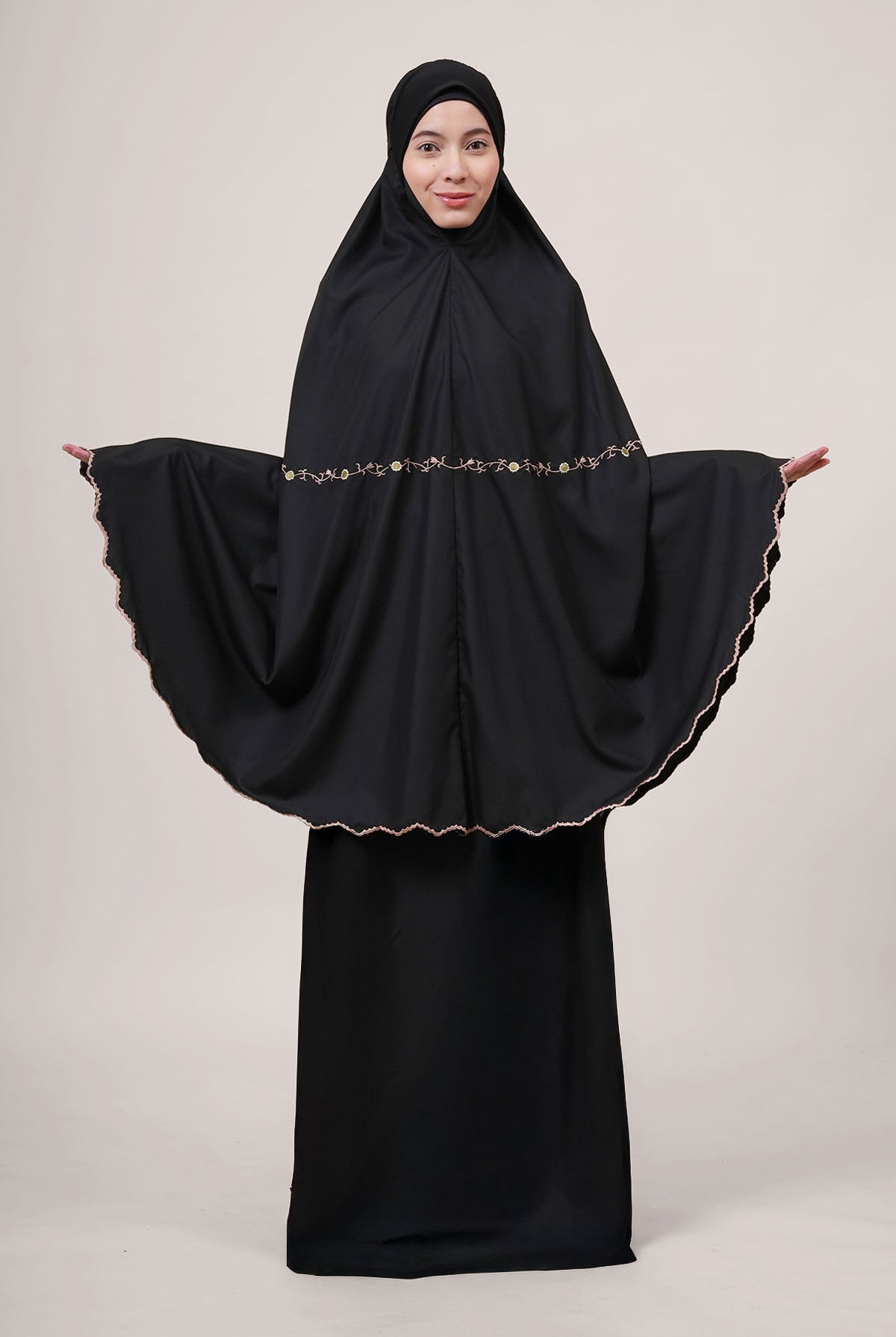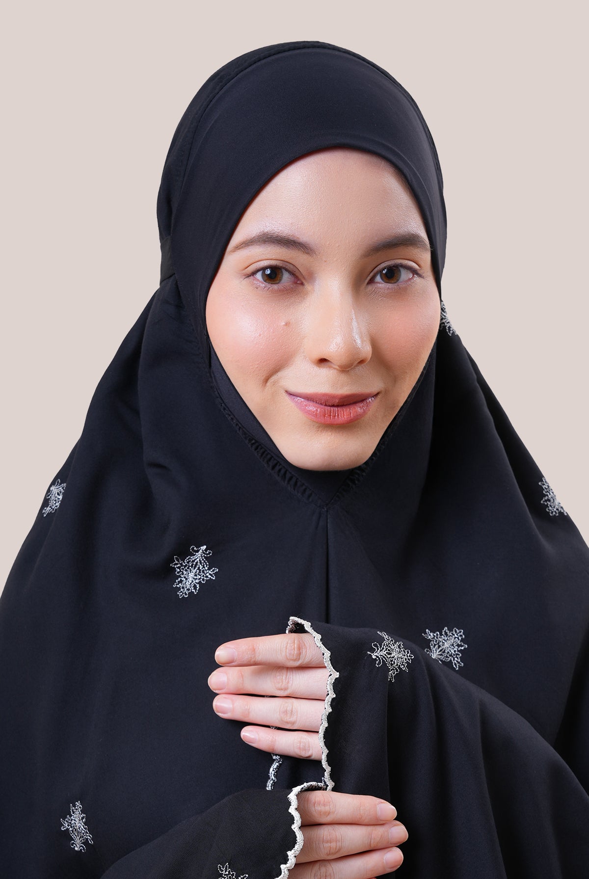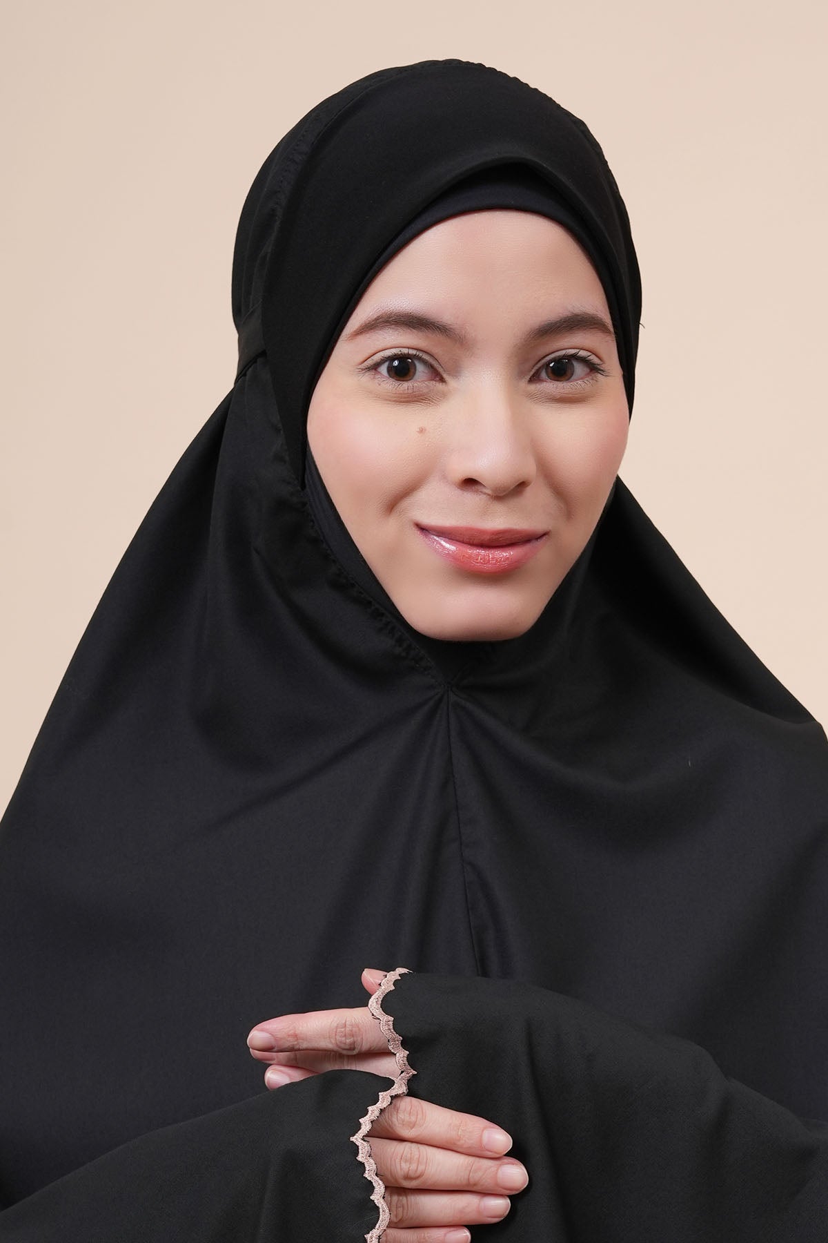 The Broderie Madiha is designed for women who value both refined beauty and thoughtful functionality. Made from cool, breathable rayon for a silky-soft finish - it ensures comfort throughout your prayer moments.