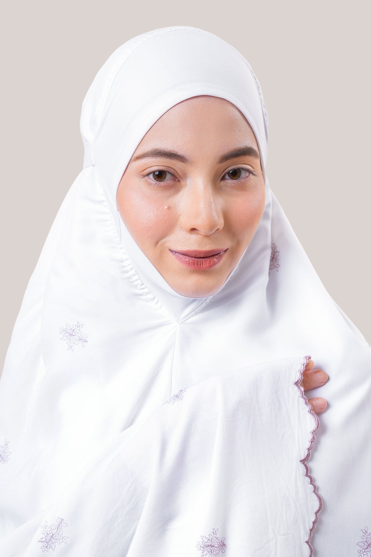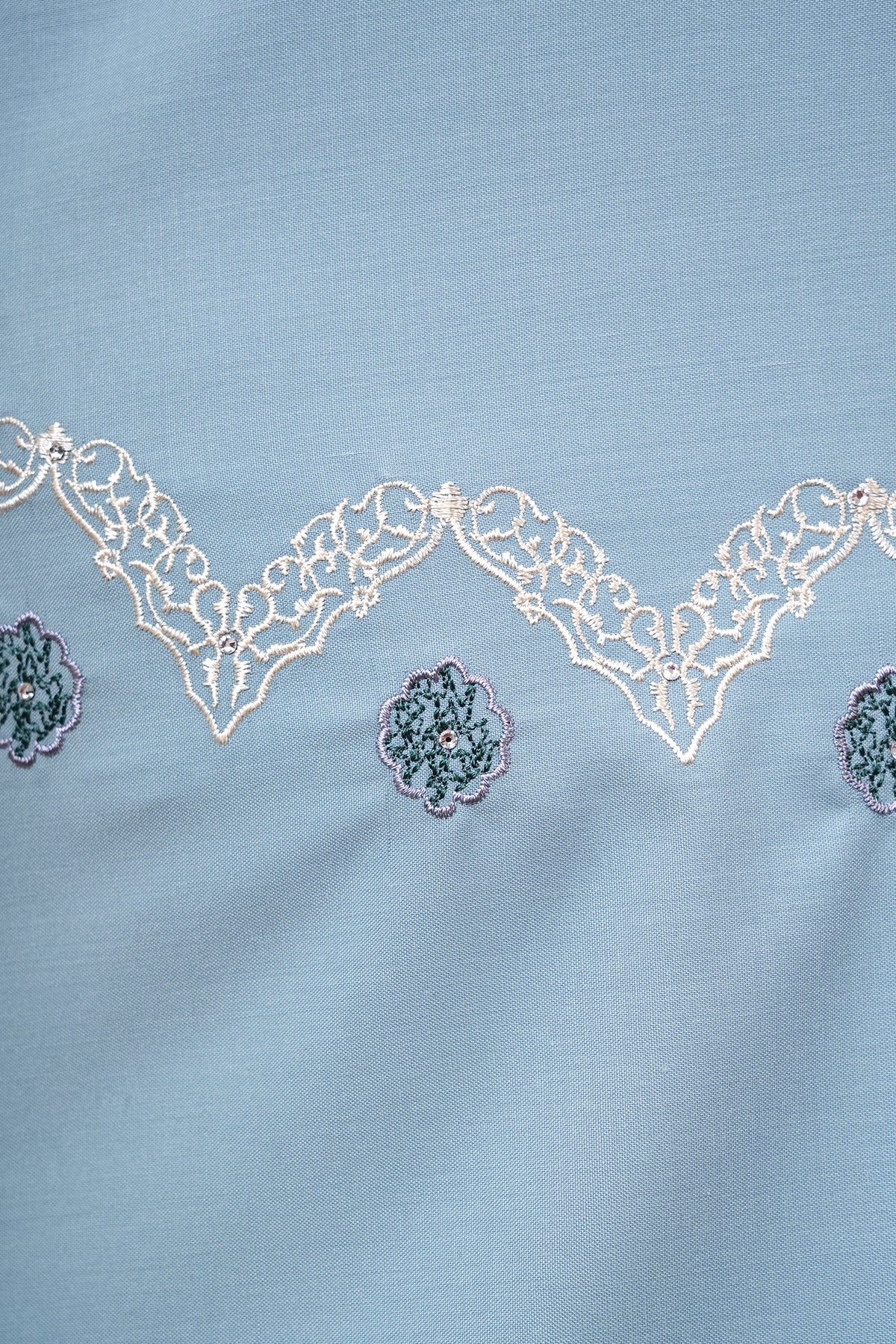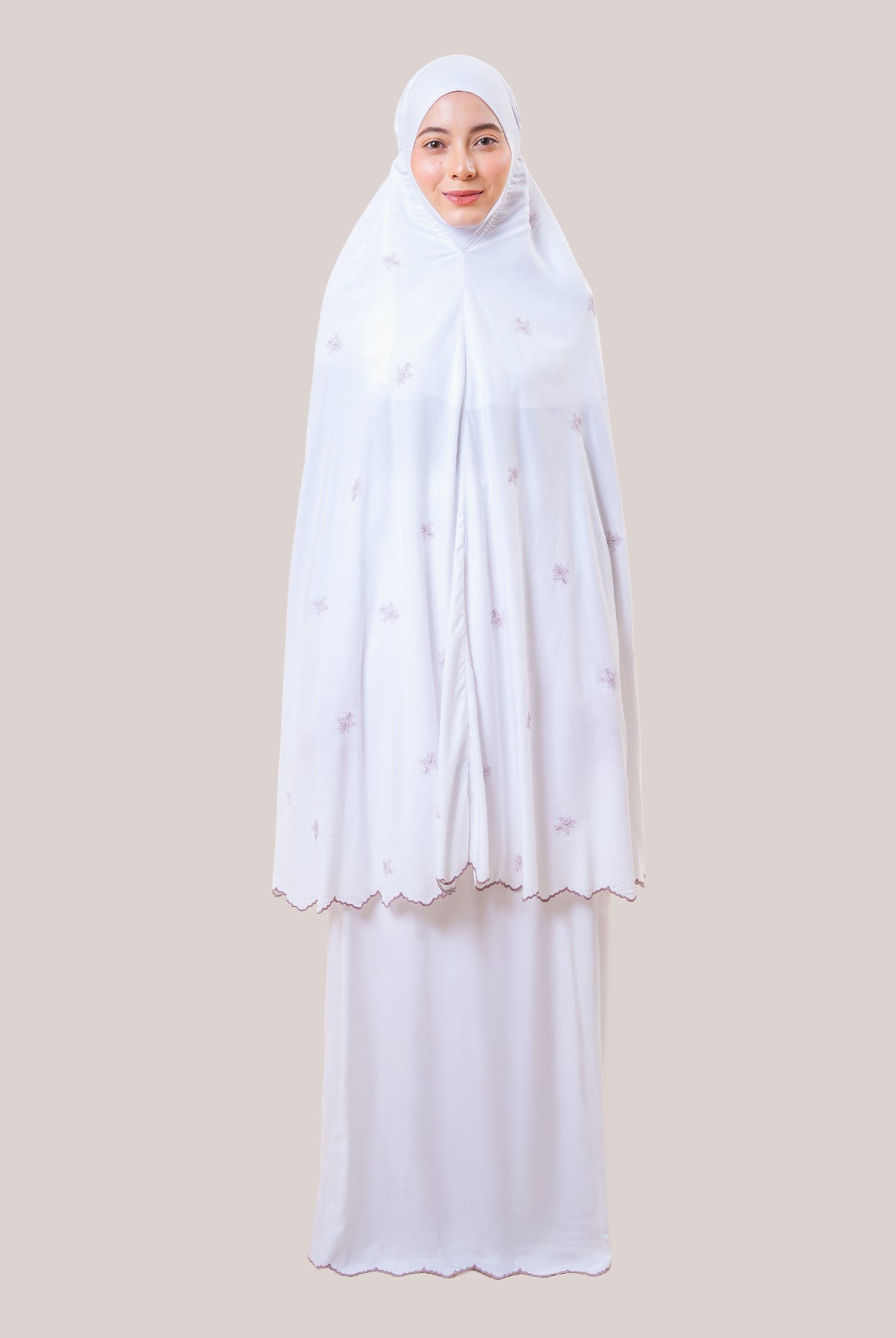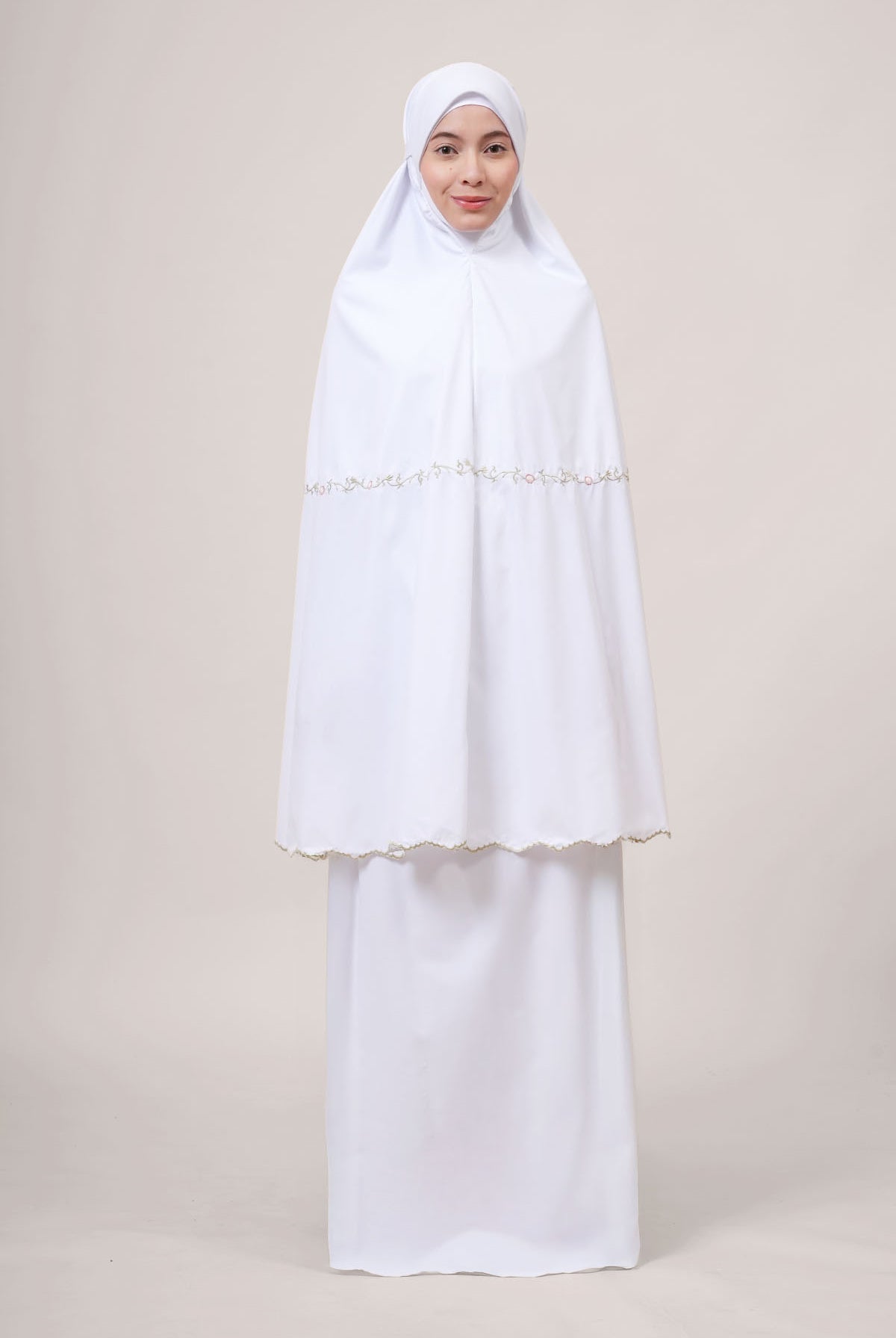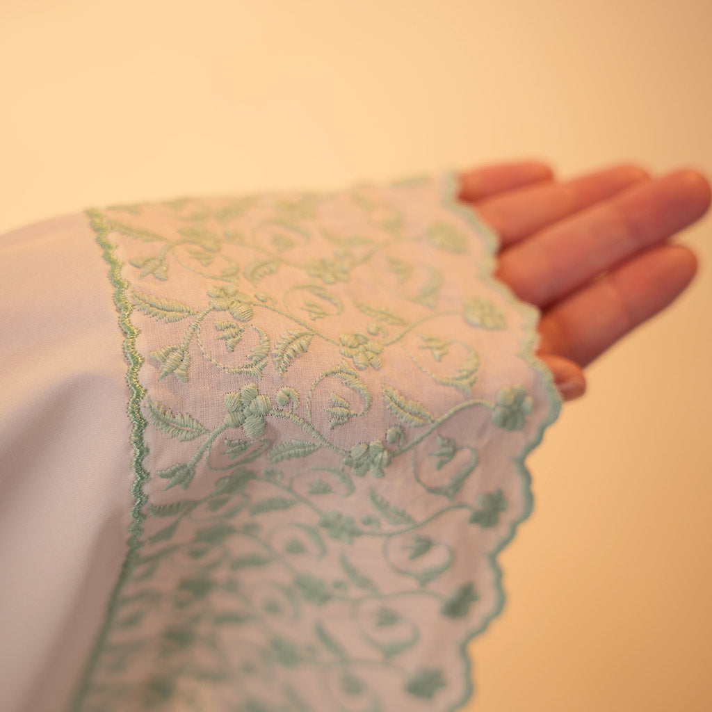 Featuring delicate scattered floral embroidery paired with classic cotton lace detailing, Broderie Sarimas Rona brings a graceful, traditional touch to your daily prayer moments.