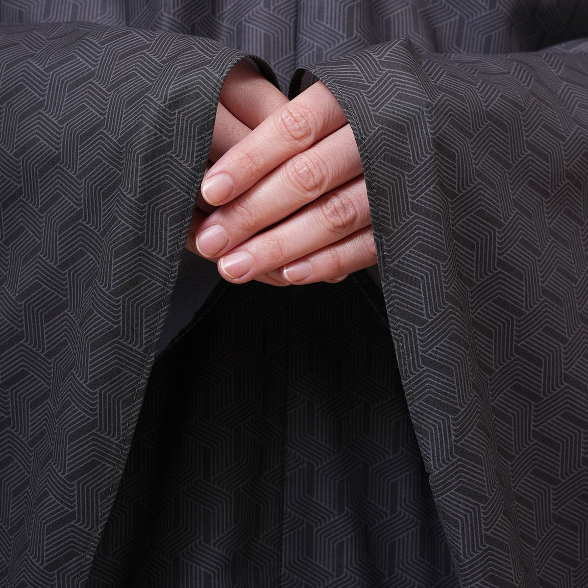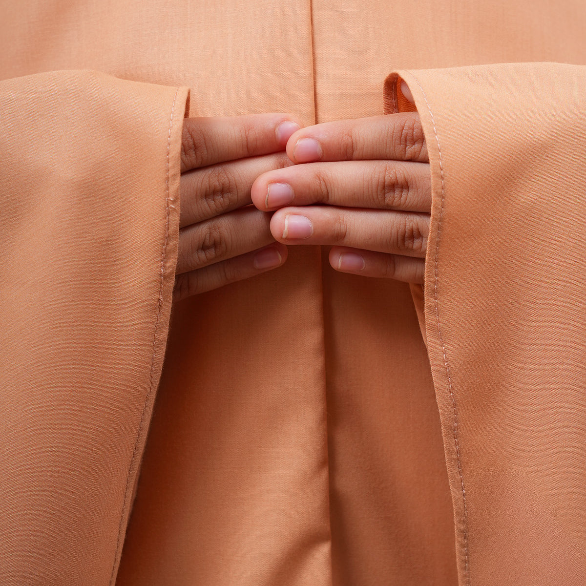 Featuring a minimalist and practical cut with fine baby seam stitching and a slightly curved hem for a subtle drape. Comes complete with a matching pouch and mini prayer mat, made from the same refined fabric.