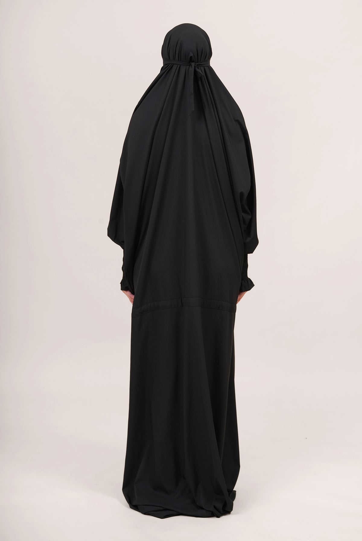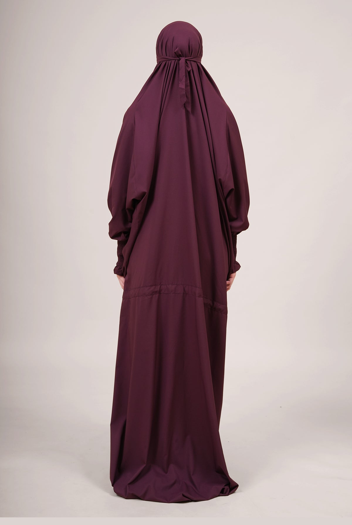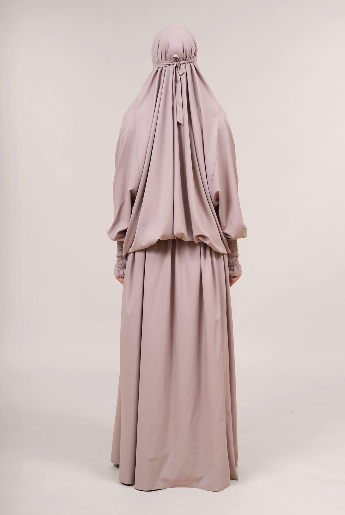 Slip into serenity with the Flair Irha One Piece, featuring a unique jupe-style skirt that adjusts to your height for perfect modesty. The prayer-friendly smocking cuffs ensure ease of movement, while the Khadijah Airy Dobby fabric keeps you cool and comfortable. Finished with a minimal travel bag, it’s your go-to for prayers at the office, while traveling, or anywhere in between.