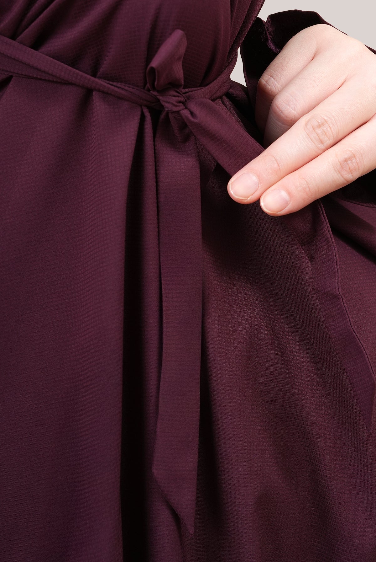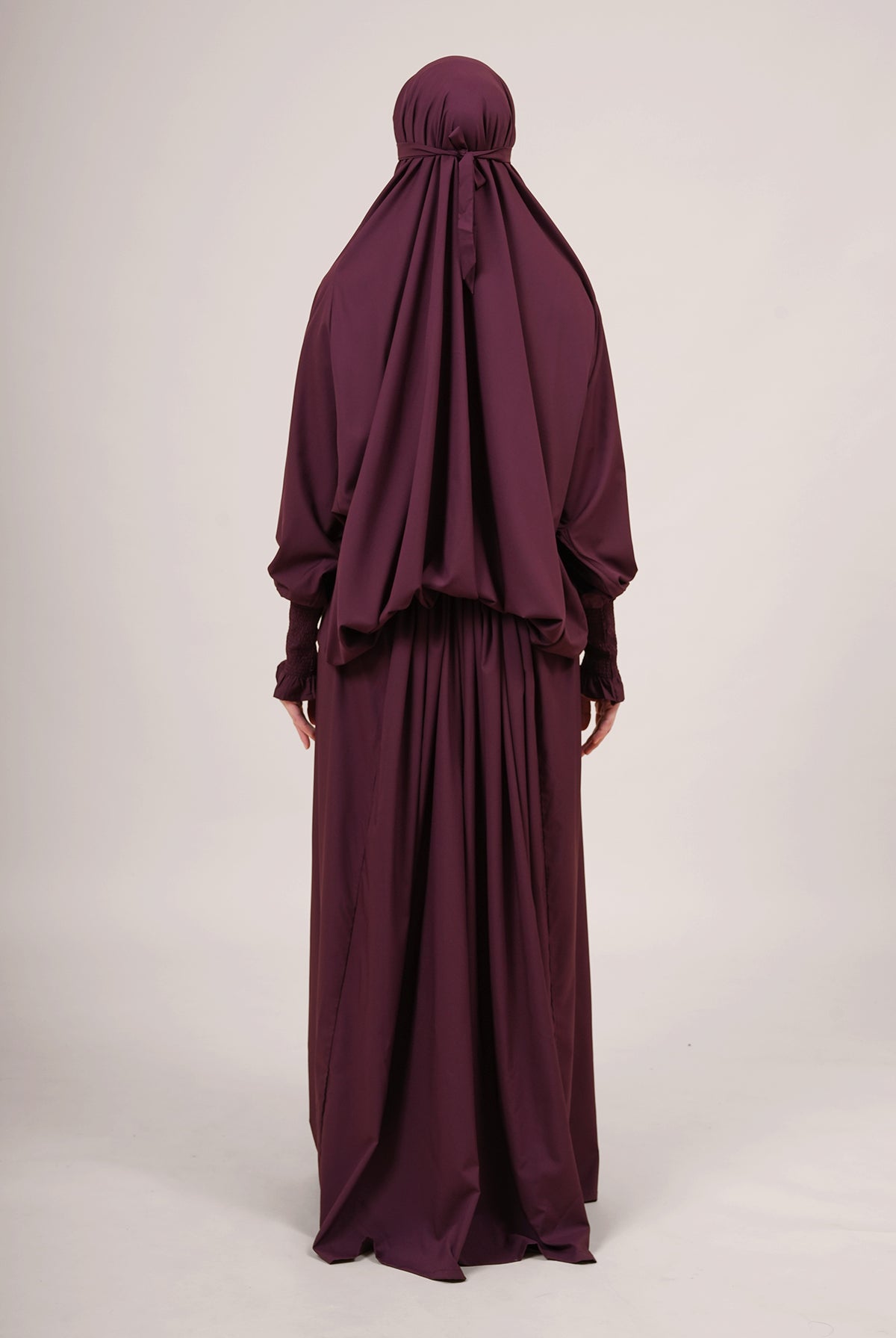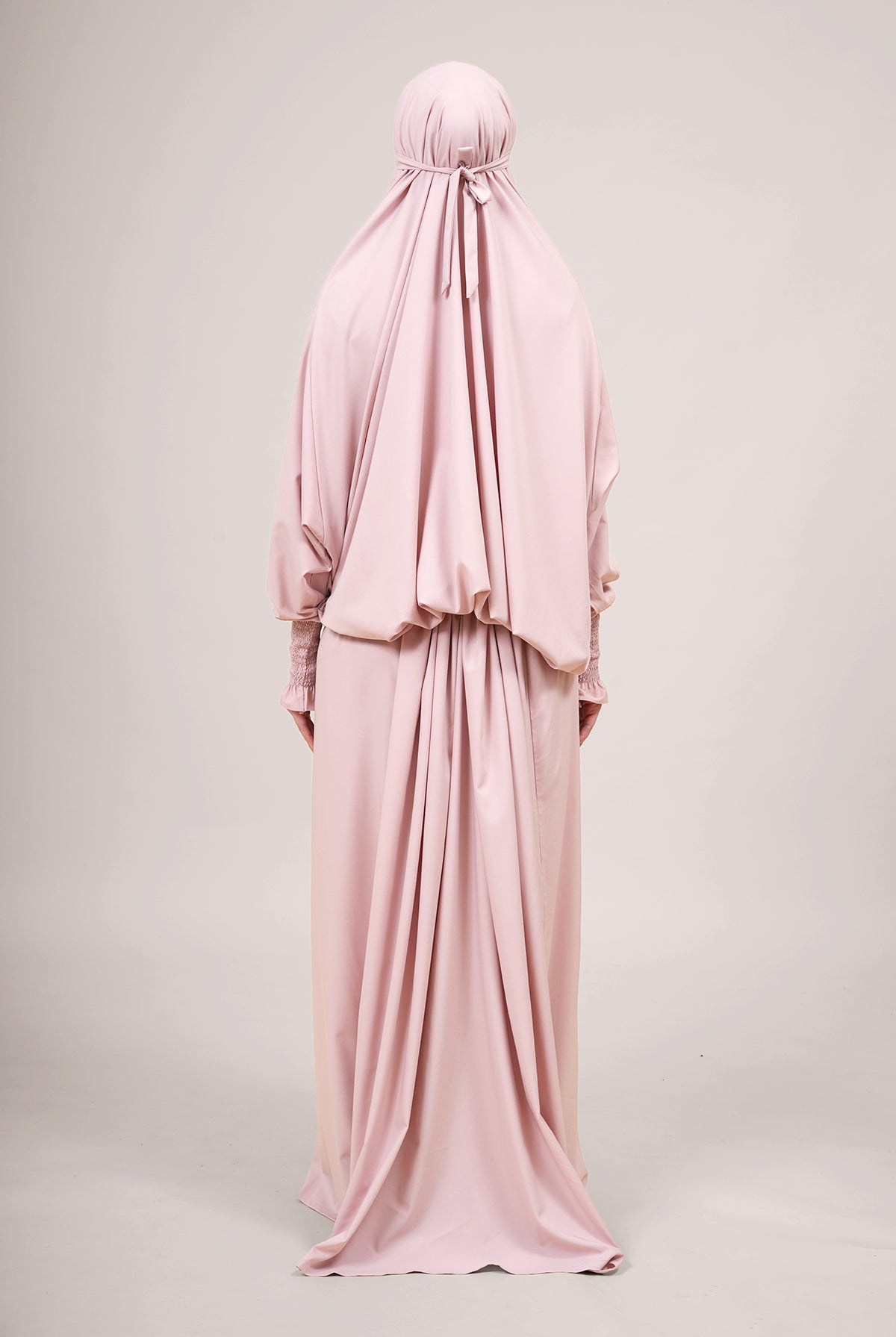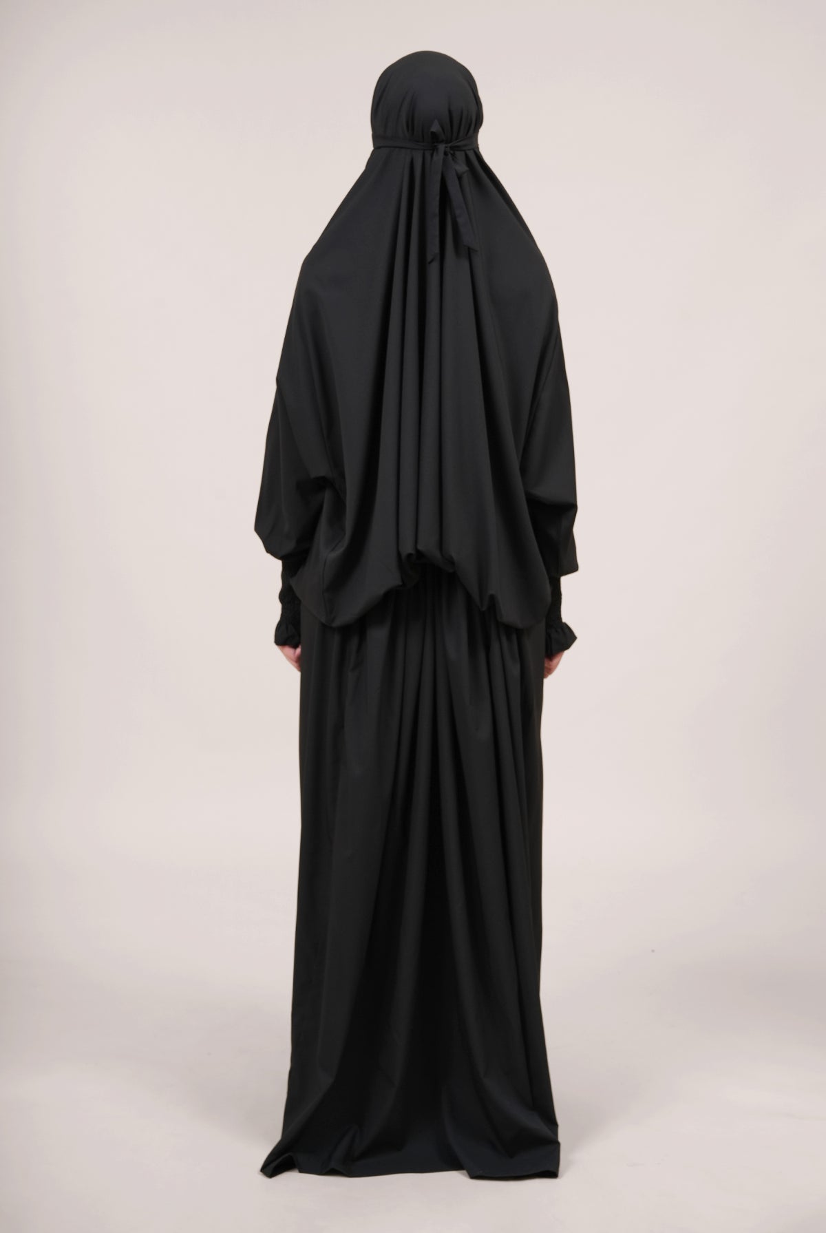 Slip into serenity with the Flair Irha One Piece, featuring a unique jupe-style skirt that adjusts to your height for perfect modesty. The prayer-friendly smocking cuffs ensure ease of movement, while the Khadijah Airy Dobby fabric keeps you cool and comfortable. Finished with a minimal travel bag, it’s your go-to for prayers at the office, while traveling, or anywhere in between.