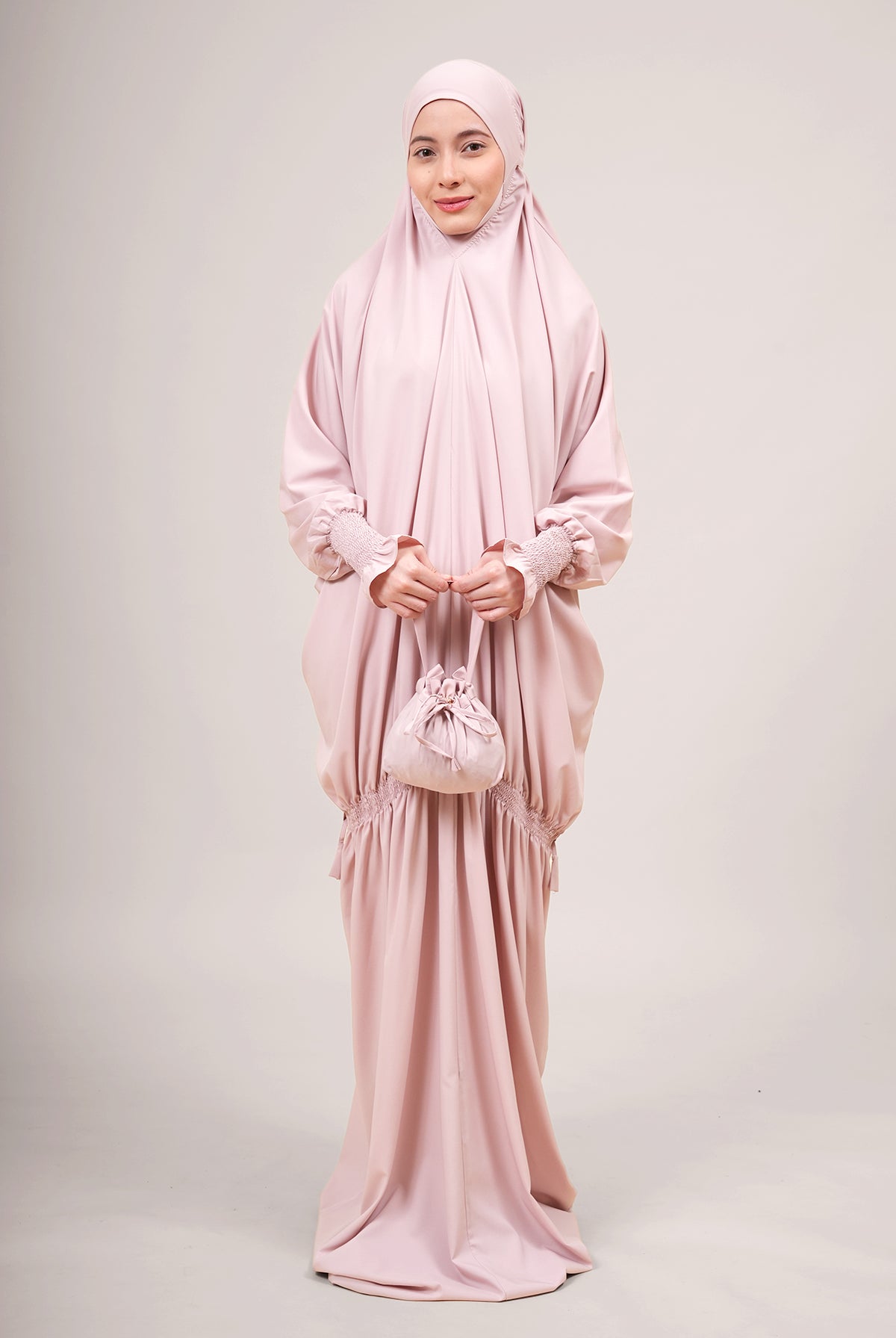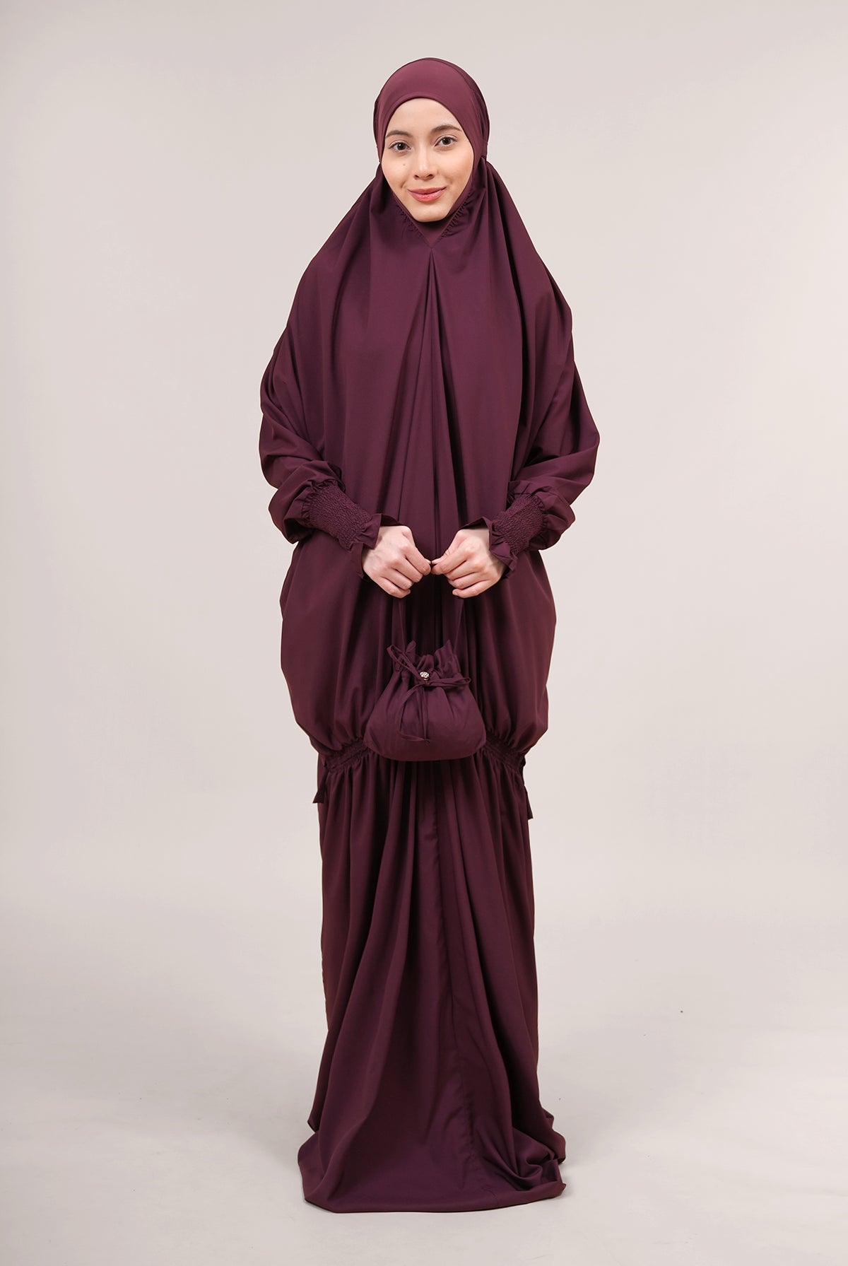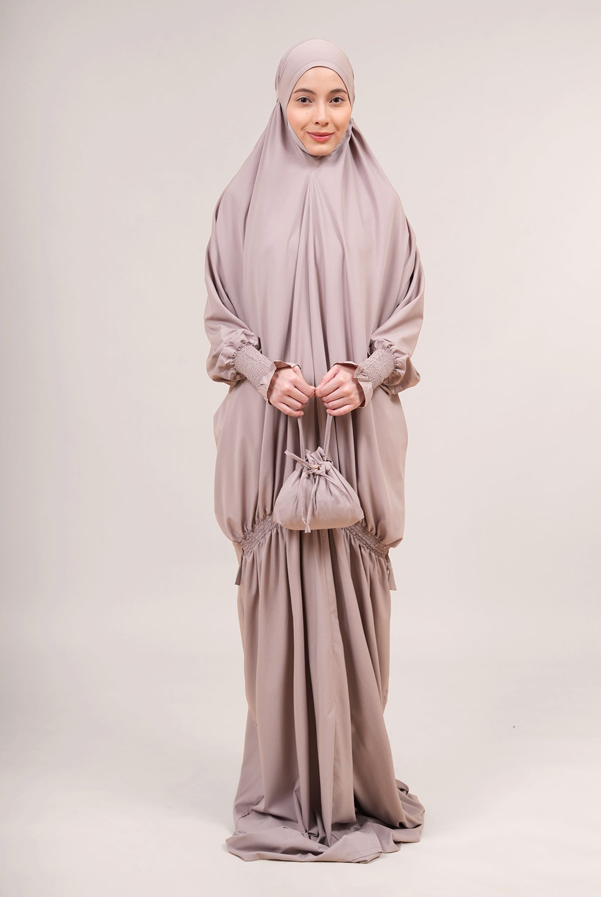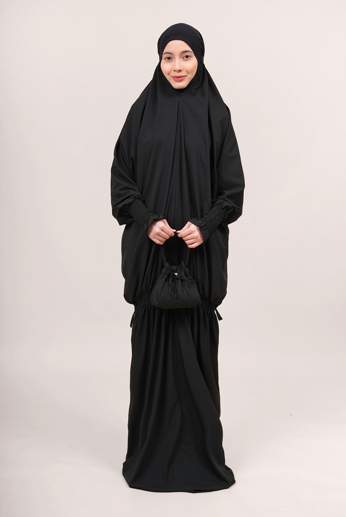 Flair Irha Midi features a midi-cut design with prayer-friendly smocking cuffs, offering practical comfort and modest coverage for every prayer, and comes with a minimal bag for easy carrying , perfect for everyday worship and travel.