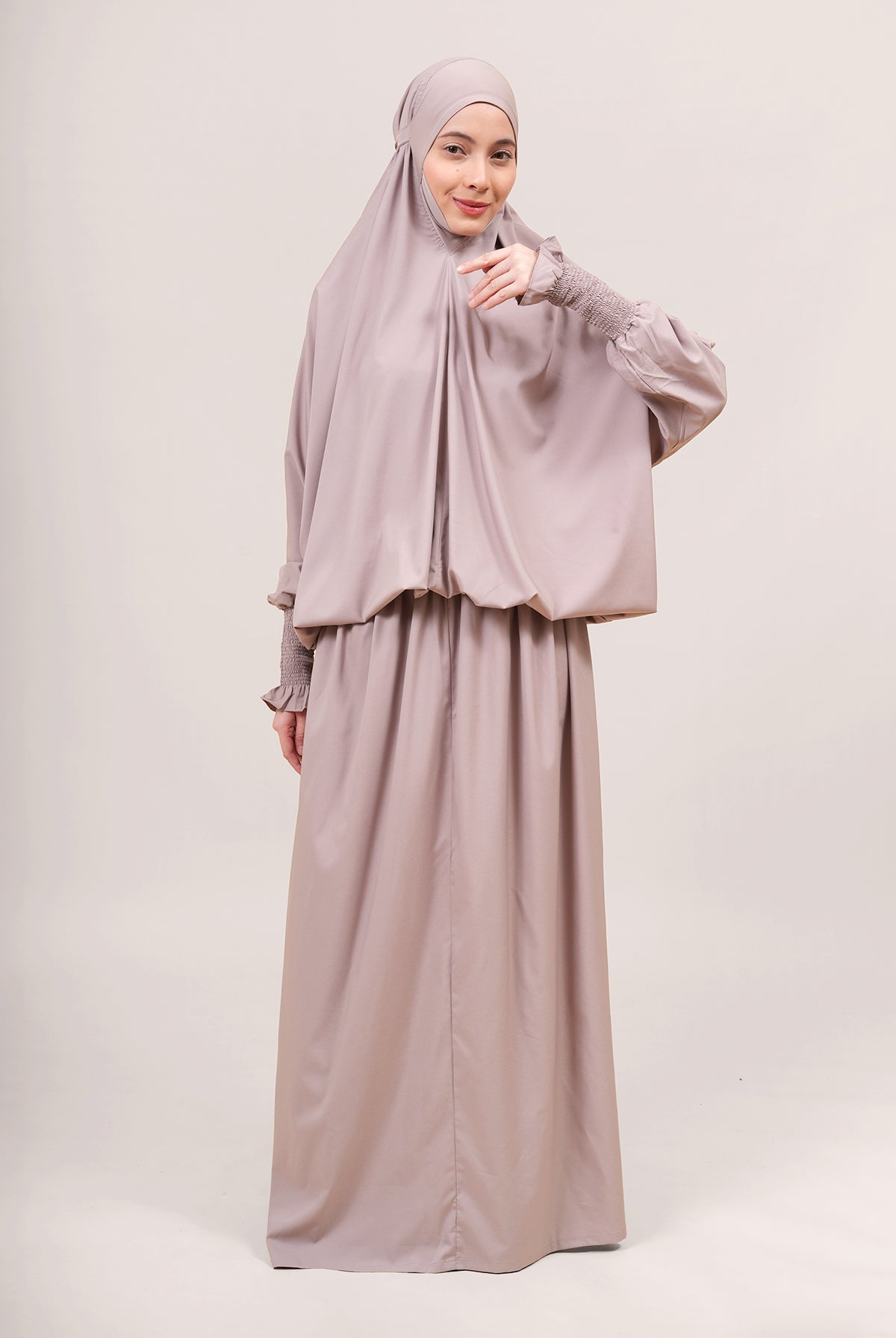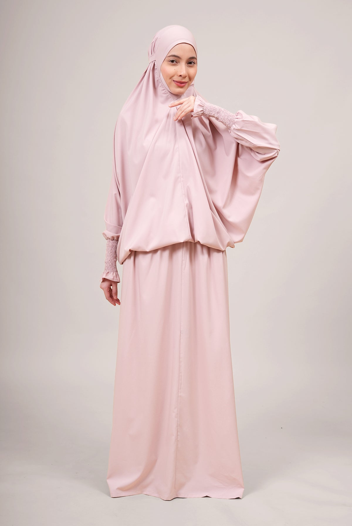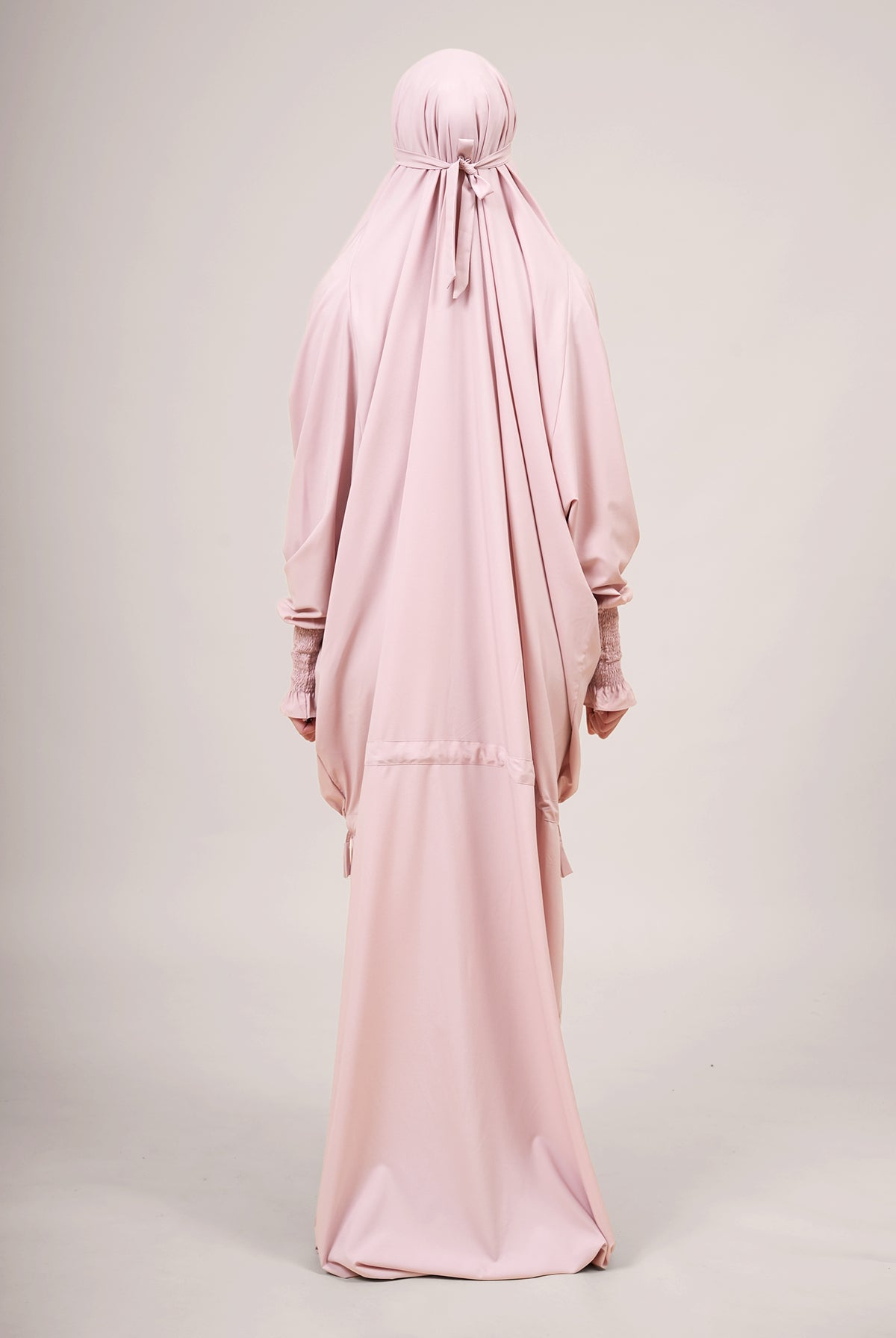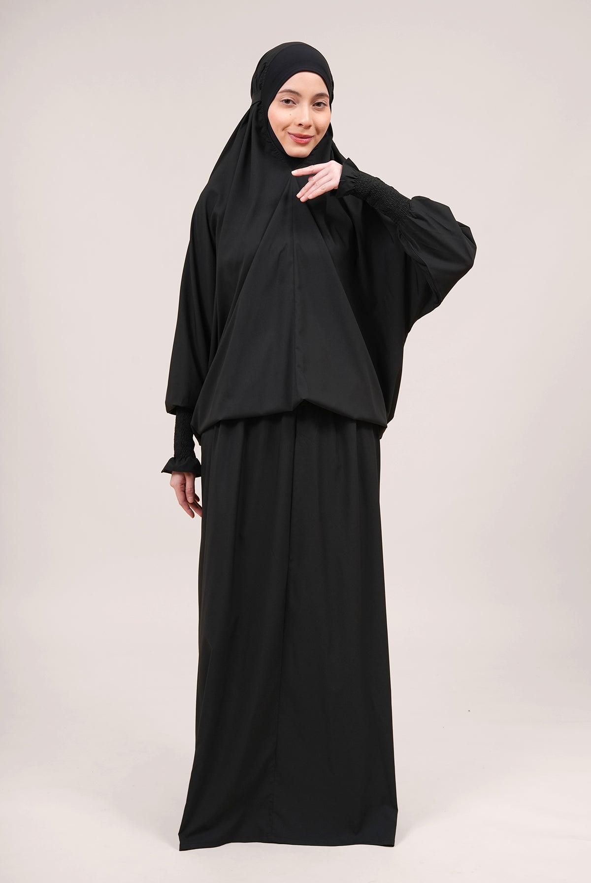 Flair Irha Midi features a midi-cut design with prayer-friendly smocking cuffs, offering practical comfort and modest coverage for every prayer, and comes with a minimal bag for easy carrying , perfect for everyday worship and travel.