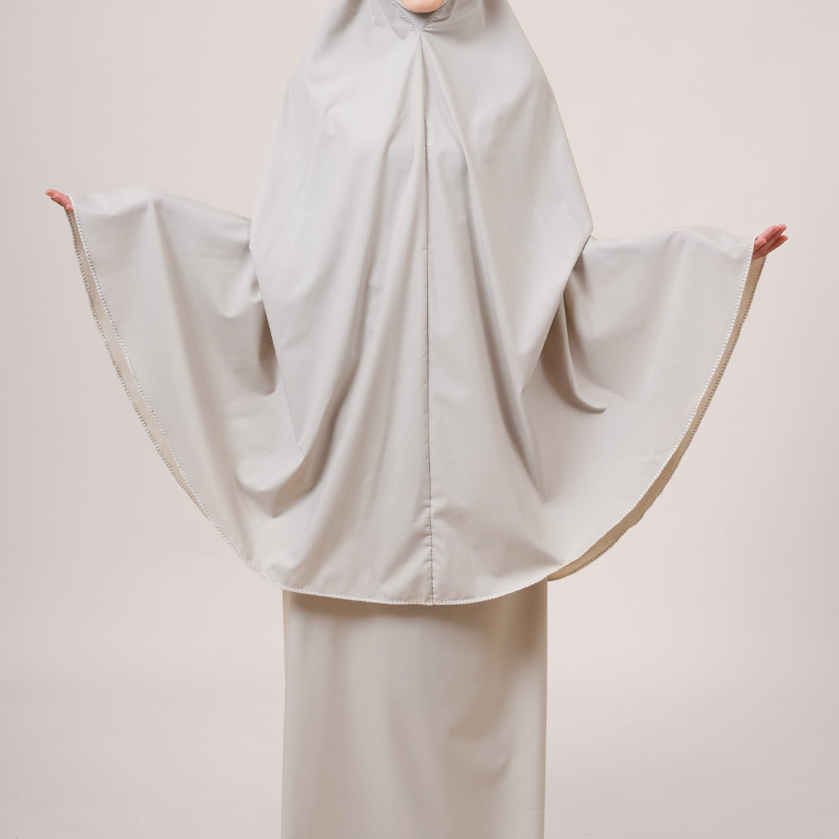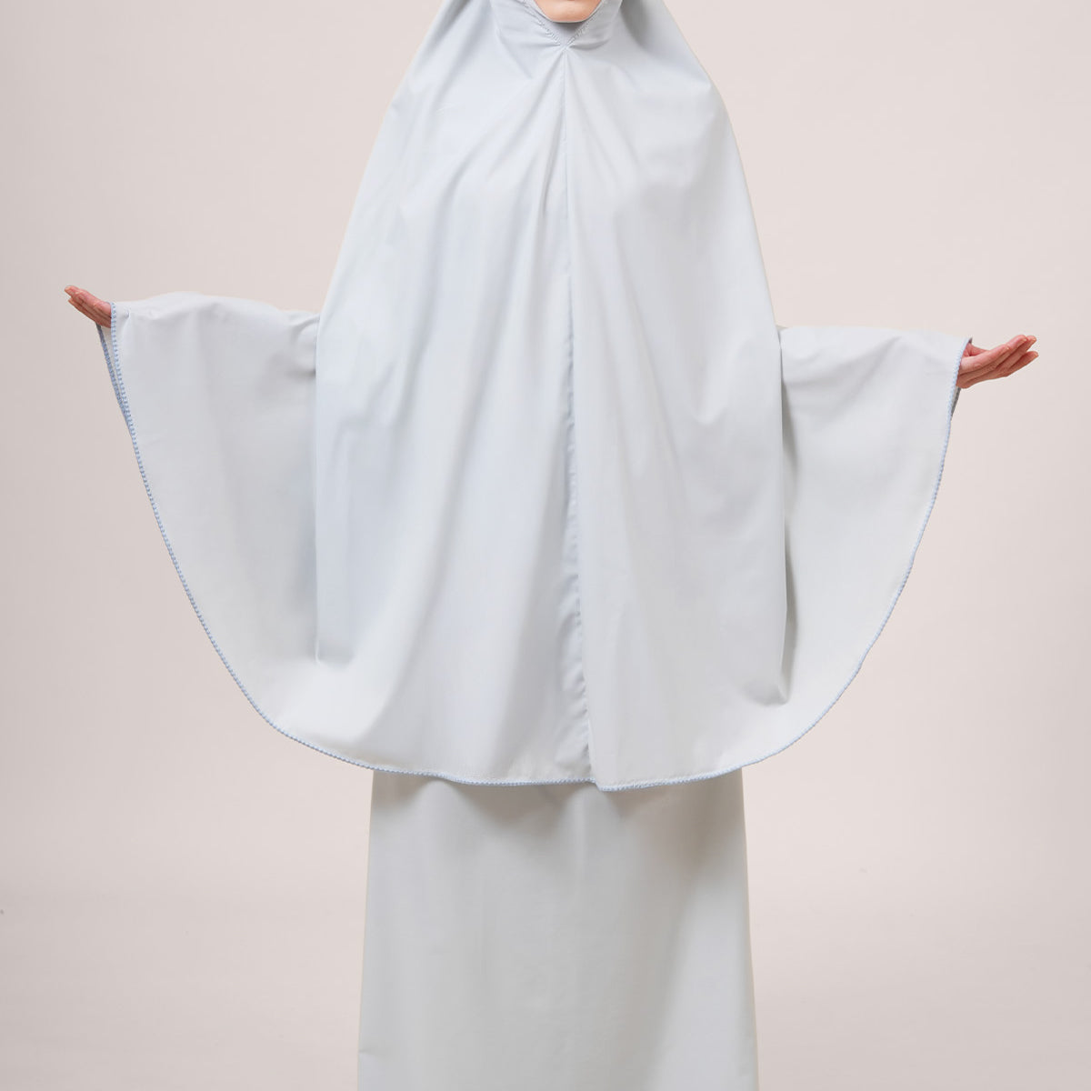Fine embroidery graces both the top and bottom of the telekung, adding a gentle feminine touch that enhances its refined silhouette. Each stitch is a mark of thoughtful craftsmanship.