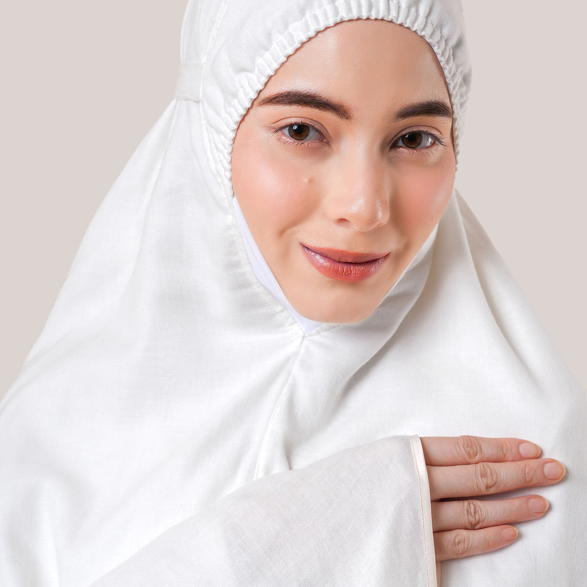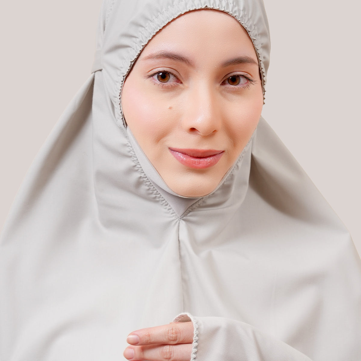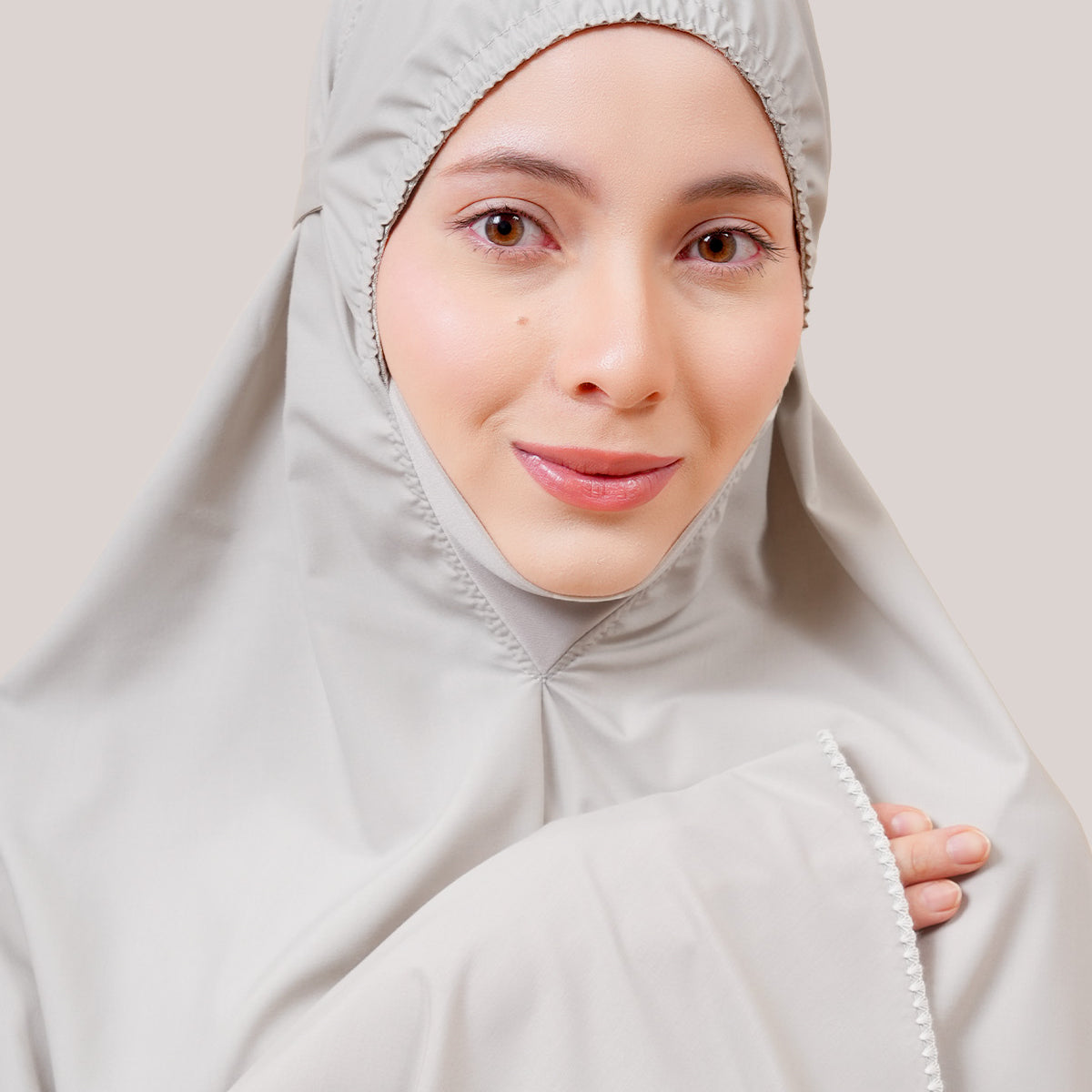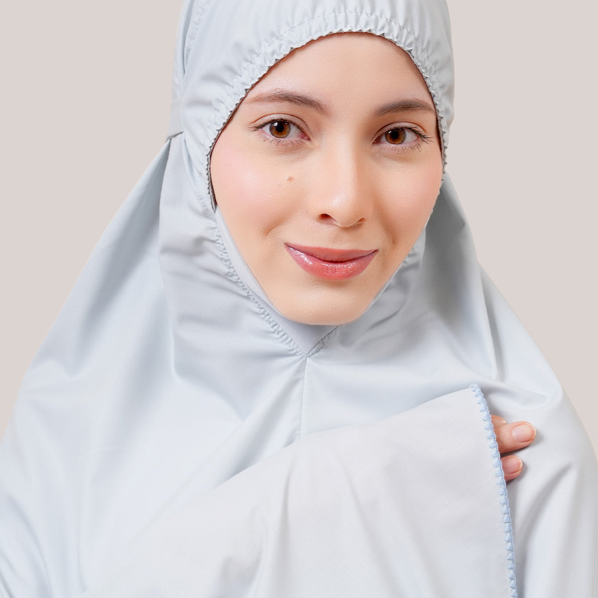 Subtle crystal embellishments on the headpiece and embroidery bring a soft sparkle — a reminder of grace and blessing in every sujud.