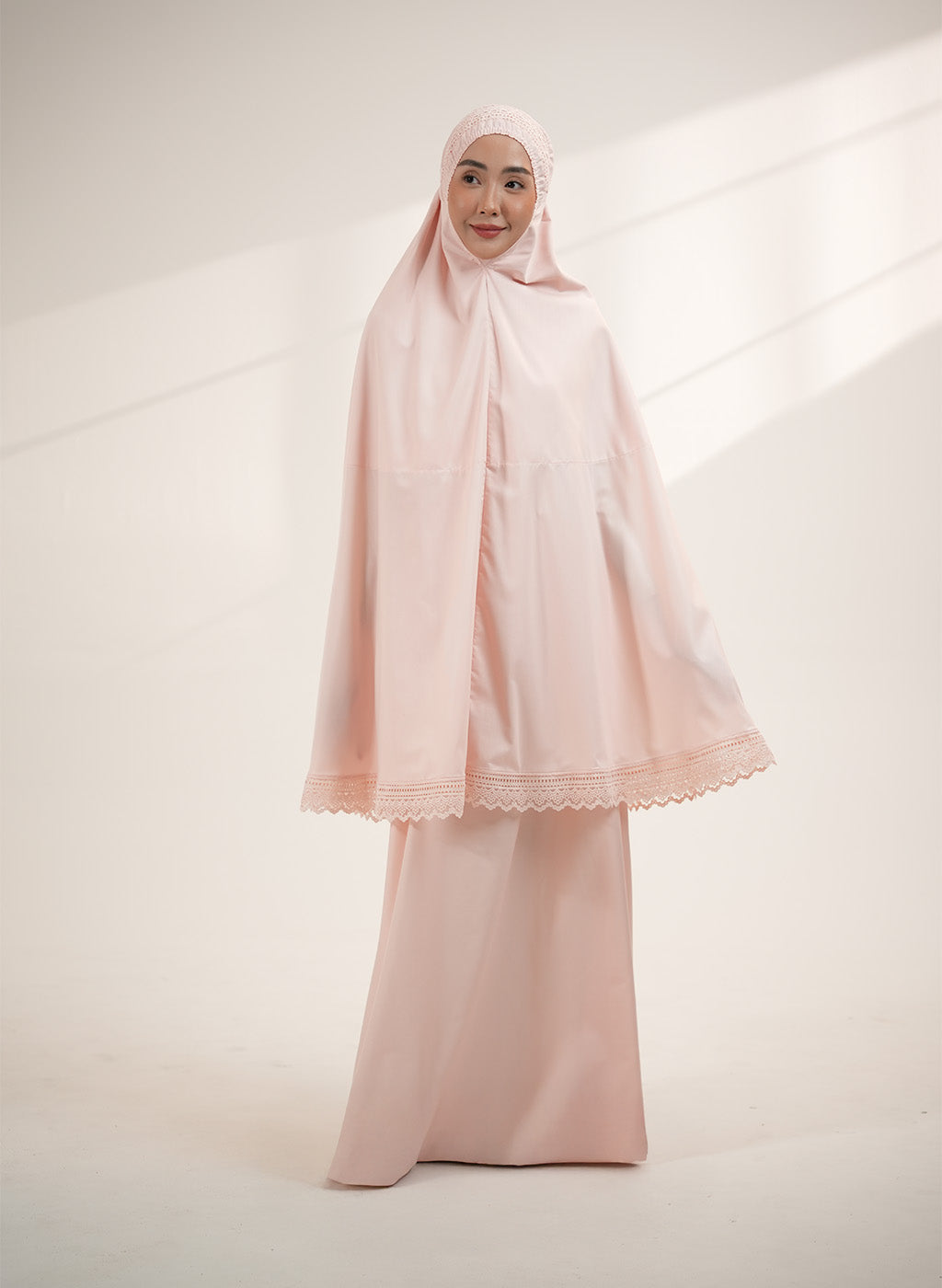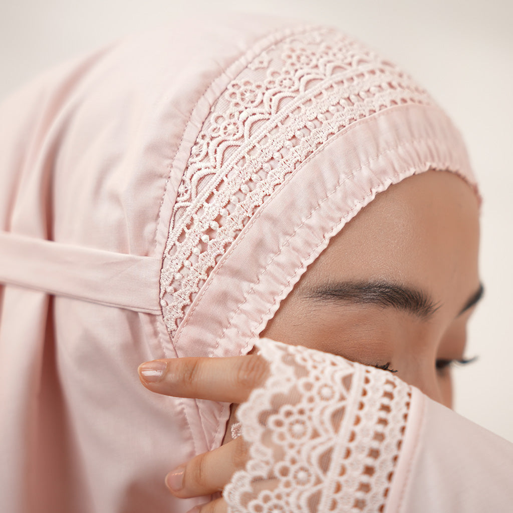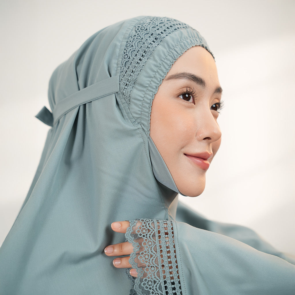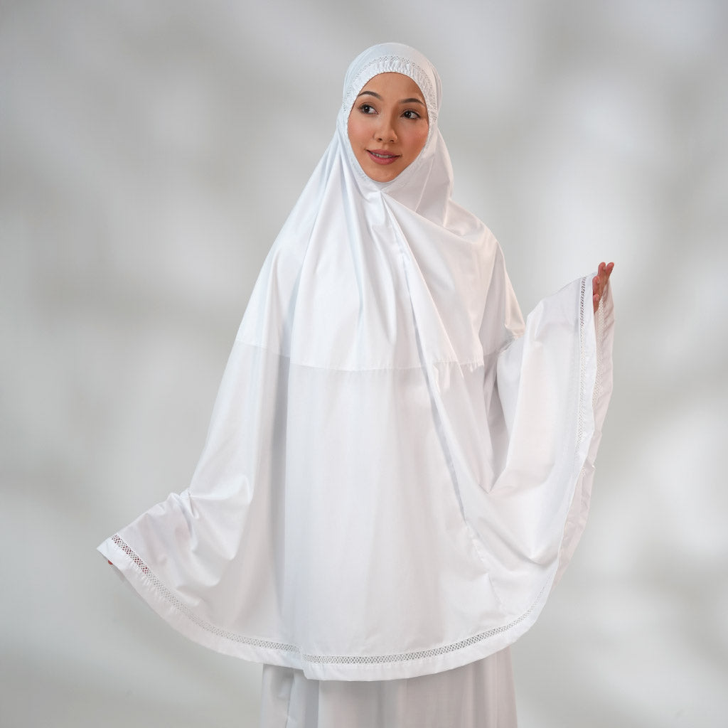The Jalilah collection draws inspiration from the motif “Lines of Elegance.” Its lace is crafted with a minimal and seamless pattern, symbolizing purity and fluidity. This makes it not just prayerwear, but a piece of art that carries grace in every stitch.