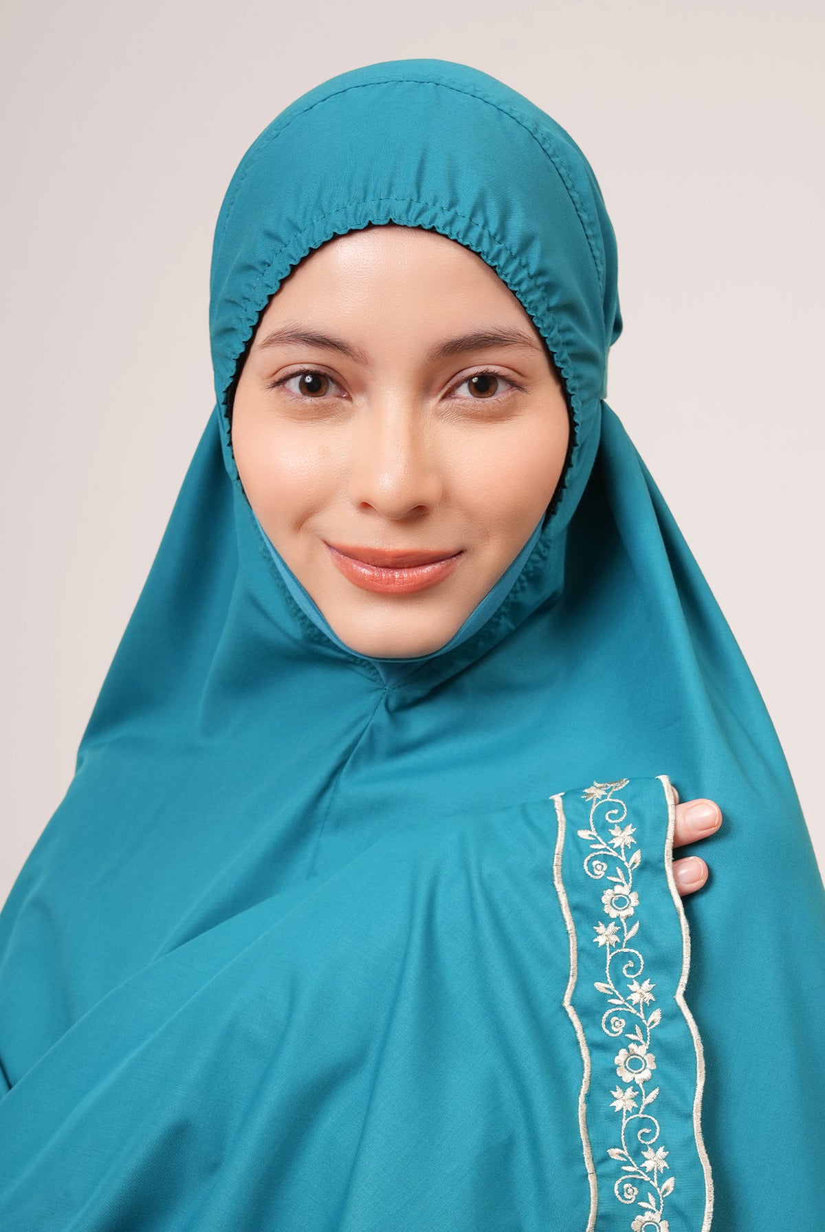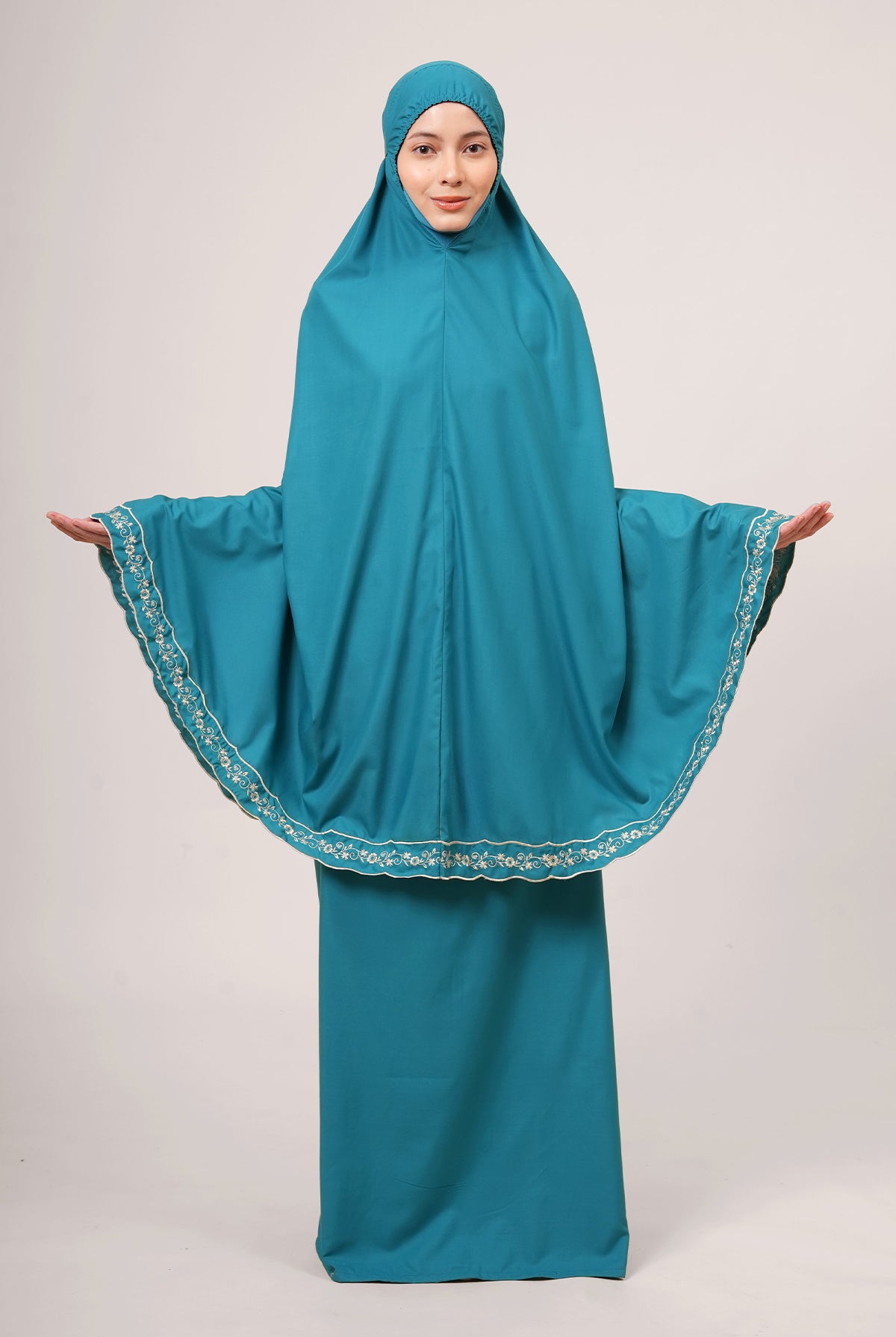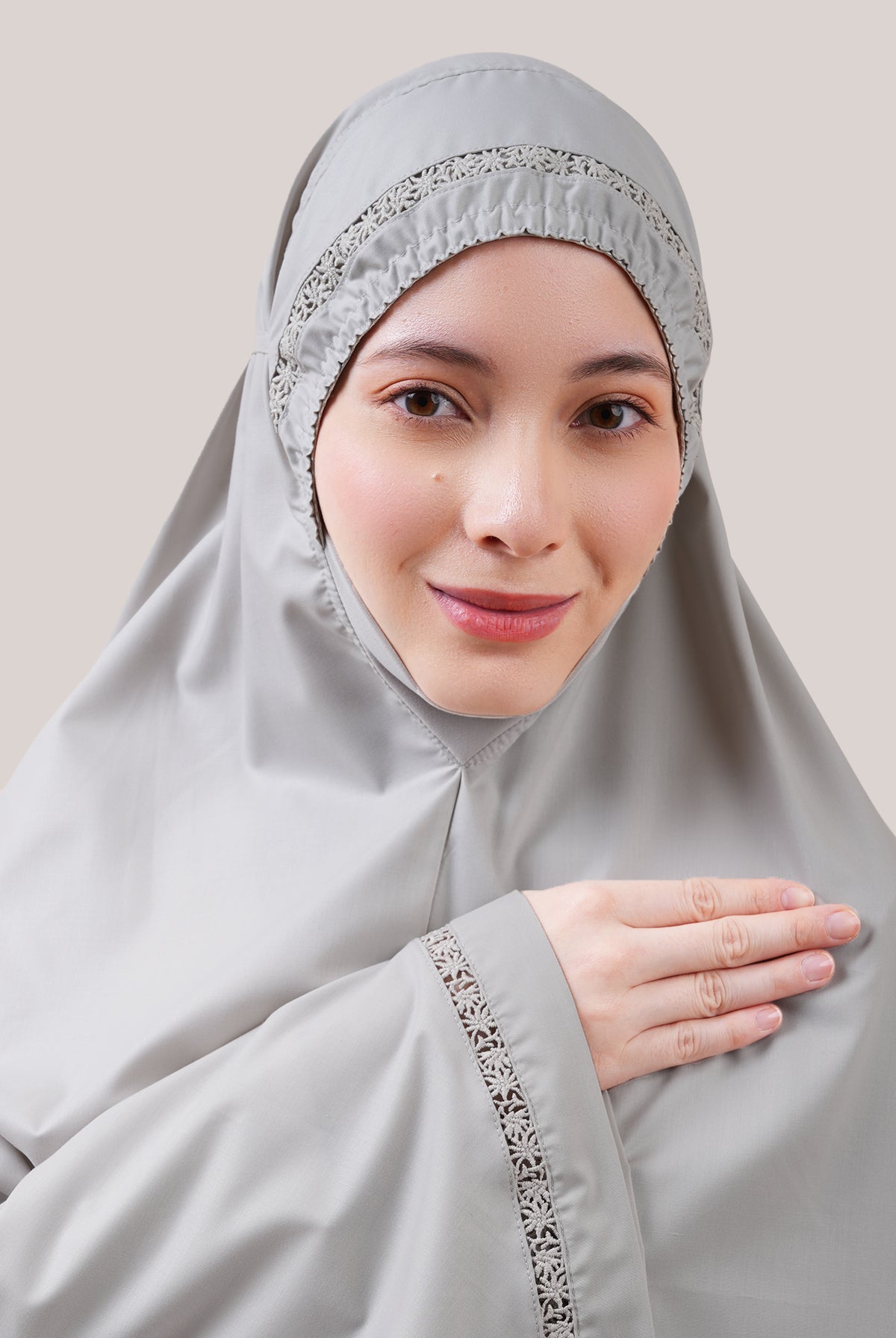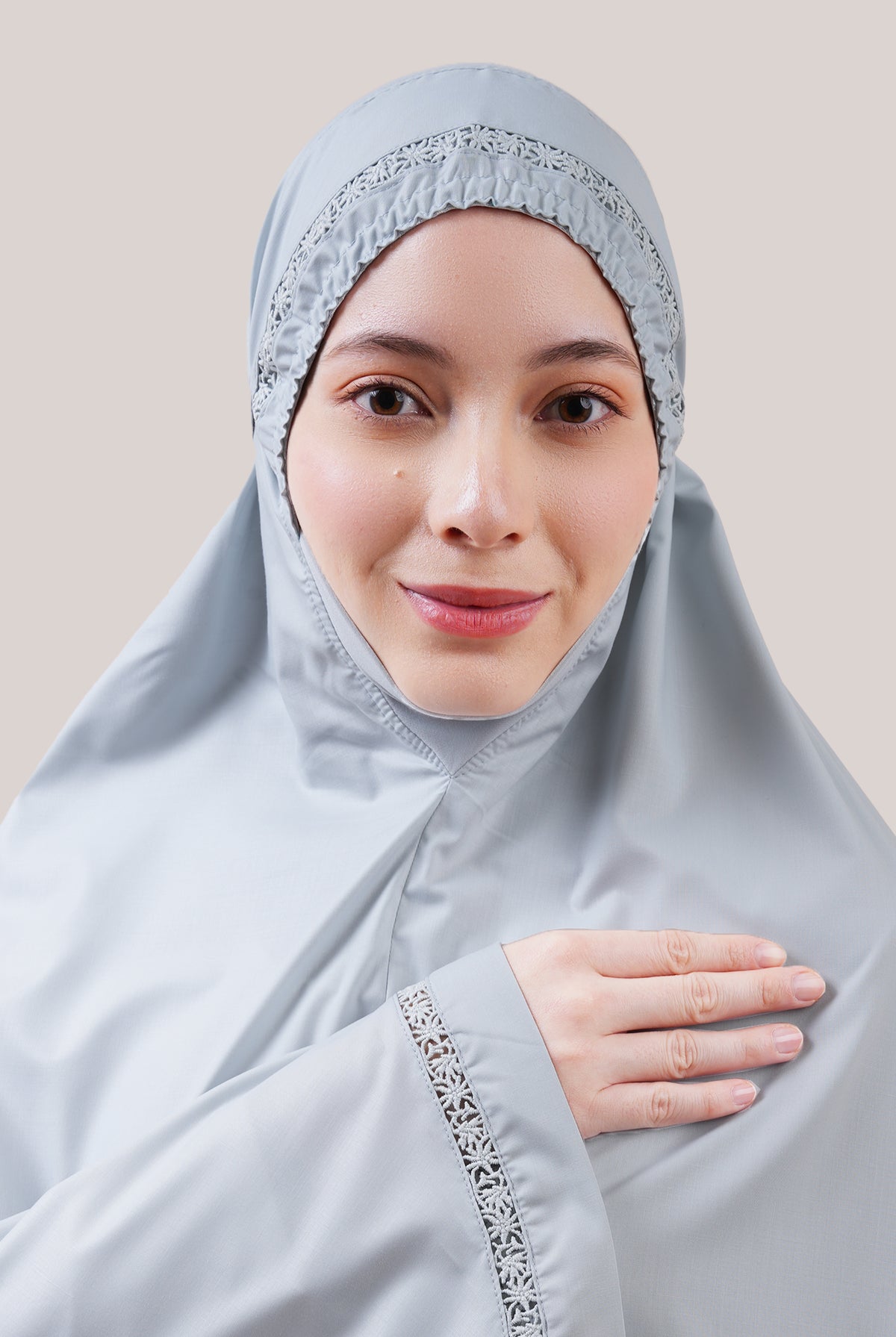 Crafted from the cool and breathable KUF fabric, the Signature Sakura telekung features intricate cherry blossom embroidery on a combination of cotton and guipure lace