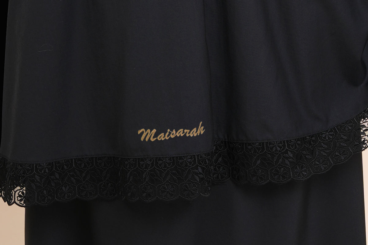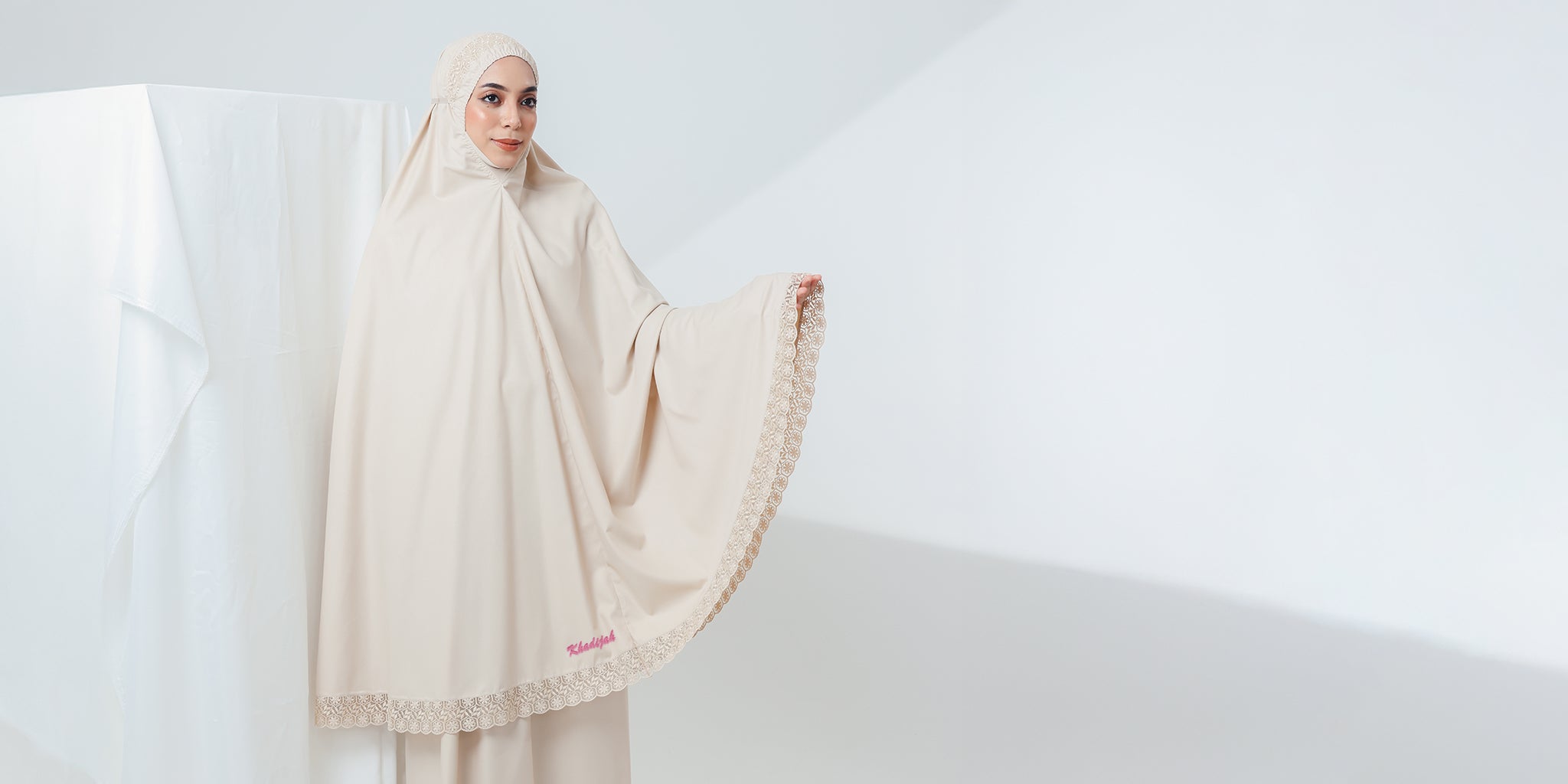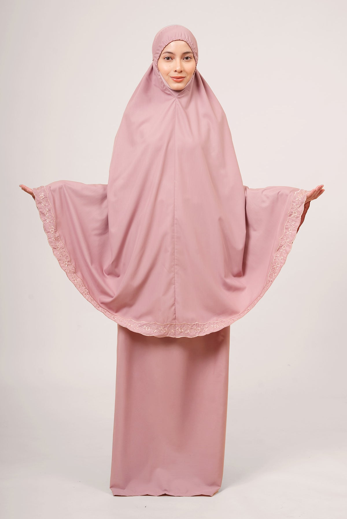Crafted from the cool and breathable KUF fabric, the Signature Sakura telekung features intricate cherry blossom embroidery on a combination of cotton and guipure lace
