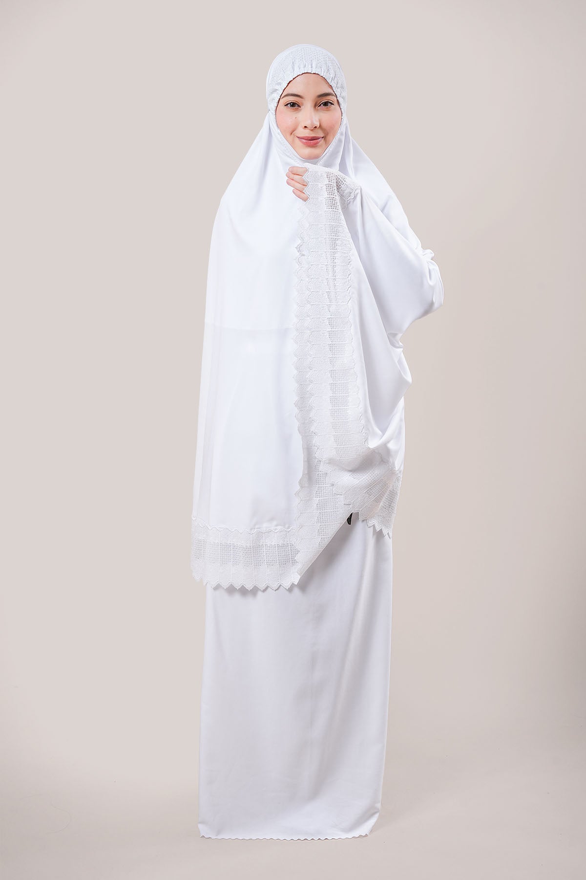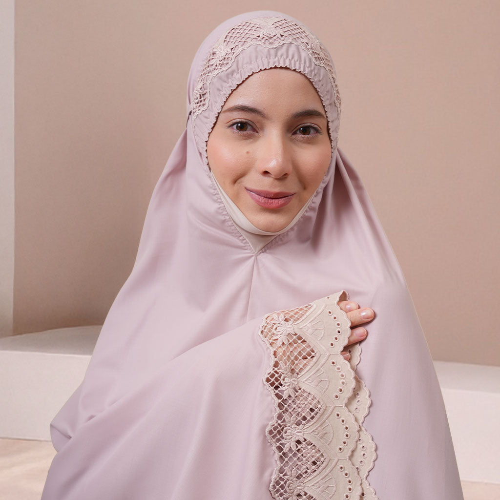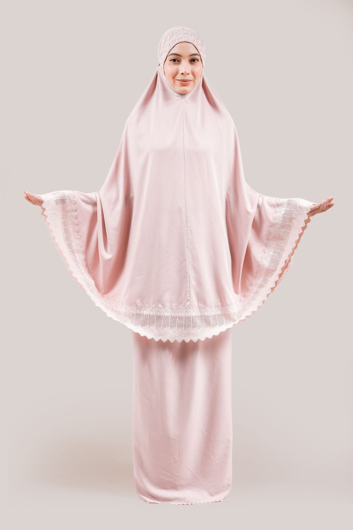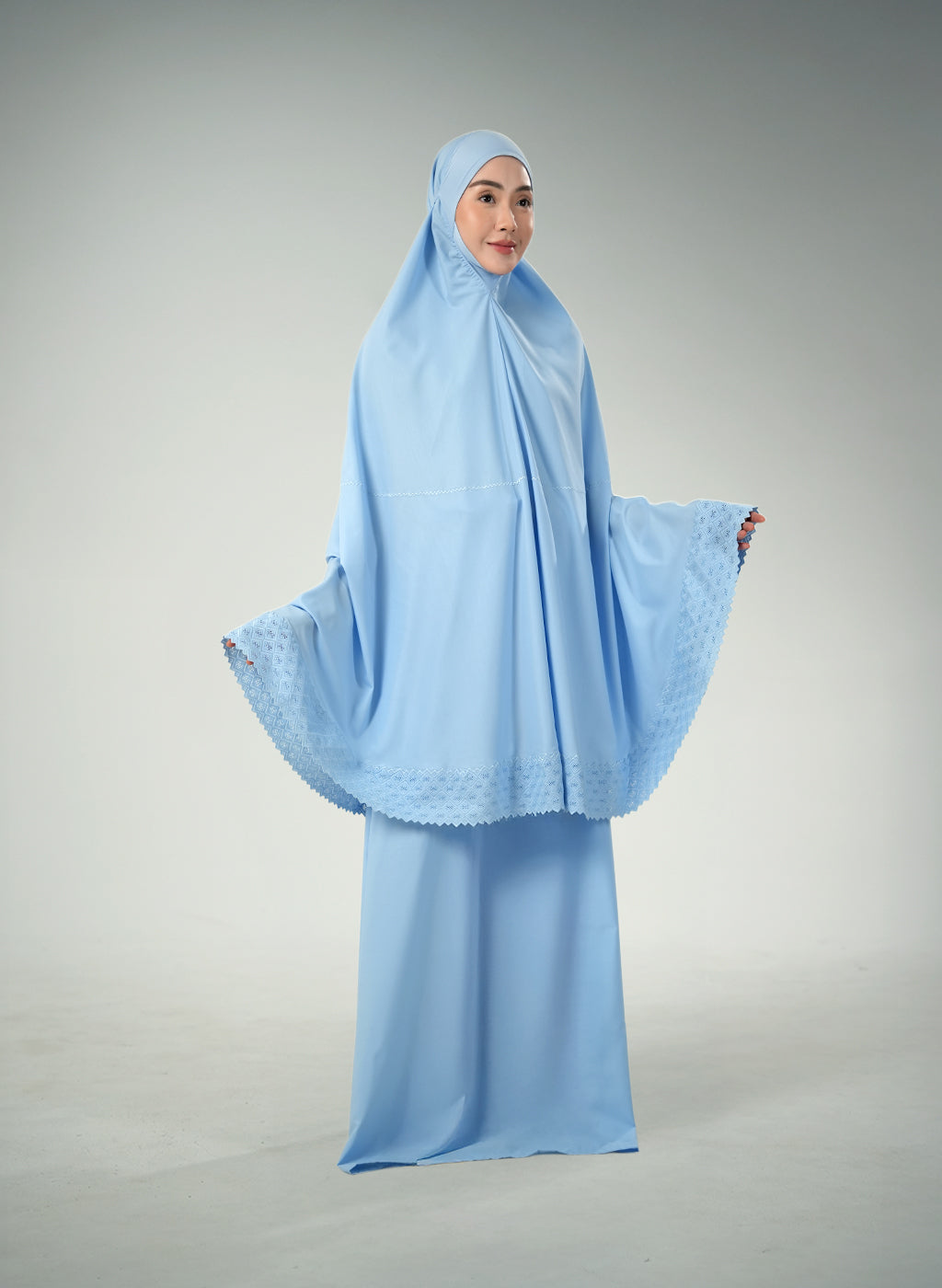 The gentle lace work is sewn with precision, the fabric is airy and cooling, and the fit hugs just right without leaving a mark. It’s the kind of telekung you reach for, again and again.