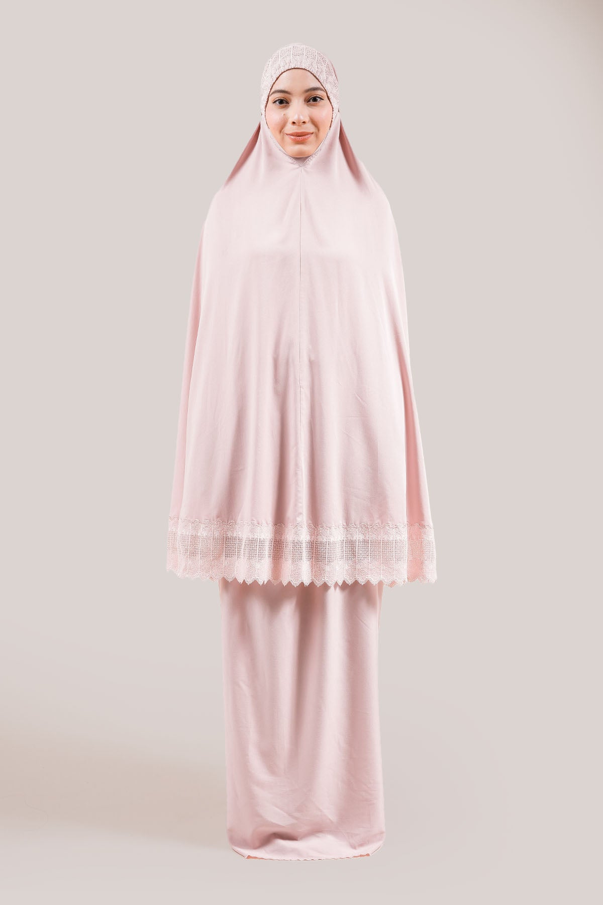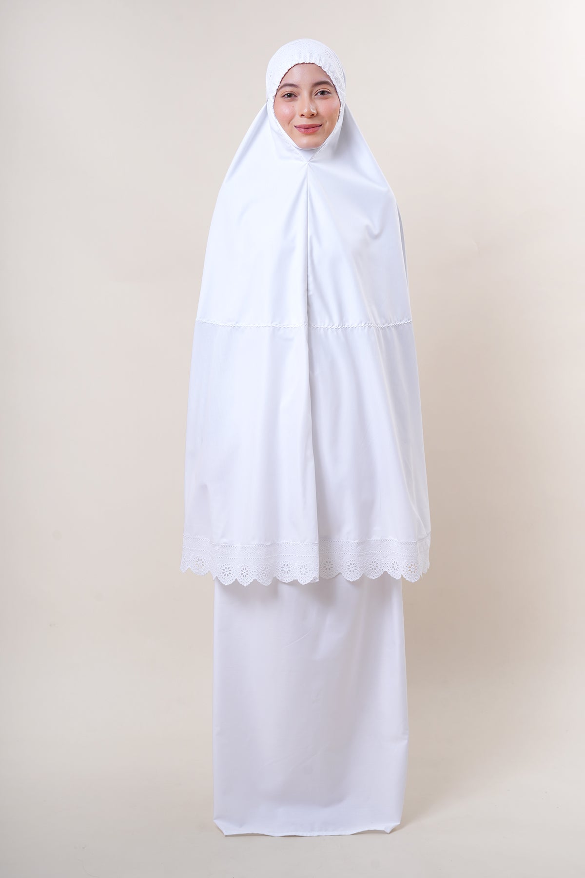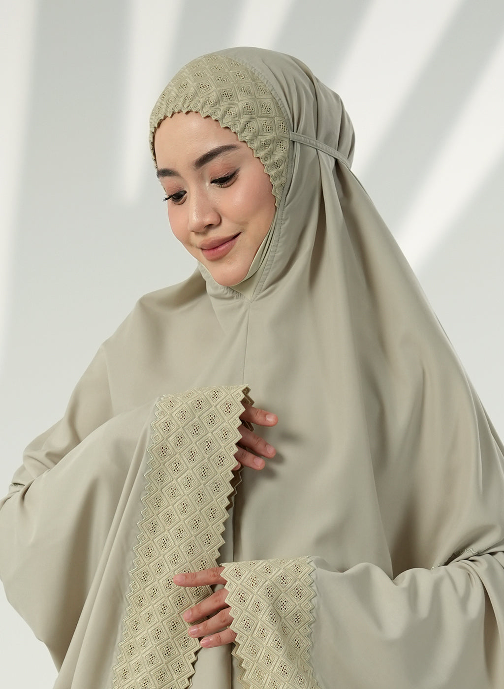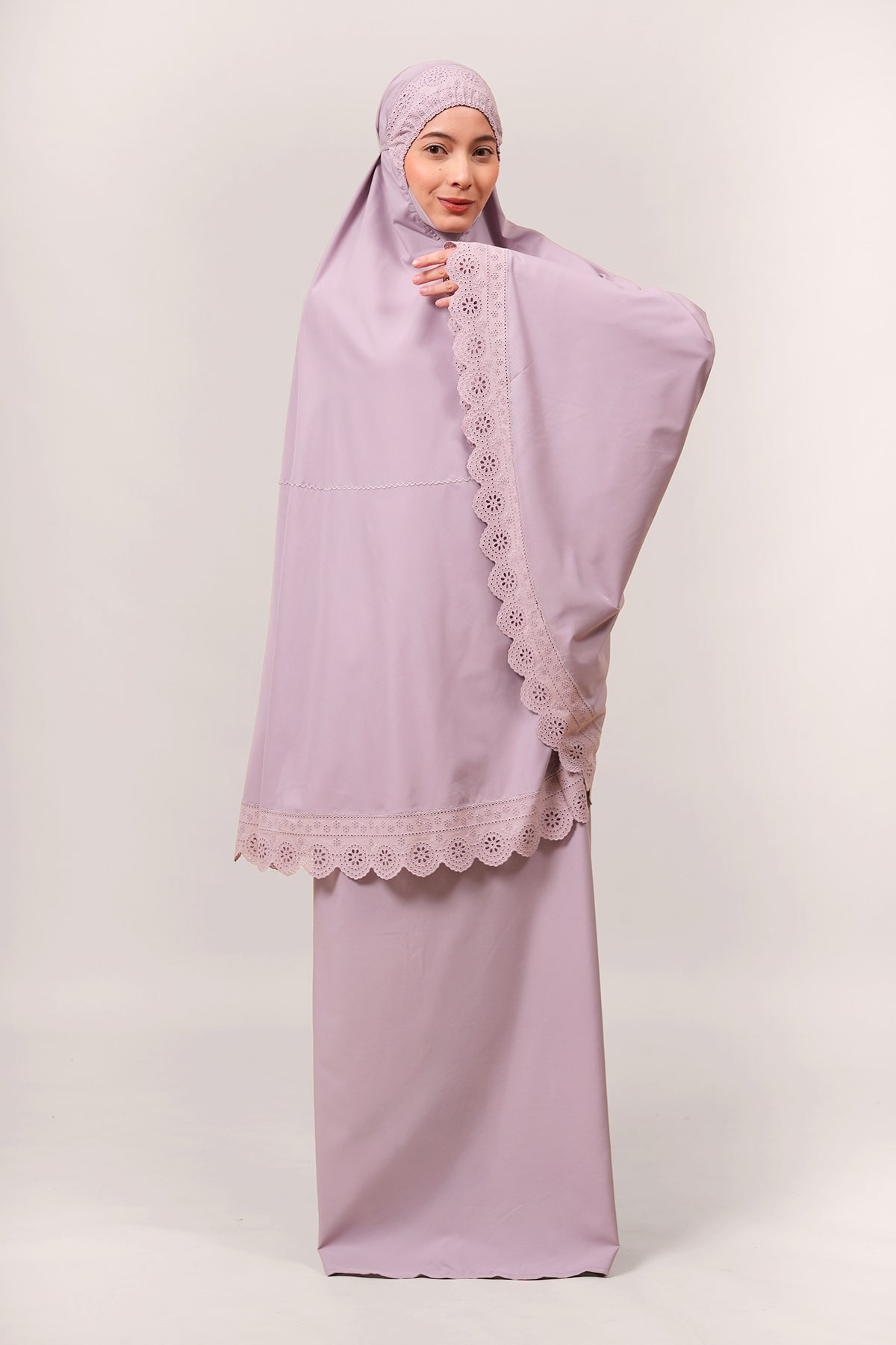 The gentle lace work is sewn with precision, the fabric is airy and cooling, and the fit hugs just right without leaving a mark. It’s the kind of telekung you reach for, again and again.