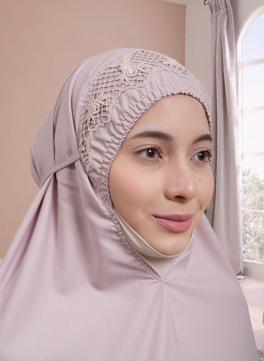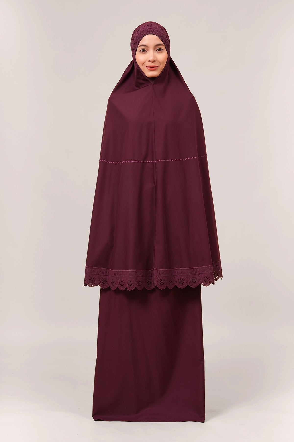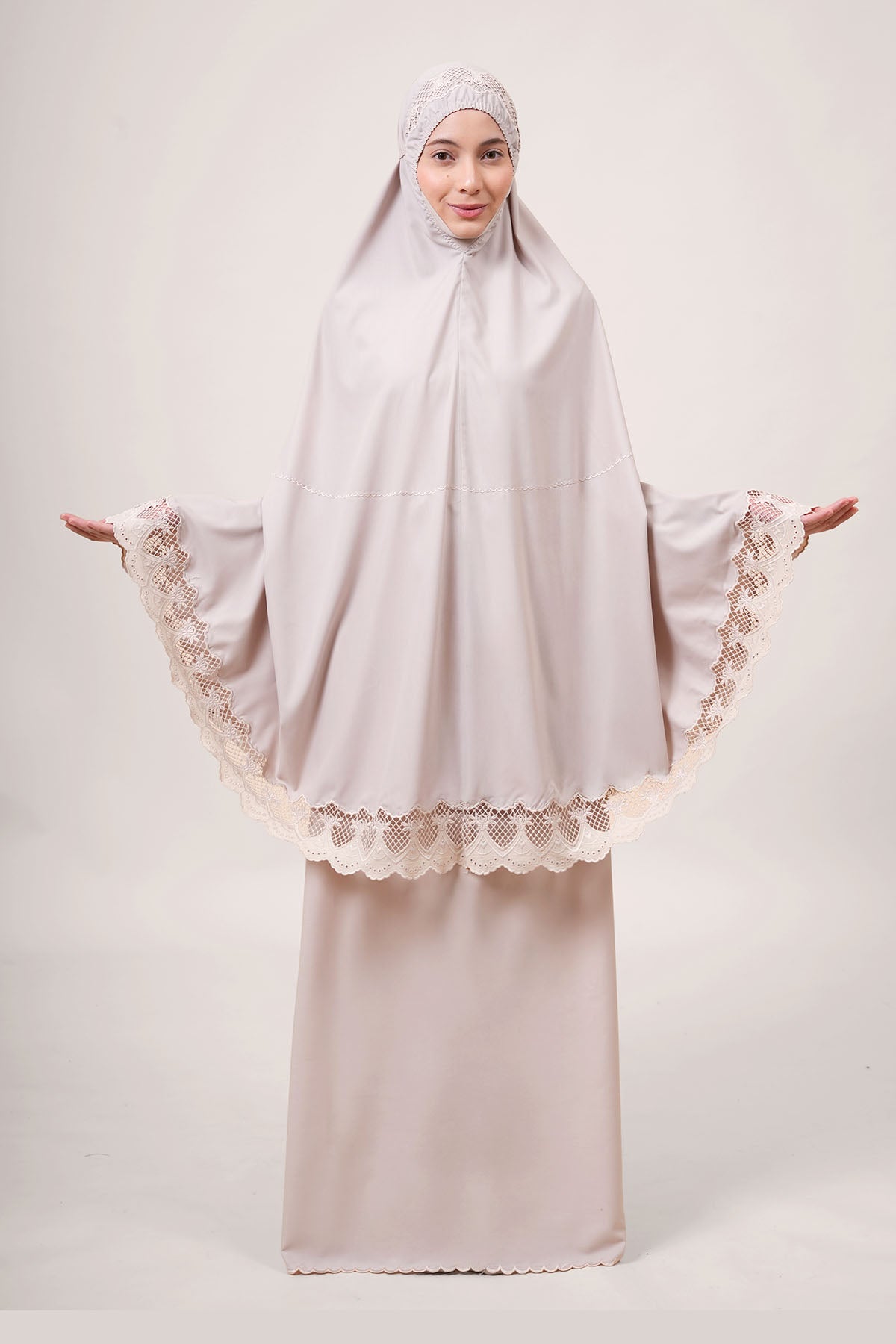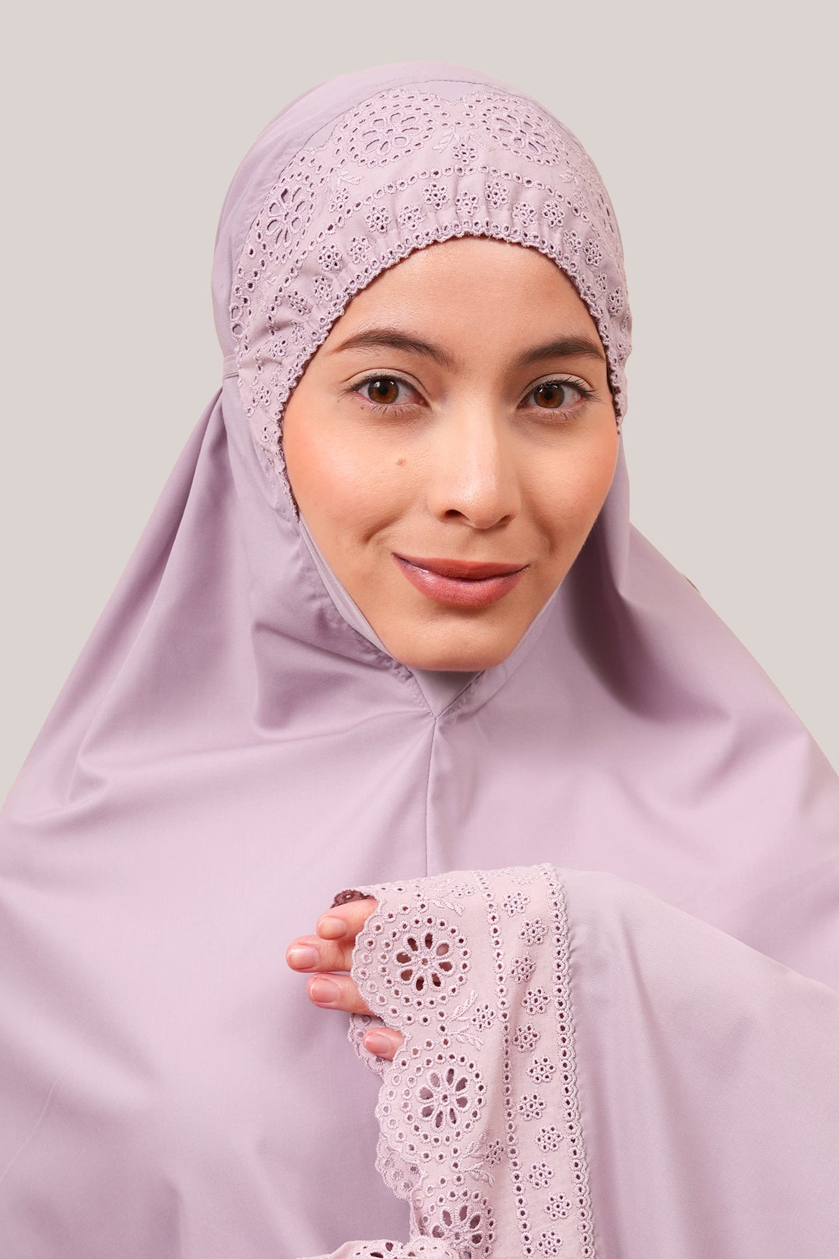 The gentle lace work is sewn with precision, the fabric is airy and cooling, and the fit hugs just right without leaving a mark. It’s the kind of telekung you reach for, again and again.
