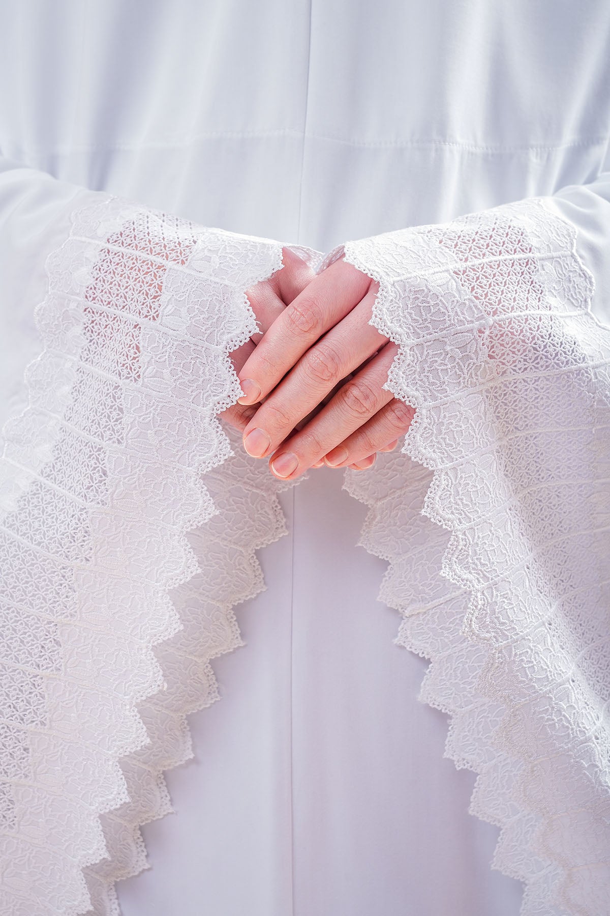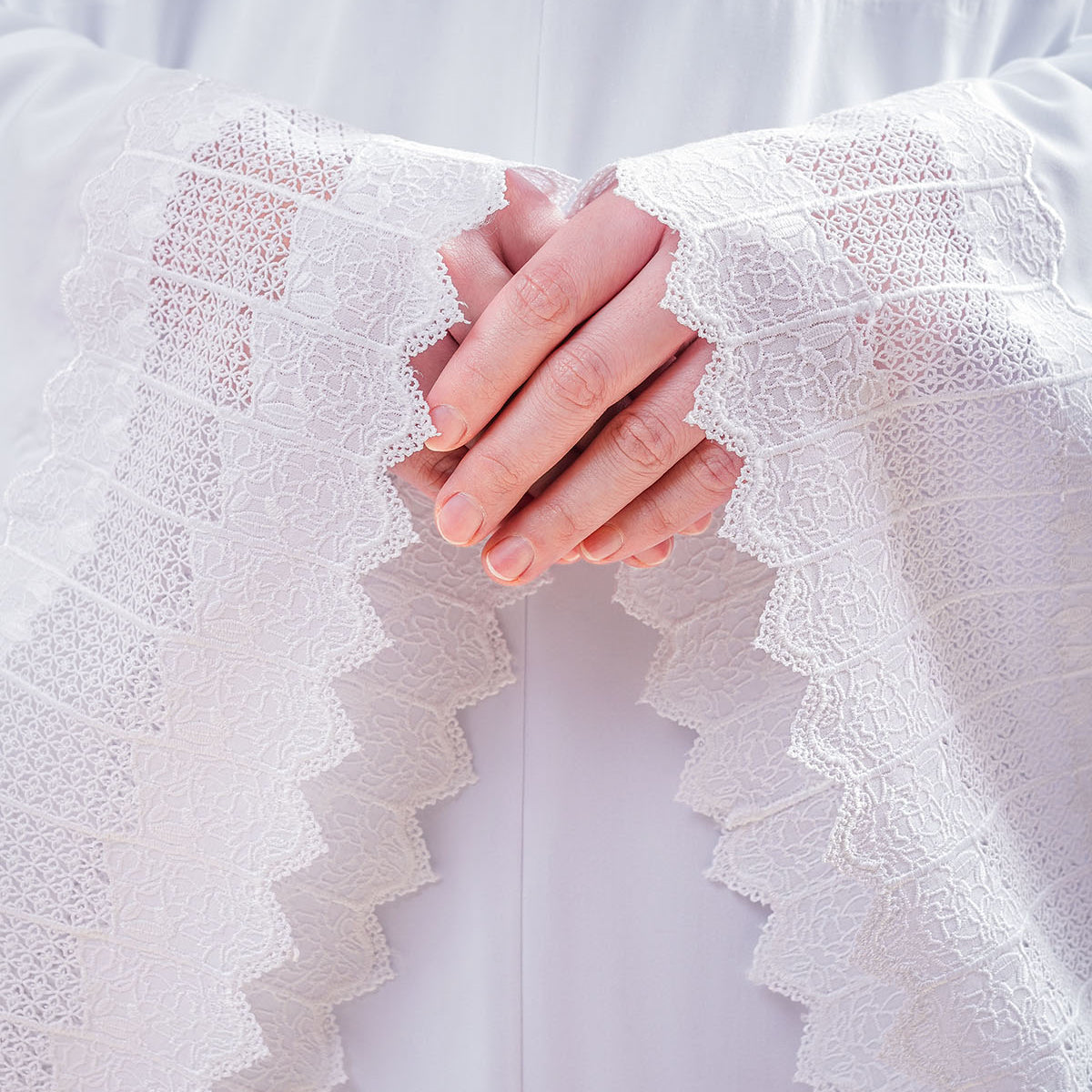 With durable material that doesn’t wrinkle easily and lacework that adds elegance without being overdone, it’s for those who seek balance in their prayerwear.