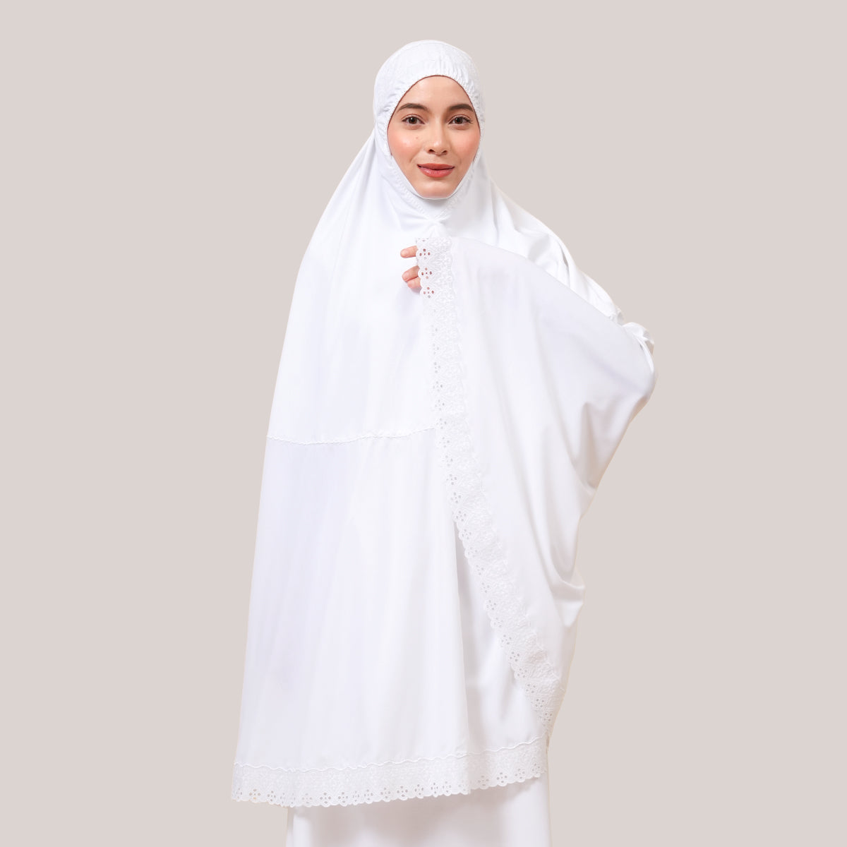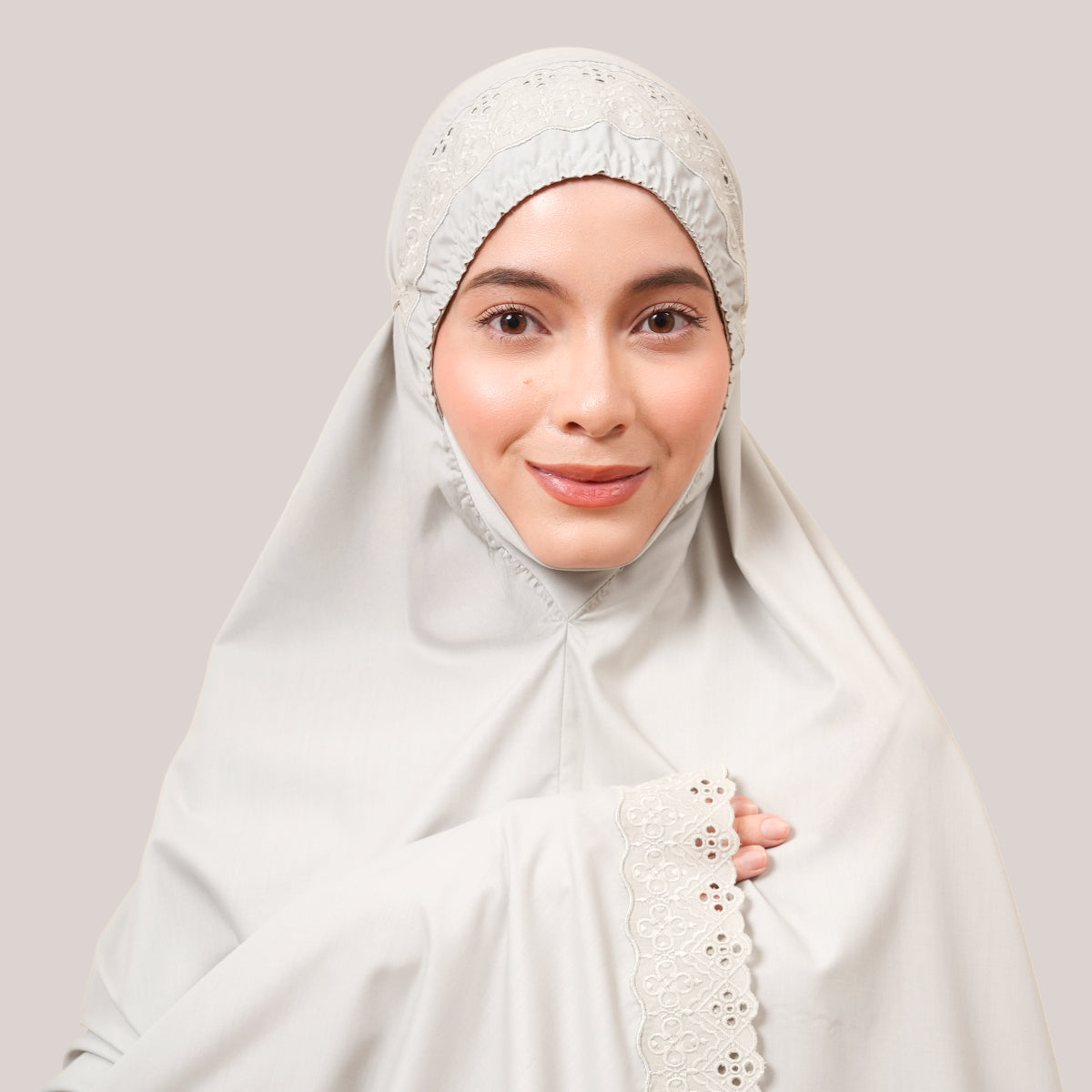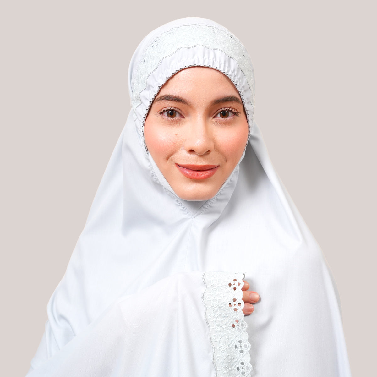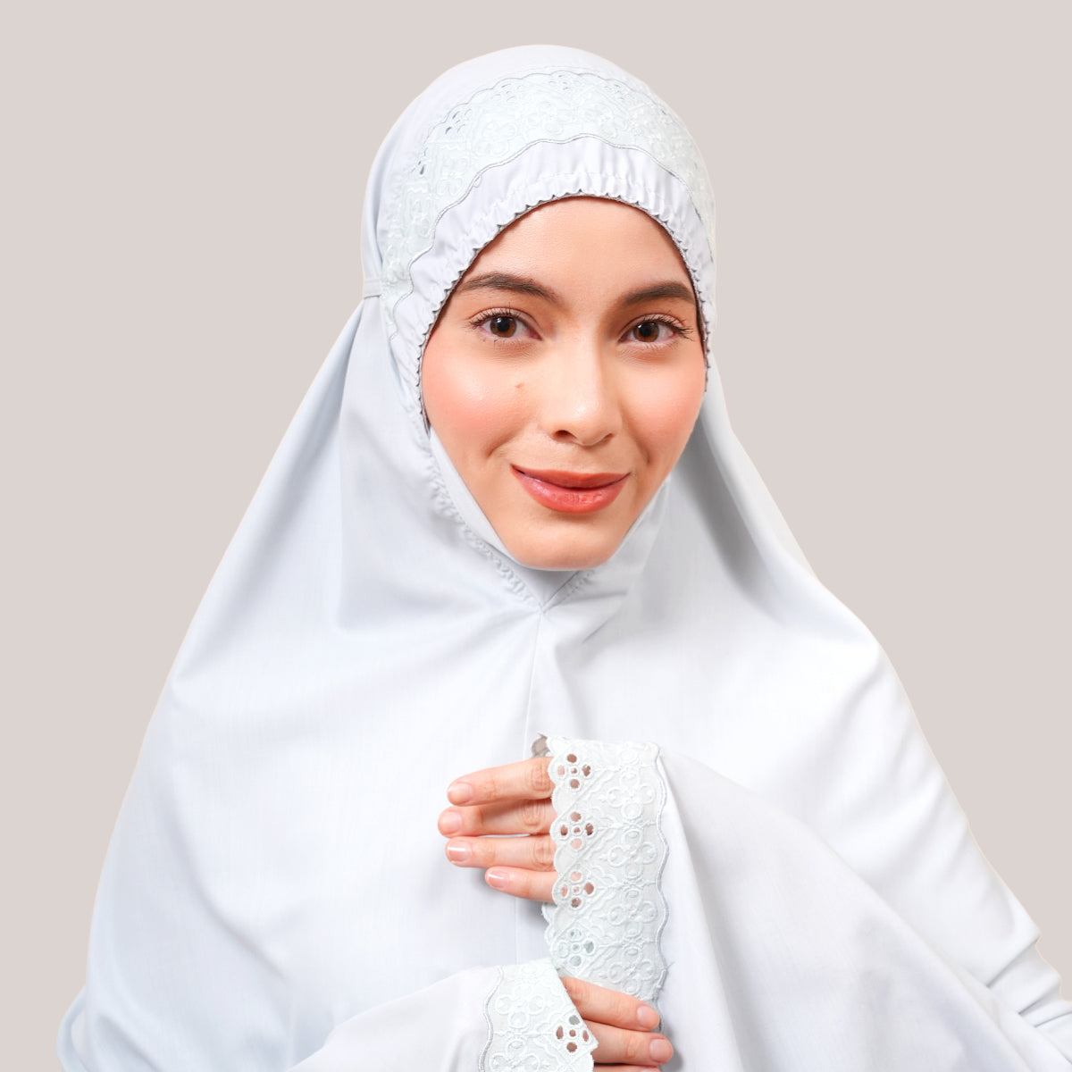 The gentle lace work is sewn with precision, the fabric is airy and cooling, and the fit hugs just right without leaving a mark. It’s the kind of telekung you reach for, again and again.