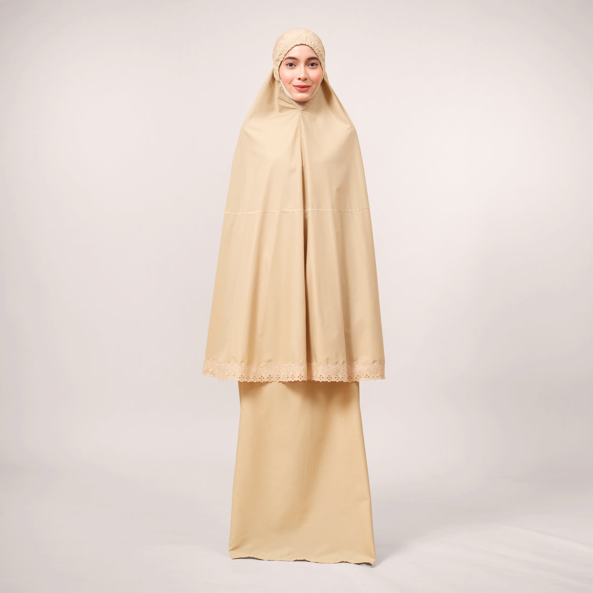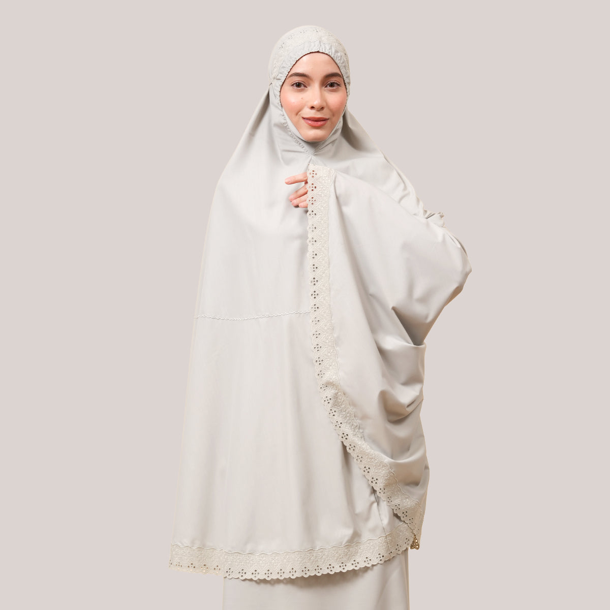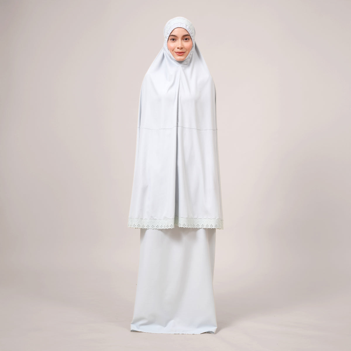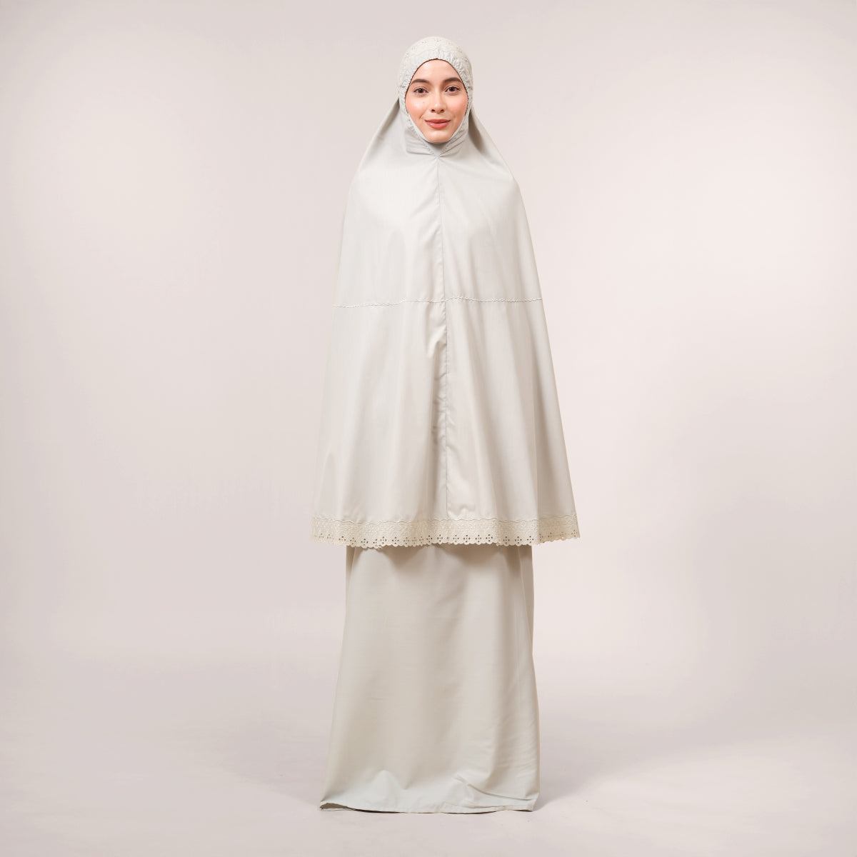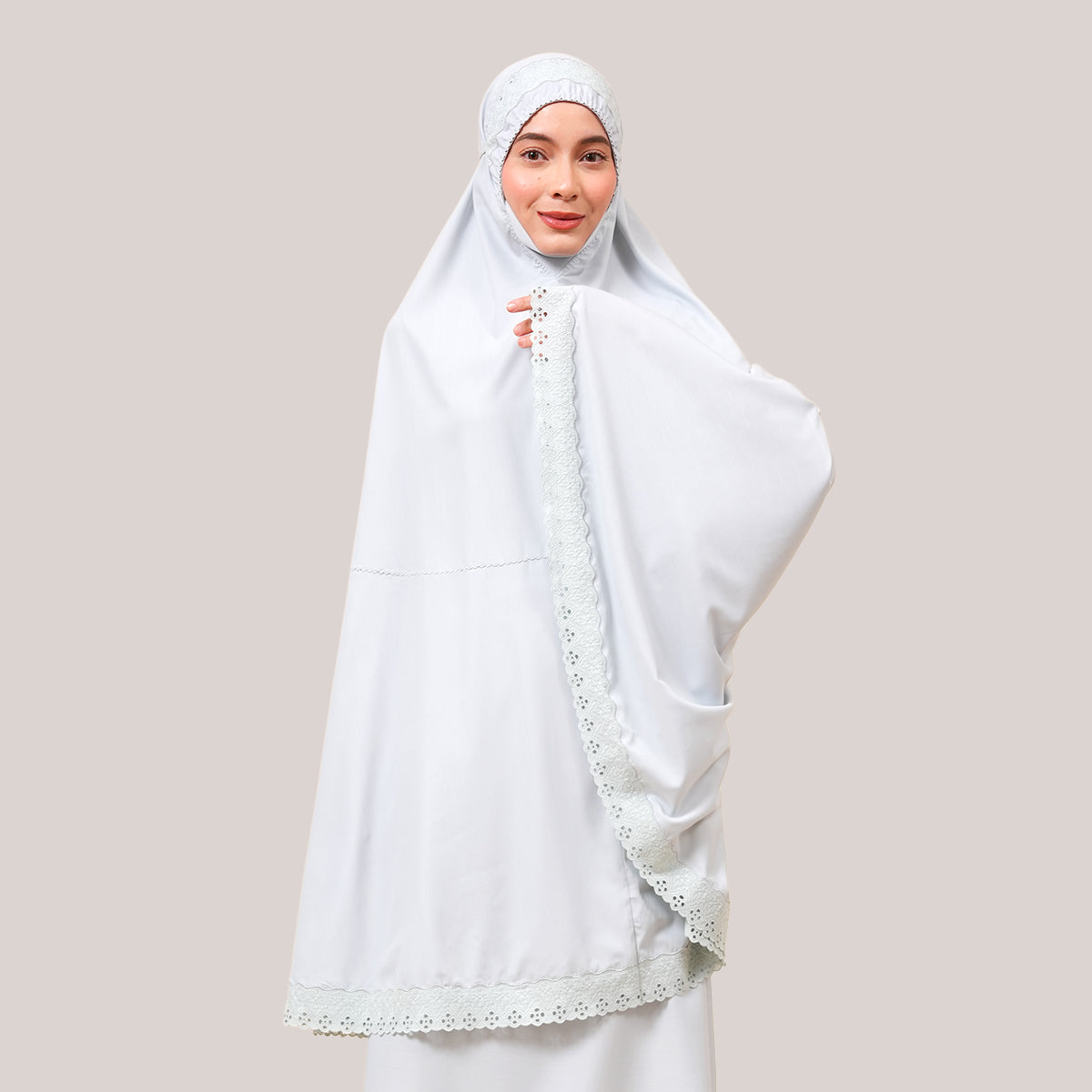 The gentle lace work is sewn with precision, the fabric is airy and cooling, and the fit hugs just right without leaving a mark. It’s the kind of telekung you reach for, again and again.