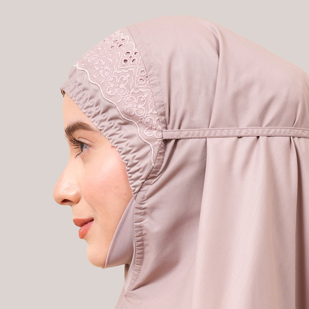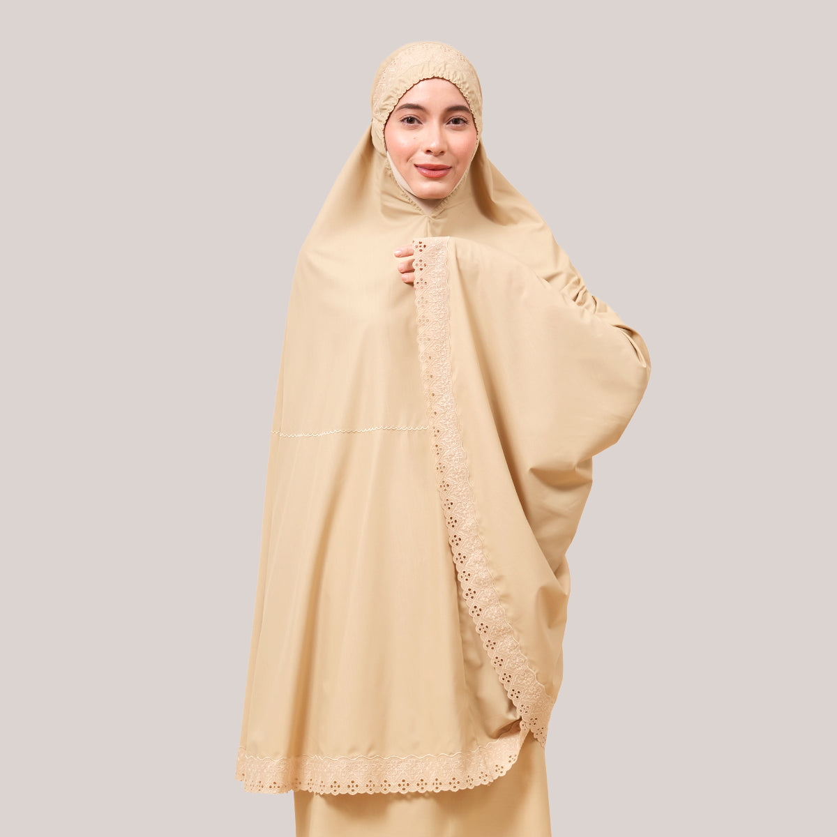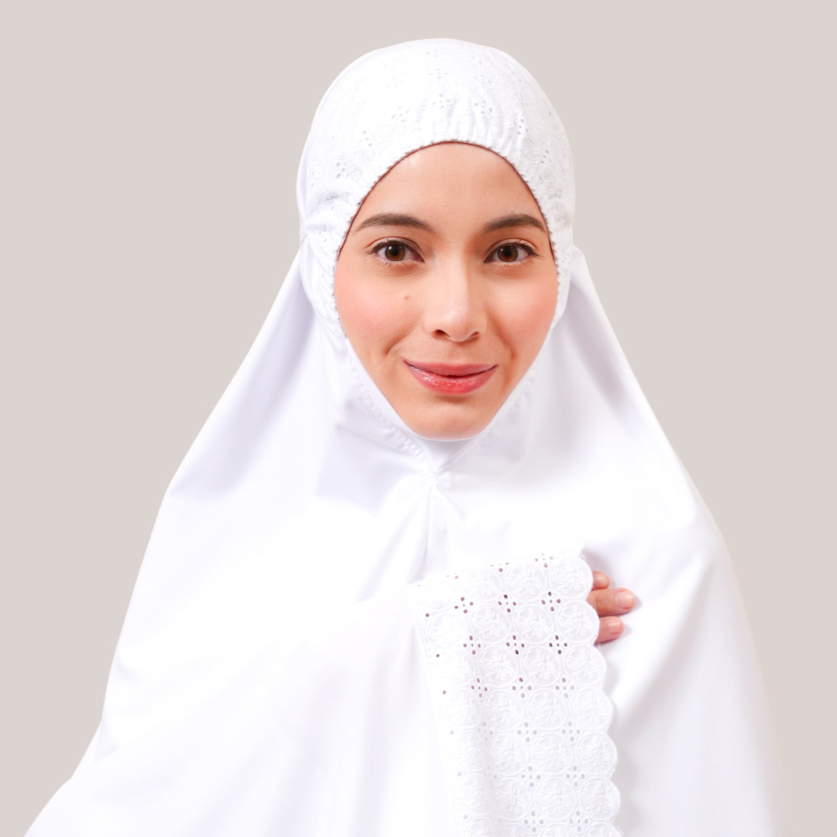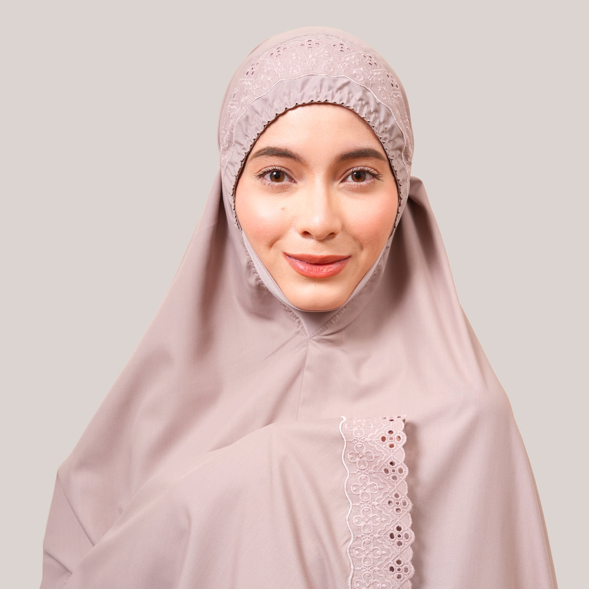 The gentle lace work is sewn with precision, the fabric is airy and cooling, and the fit hugs just right without leaving a mark. It’s the kind of telekung you reach for, again and again.