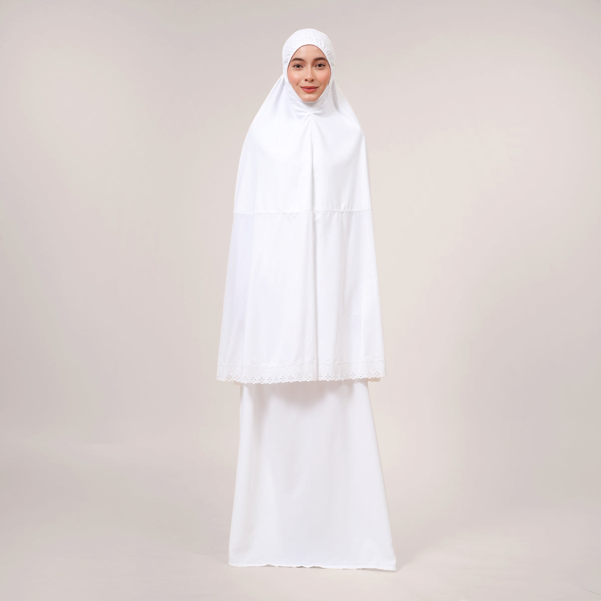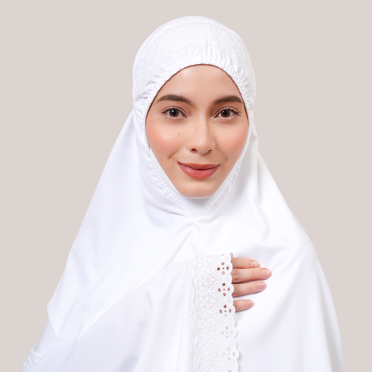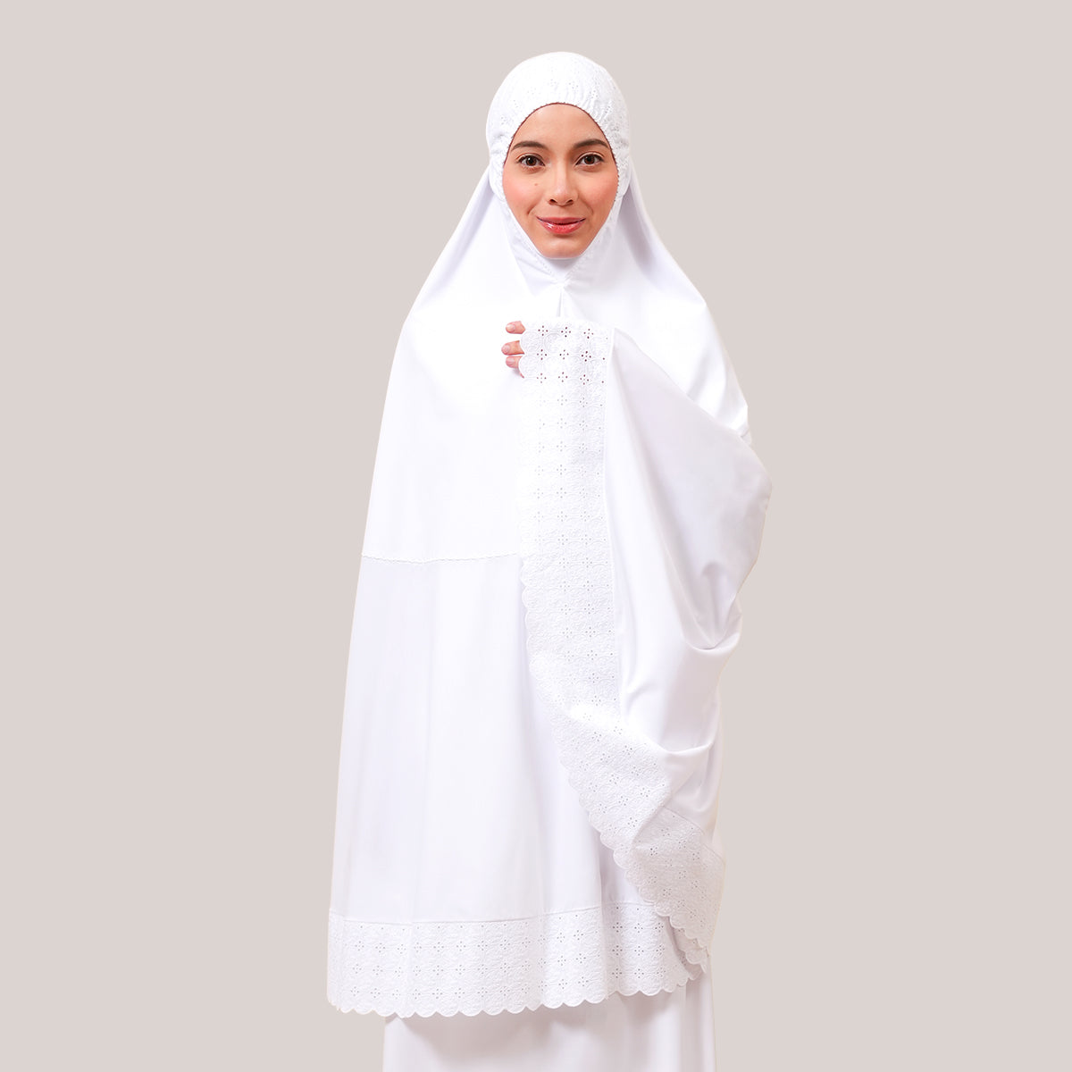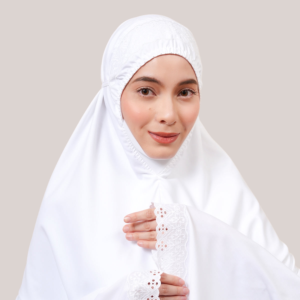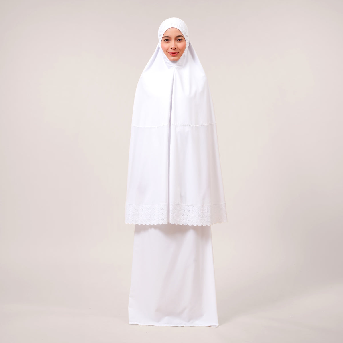 The gentle lace work is sewn with precision, the fabric is airy and cooling, and the fit hugs just right without leaving a mark. It’s the kind of telekung you reach for, again and again.