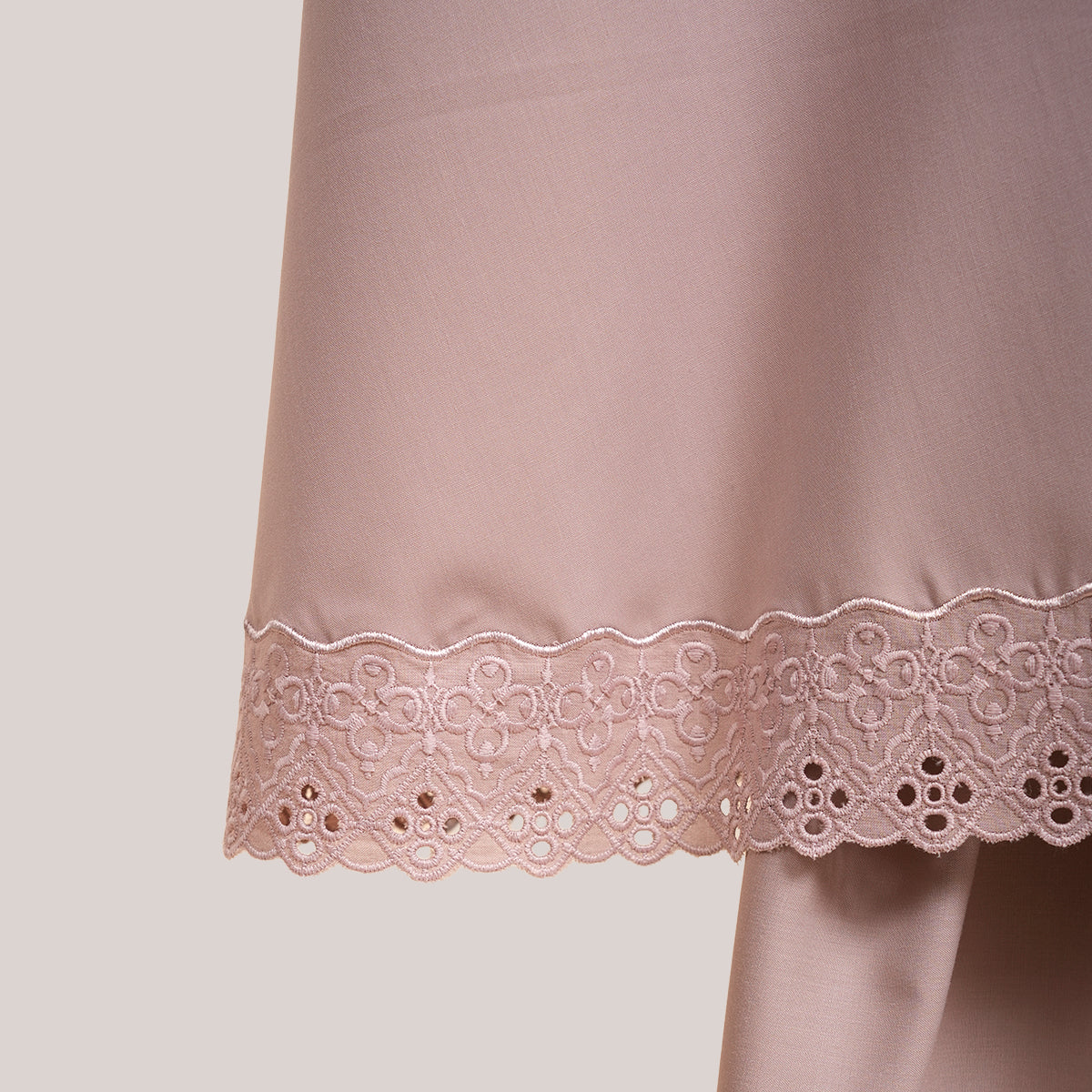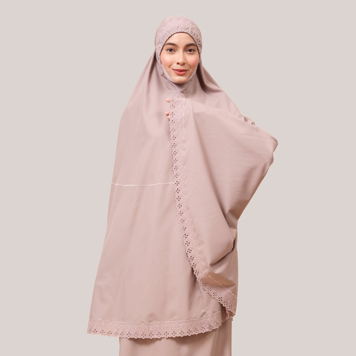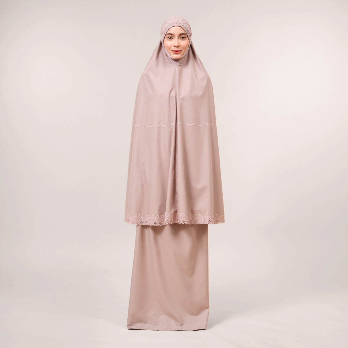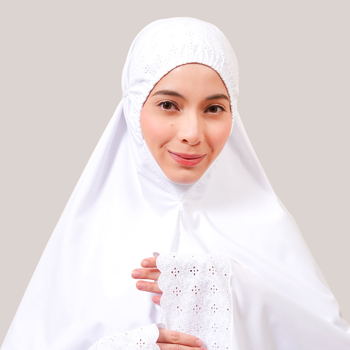 The gentle lace work is sewn with precision, the fabric is airy and cooling, and the fit hugs just right without leaving a mark. It’s the kind of telekung you reach for, again and again.