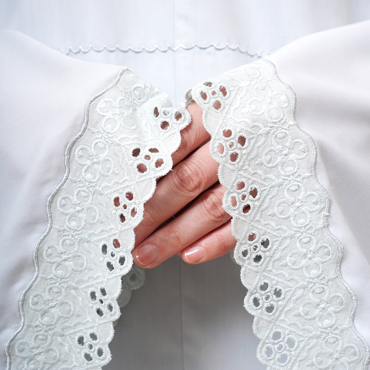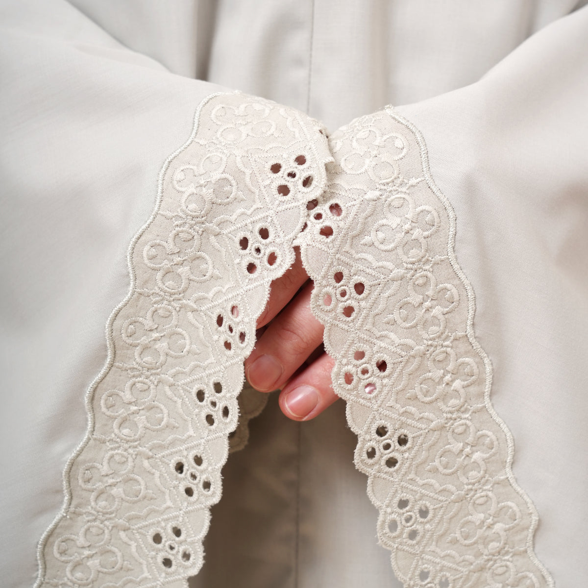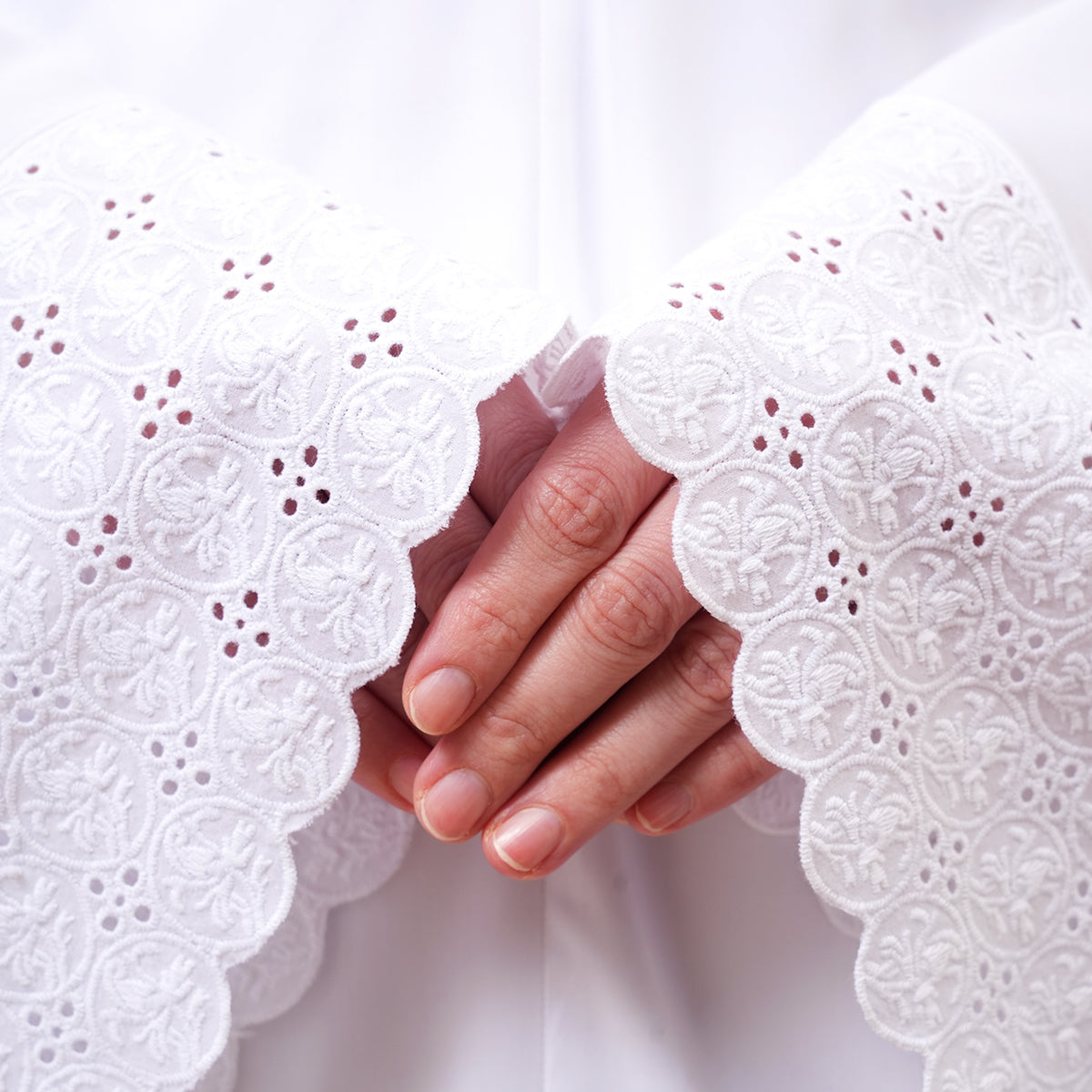 With durable material that doesn’t wrinkle easily and lacework that adds elegance without being overdone, it’s for those who seek balance in their prayerwear.