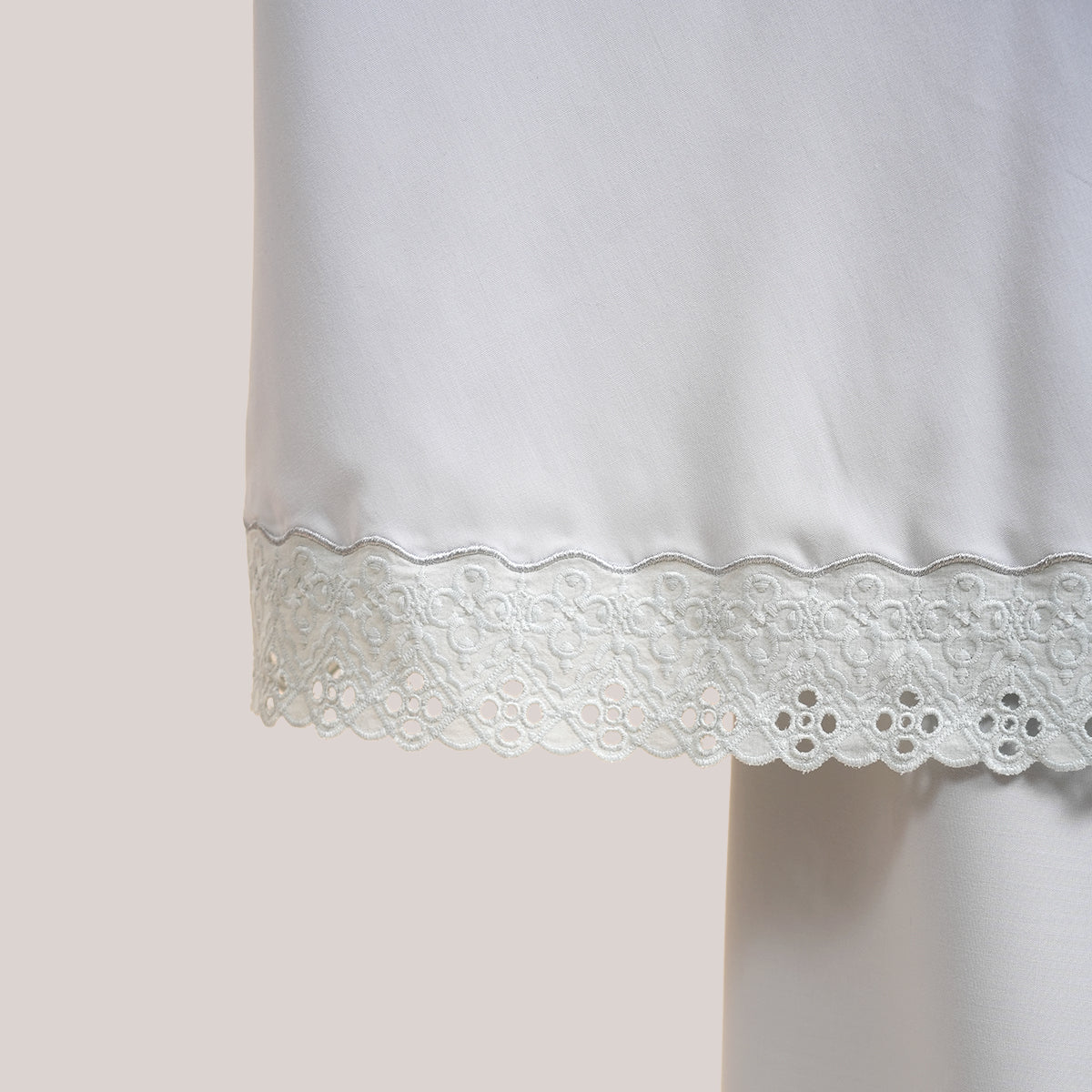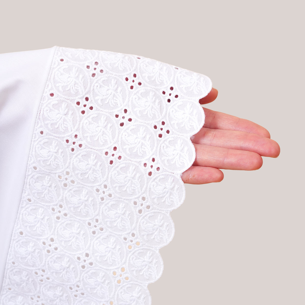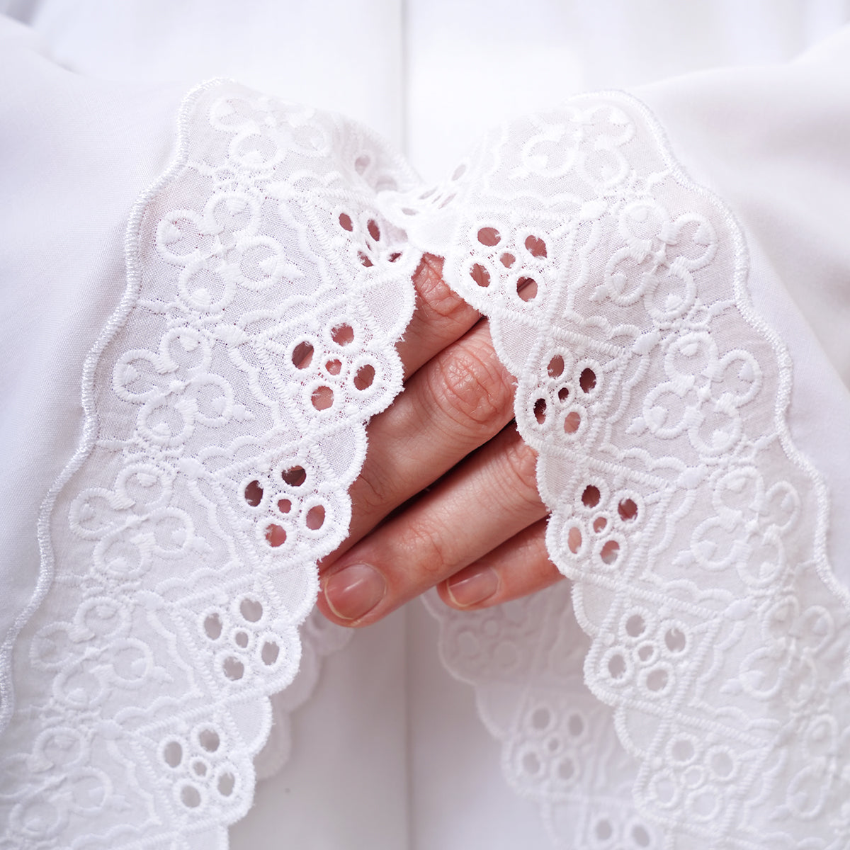 With durable material that doesn’t wrinkle easily and lacework that adds elegance without being overdone, it’s for those who seek balance in their prayerwear.