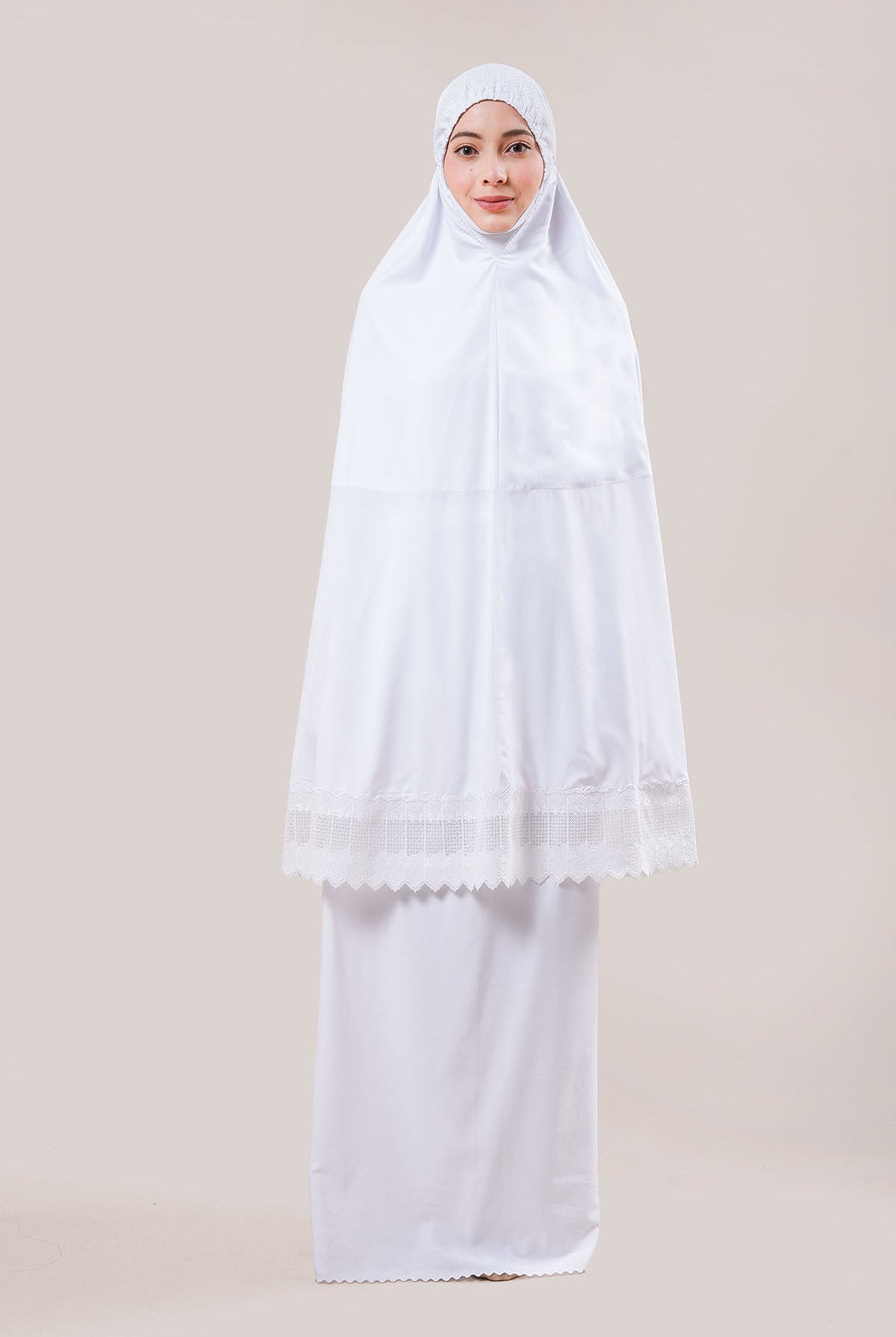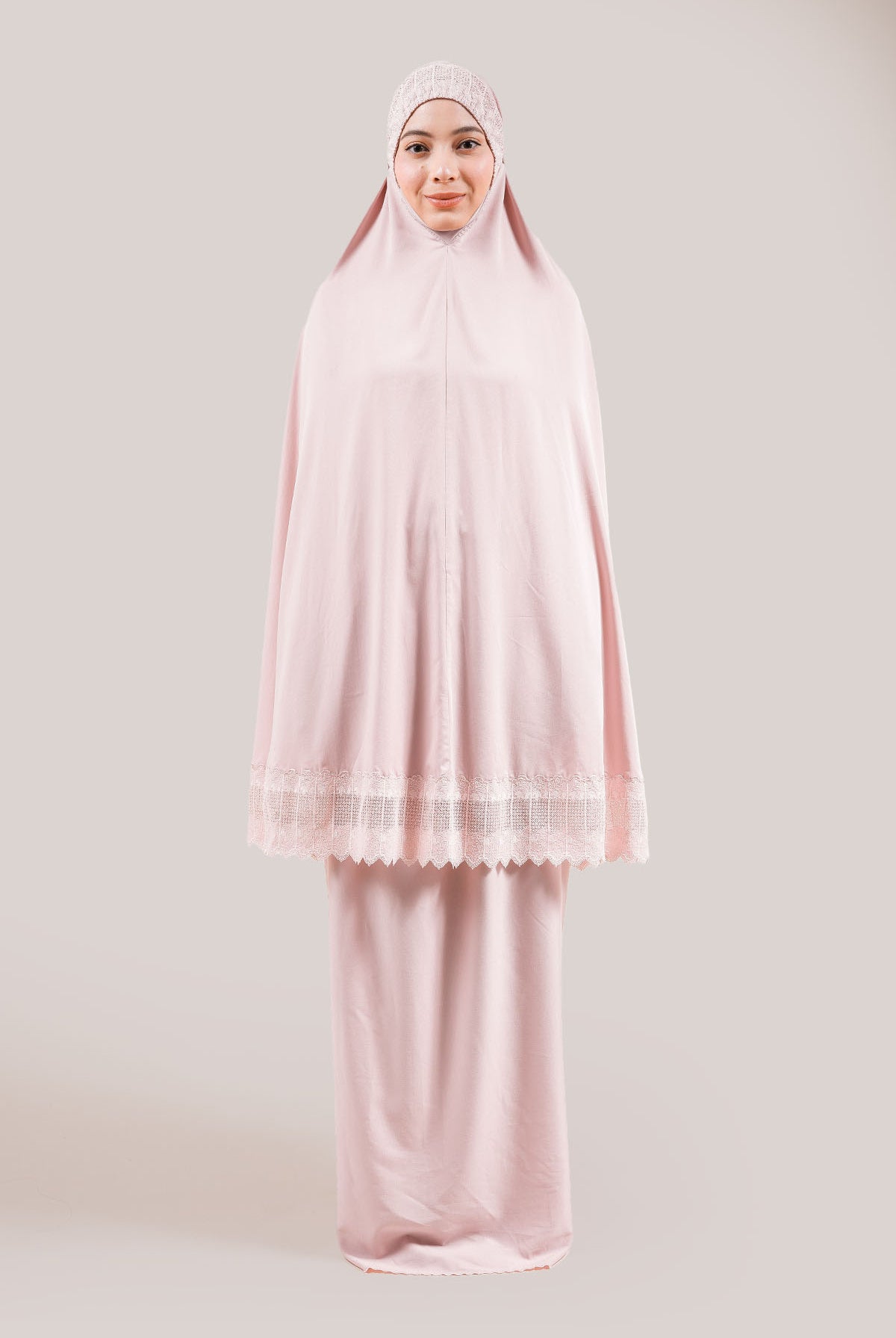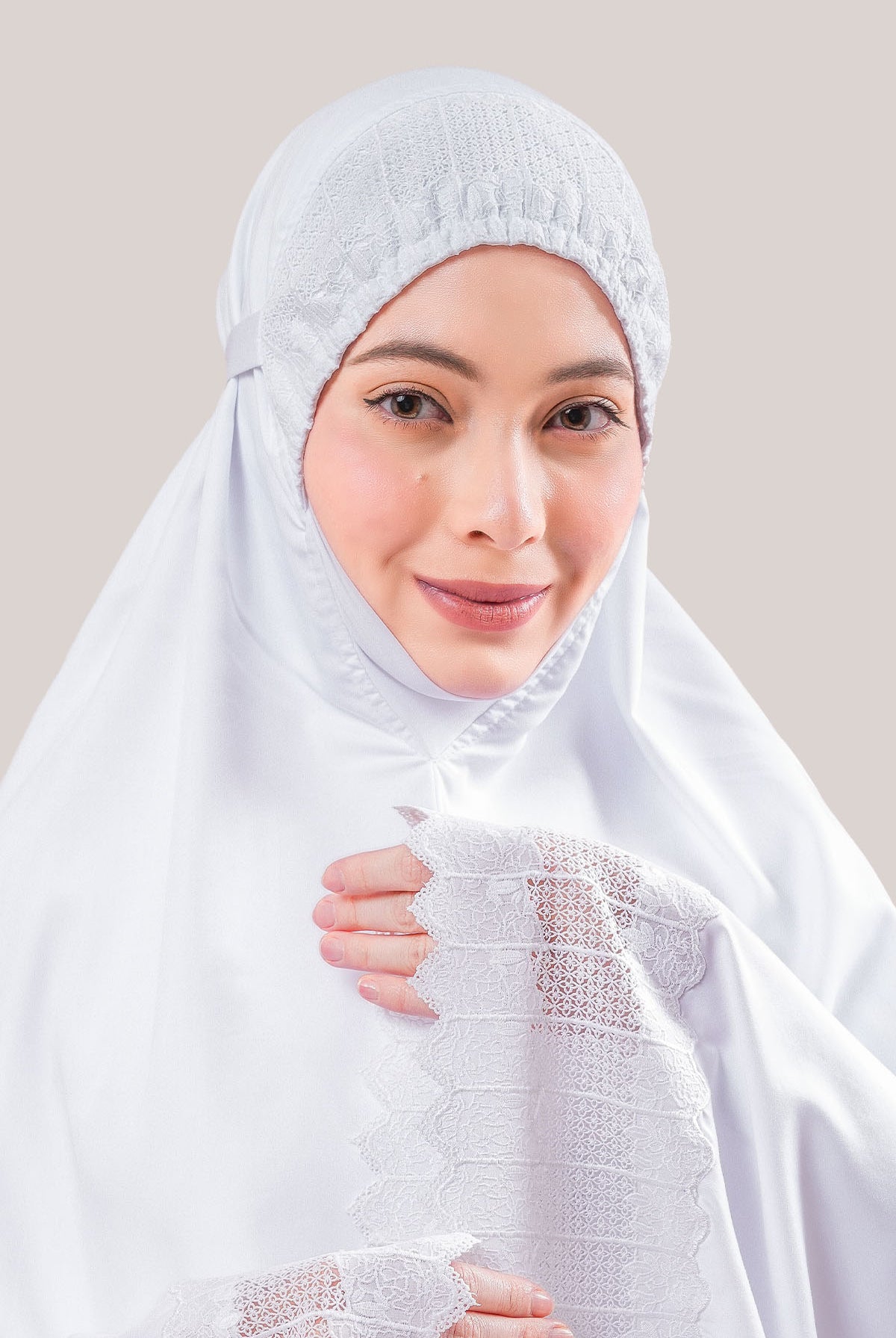 The gentle lace work is sewn with precision, the fabric is airy and cooling, and the fit hugs just right without leaving a mark. It’s the kind of telekung you reach for, again and again.