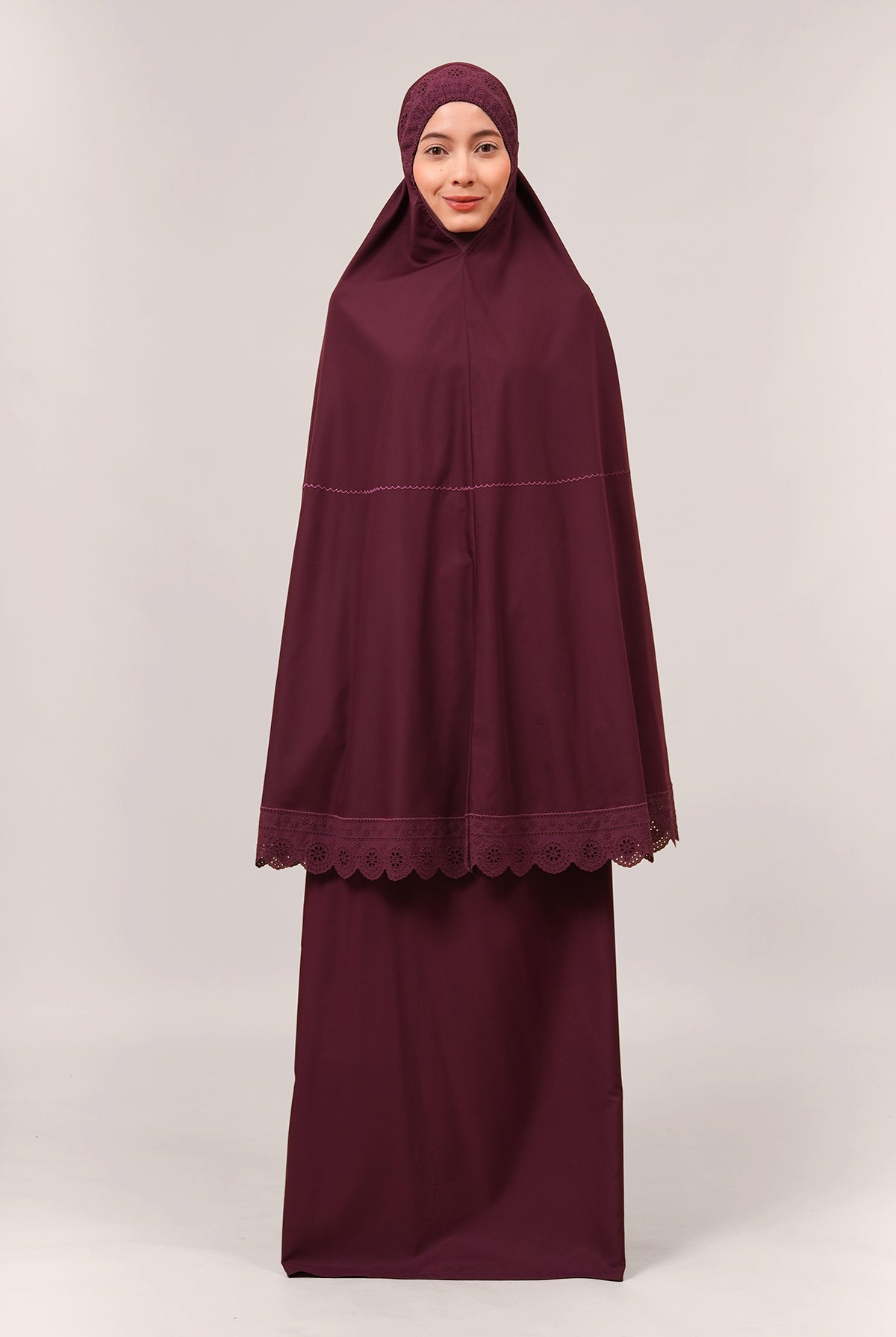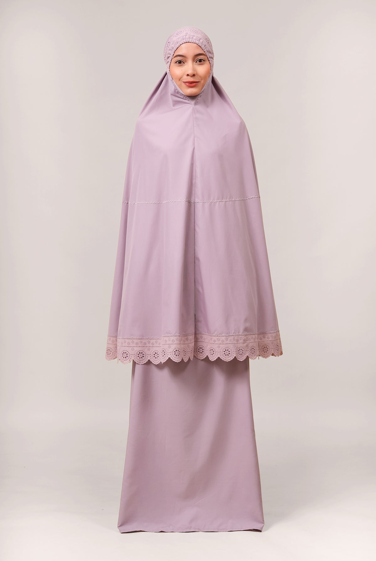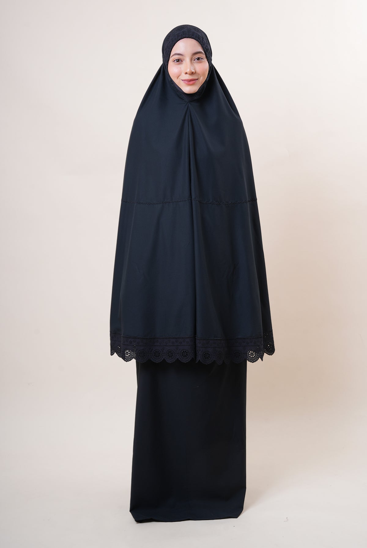 The gentle lace work is sewn with precision, the fabric is airy and cooling, and the fit hugs just right without leaving a mark. It’s the kind of telekung you reach for, again and again.