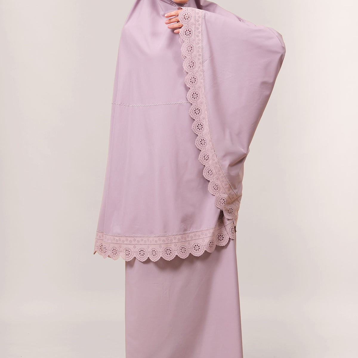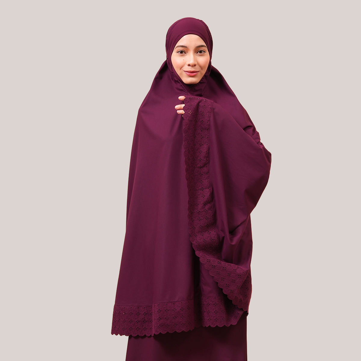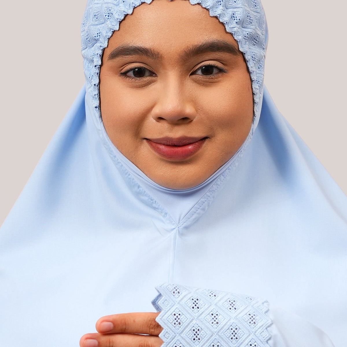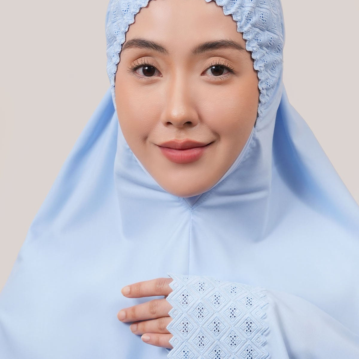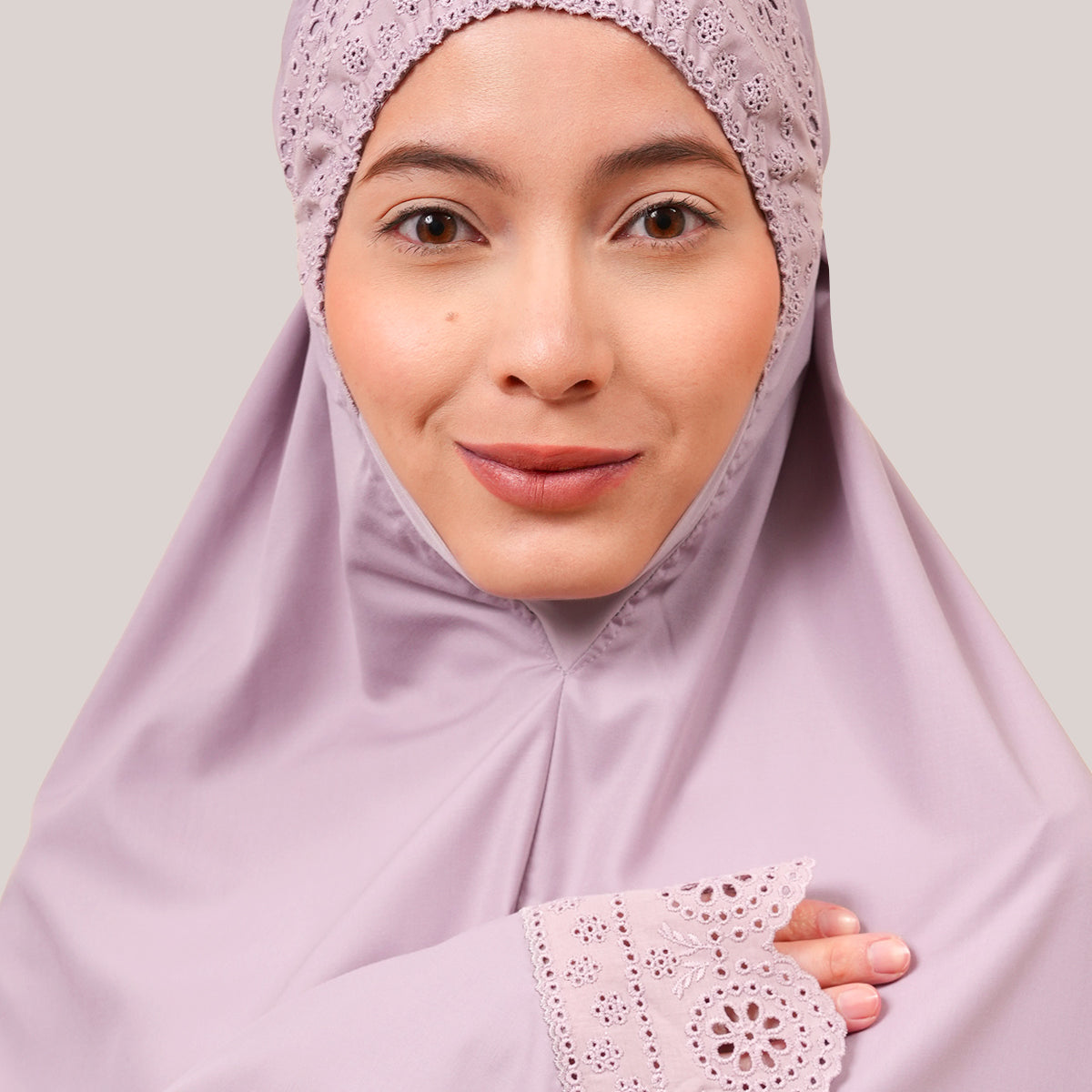 The gentle lace work is sewn with precision, the fabric is airy and cooling, and the fit hugs just right without leaving a mark. It’s the kind of telekung you reach for, again and again.