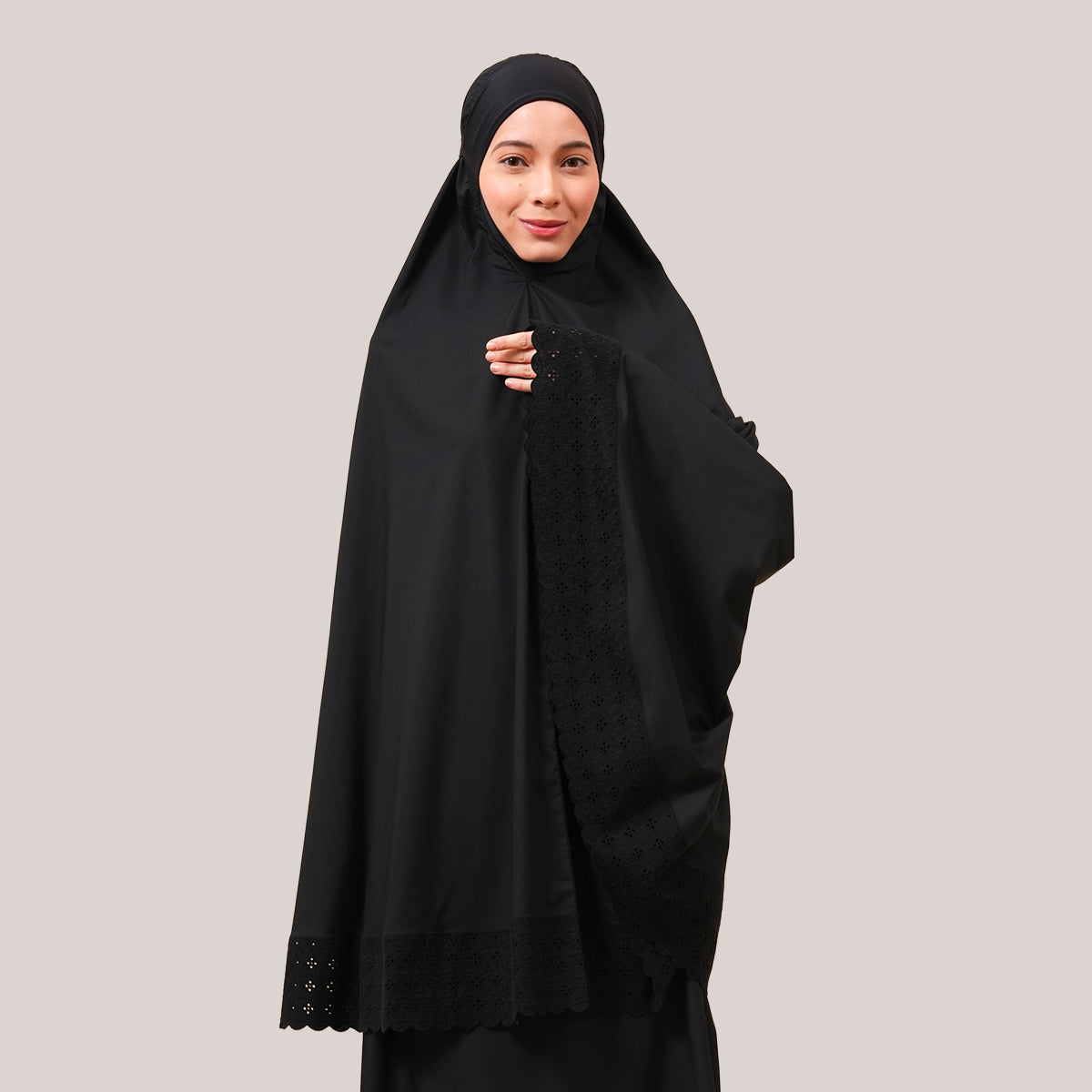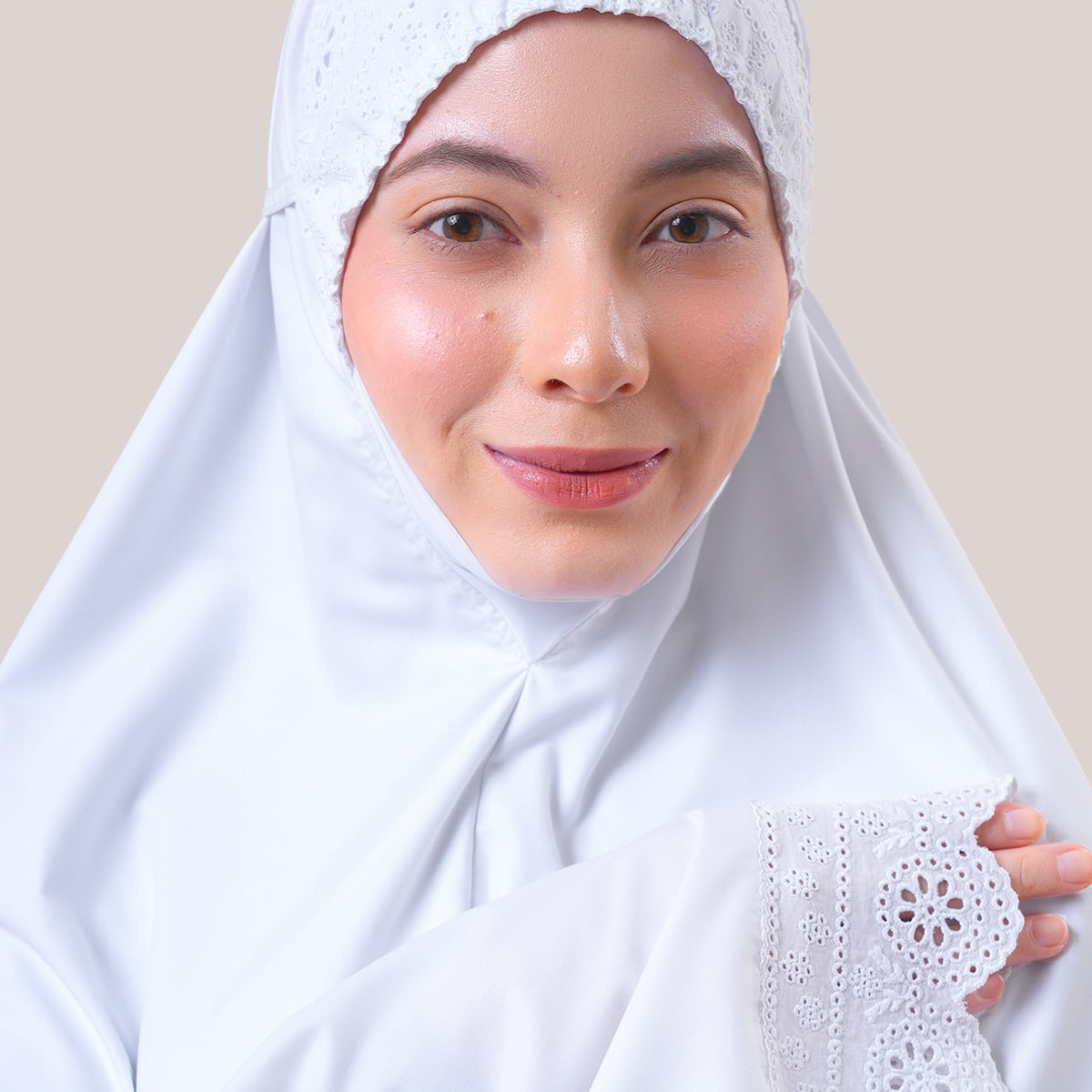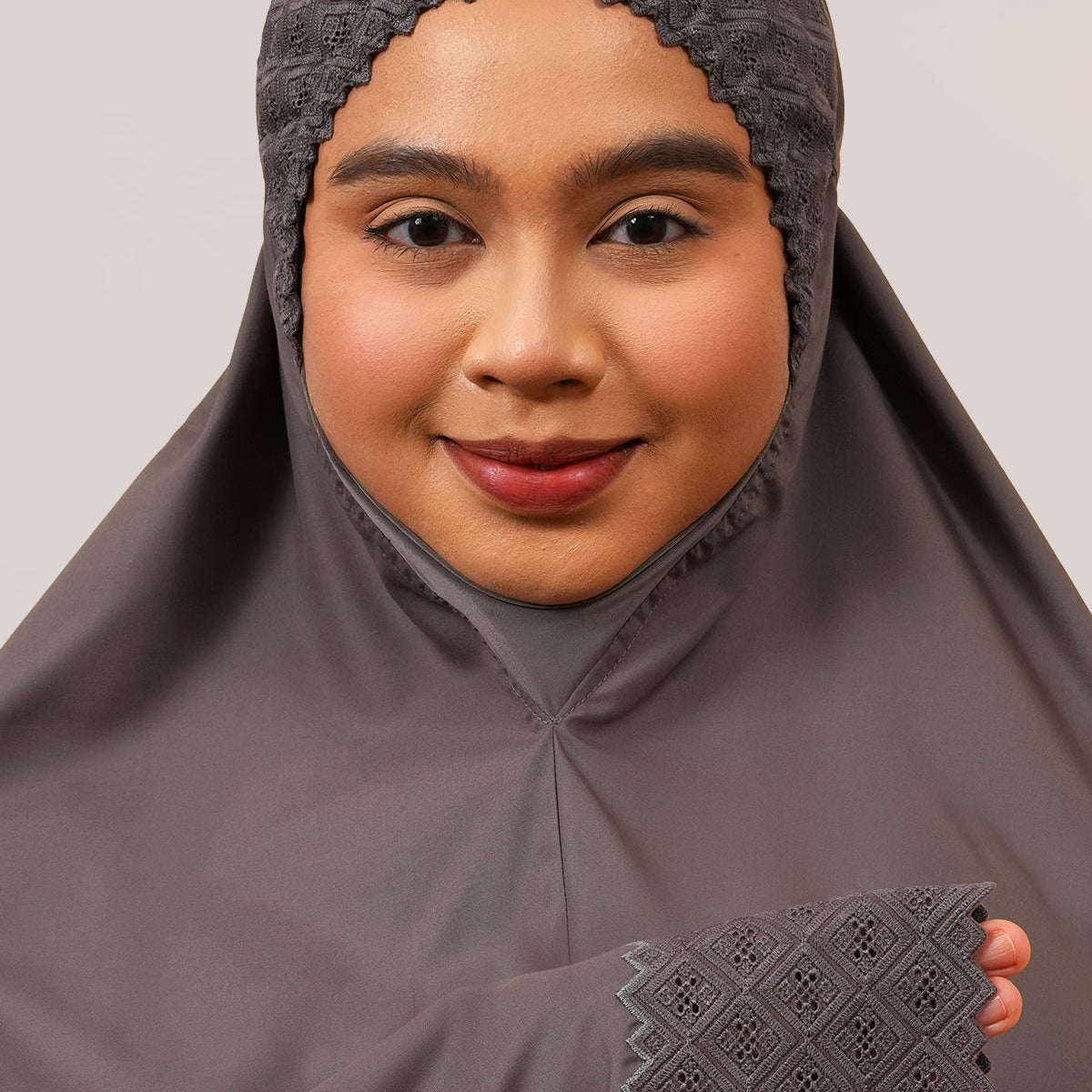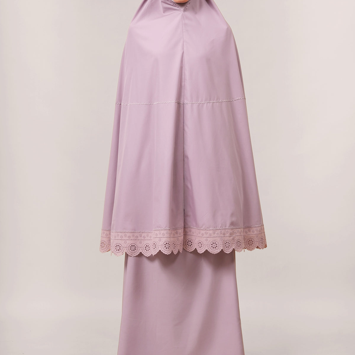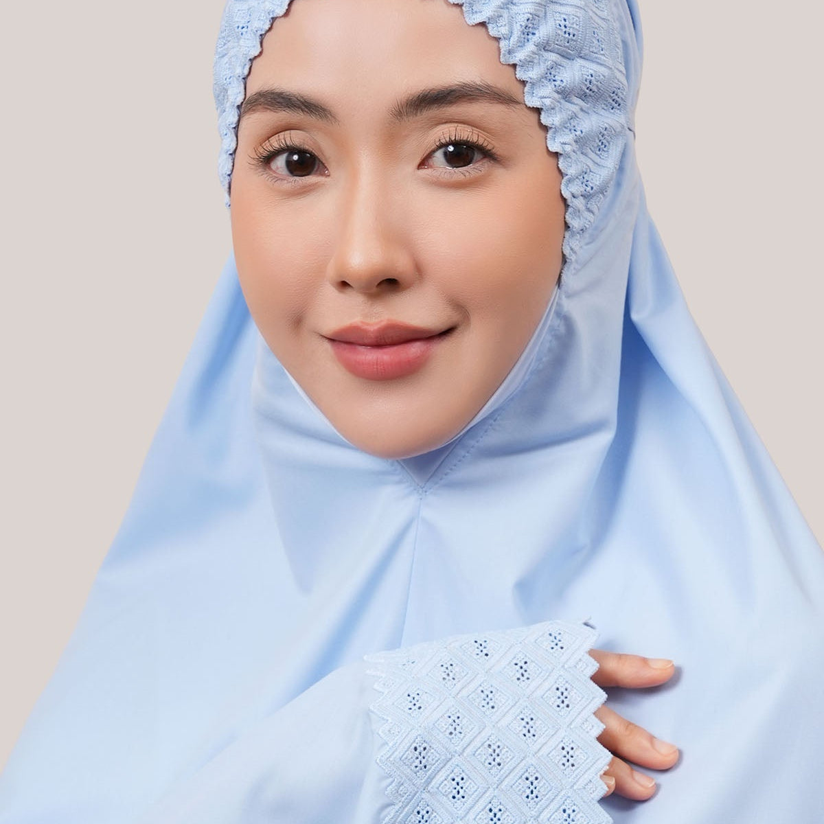 The gentle lace work is sewn with precision, the fabric is airy and cooling, and the fit hugs just right without leaving a mark. It’s the kind of telekung you reach for, again and again.