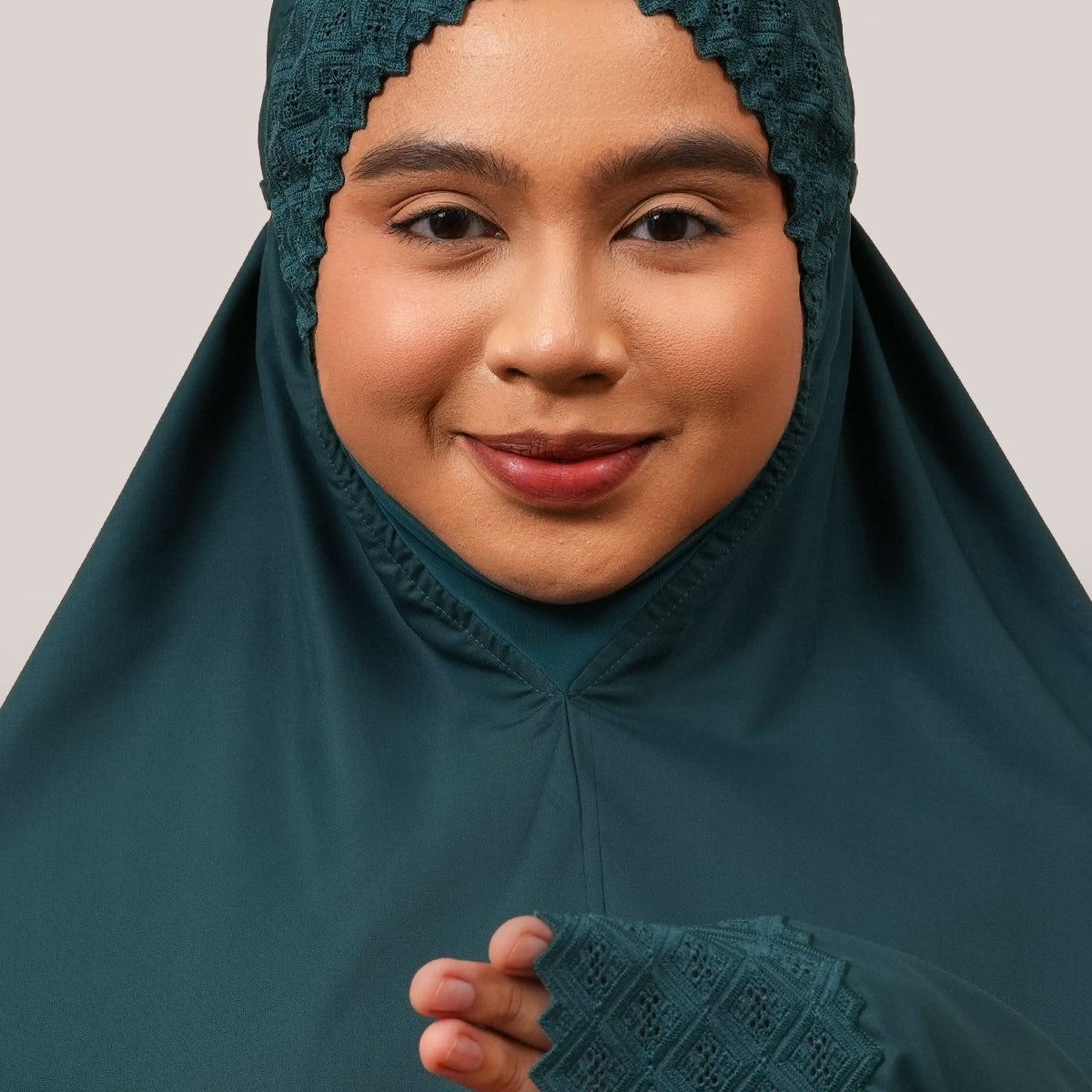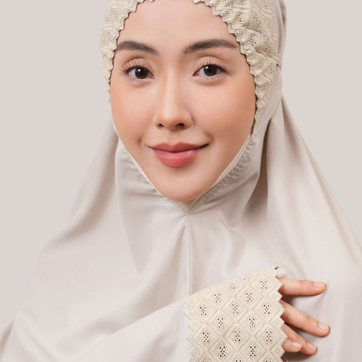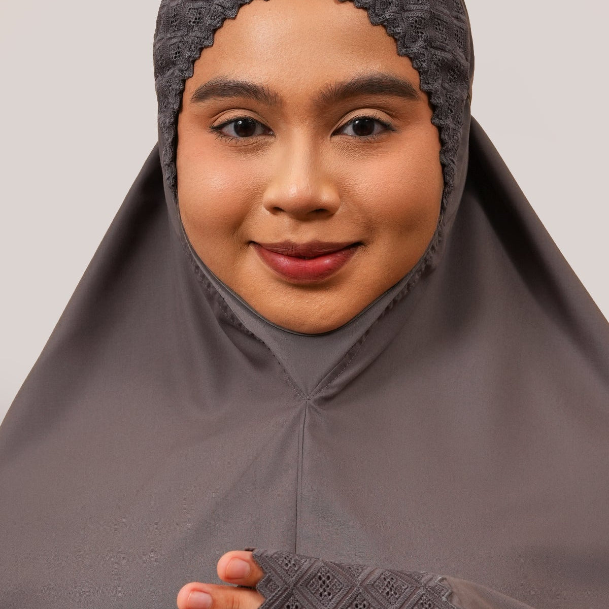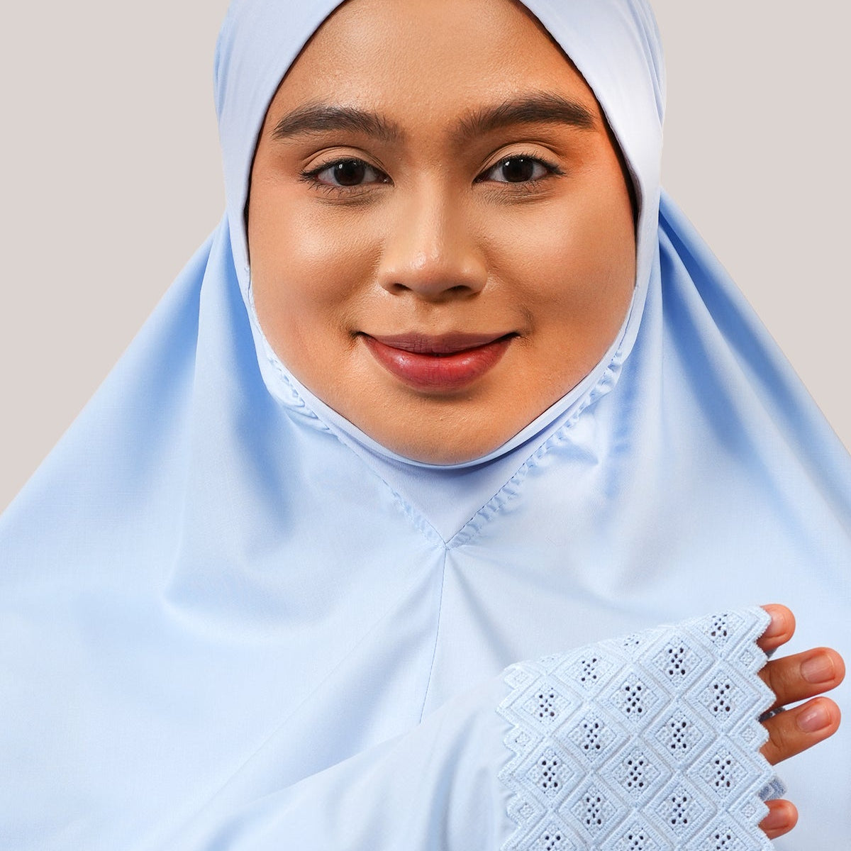 The gentle lace work is sewn with precision, the fabric is airy and cooling, and the fit hugs just right without leaving a mark. It’s the kind of telekung you reach for, again and again.