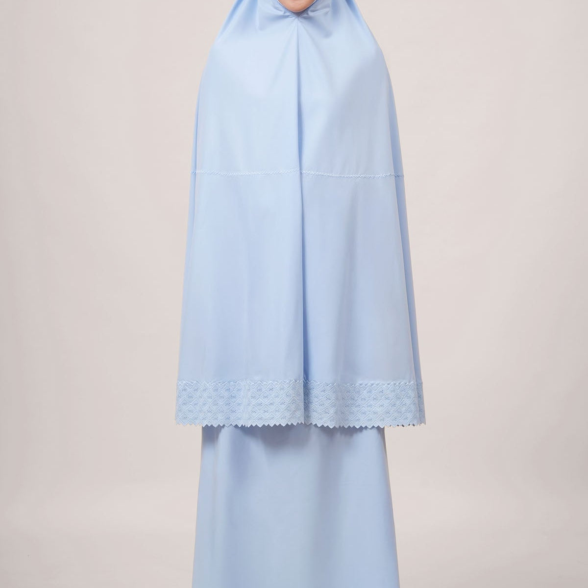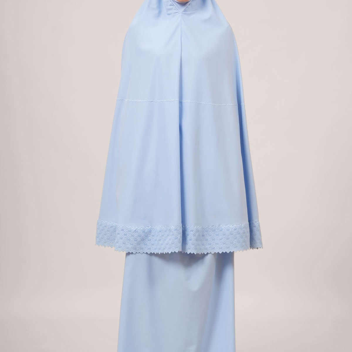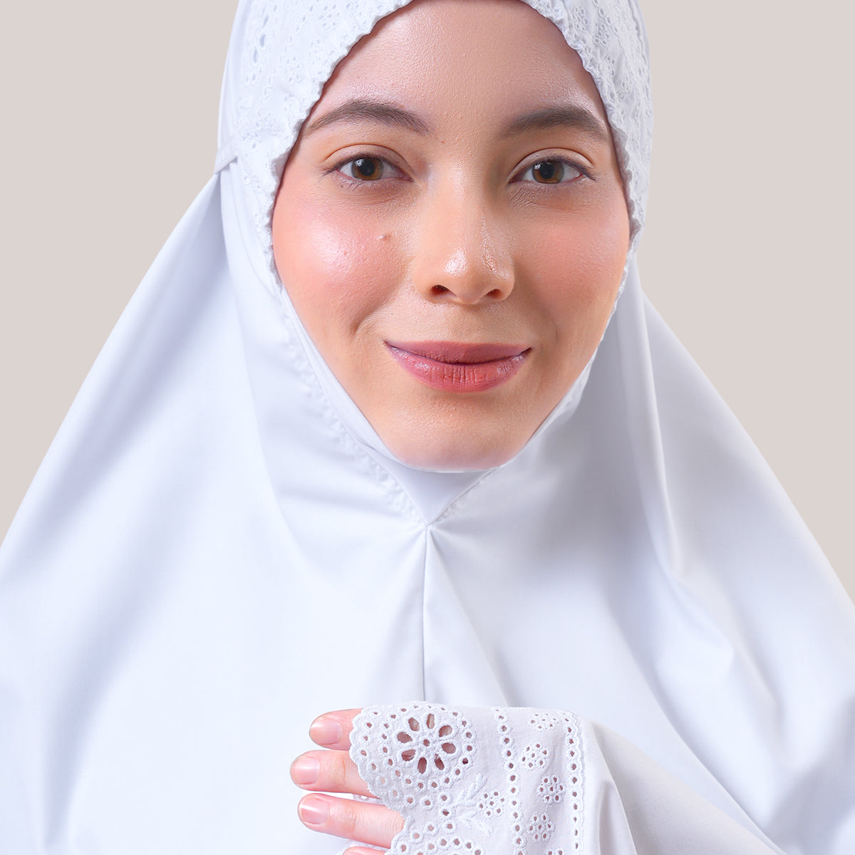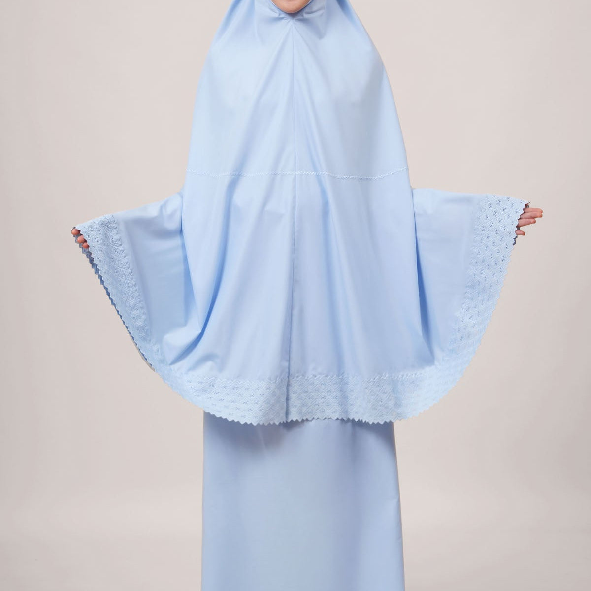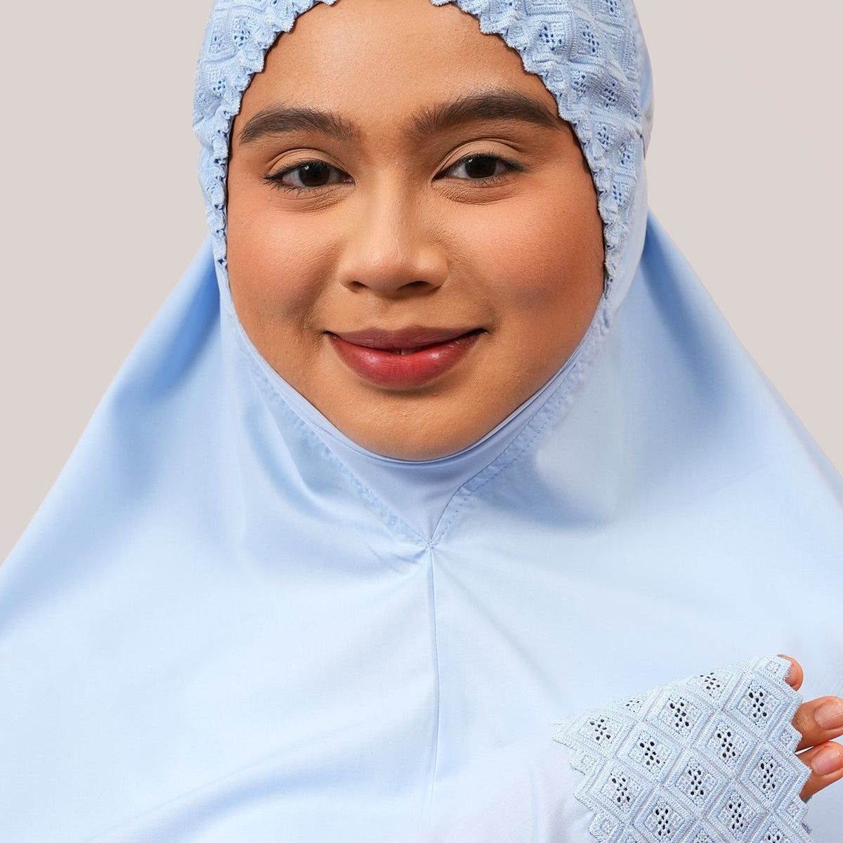 The gentle lace work is sewn with precision, the fabric is airy and cooling, and the fit hugs just right without leaving a mark. It’s the kind of telekung you reach for, again and again.