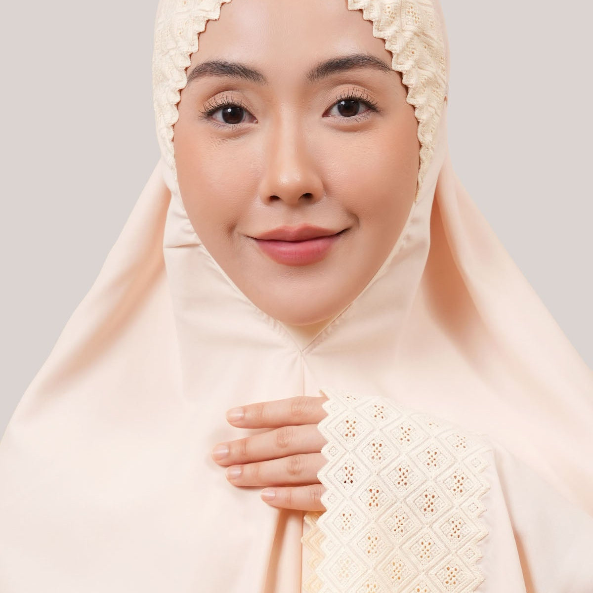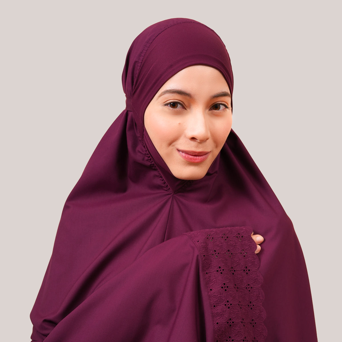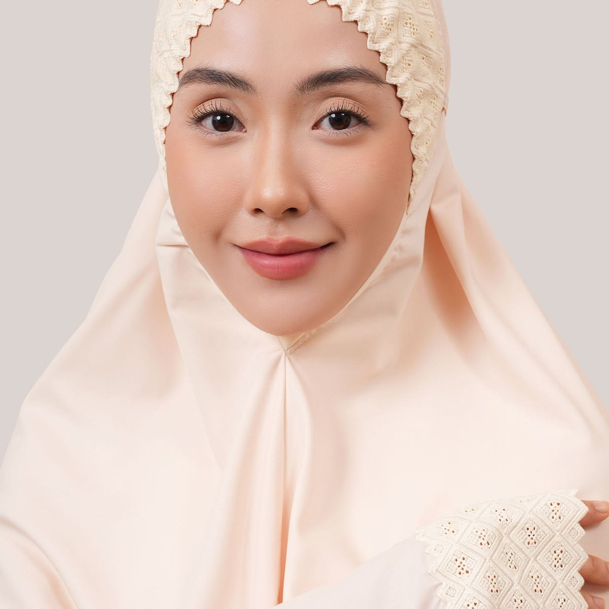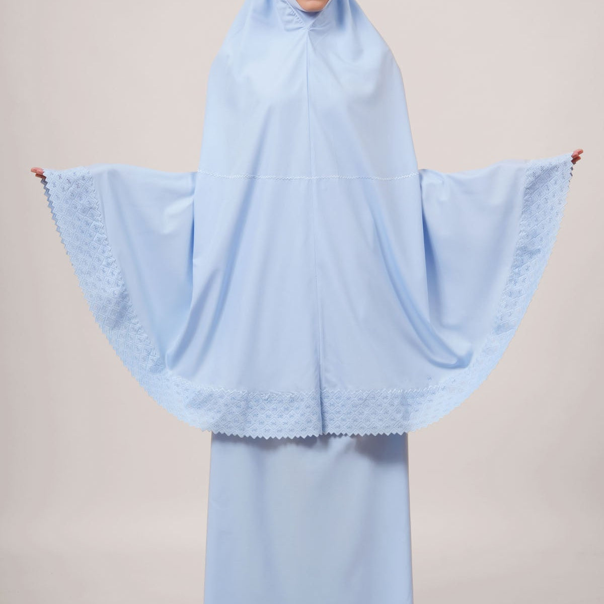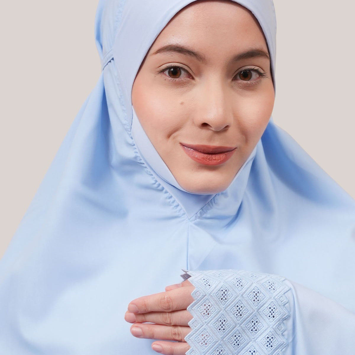The gentle lace work is sewn with precision, the fabric is airy and cooling, and the fit hugs just right without leaving a mark. It’s the kind of telekung you reach for, again and again.