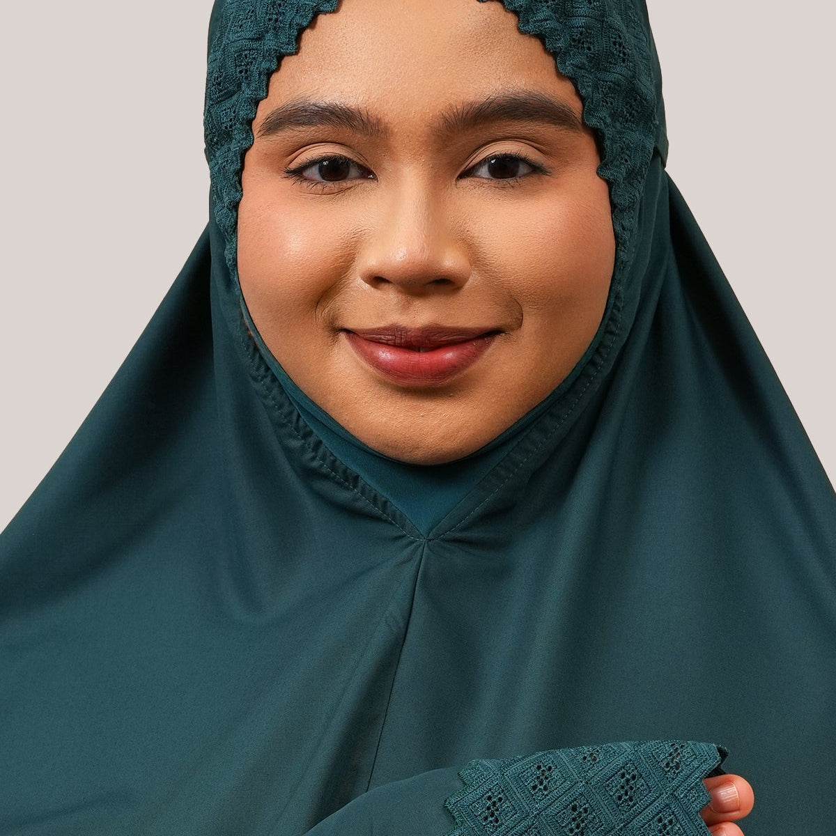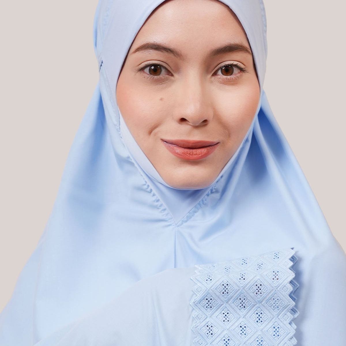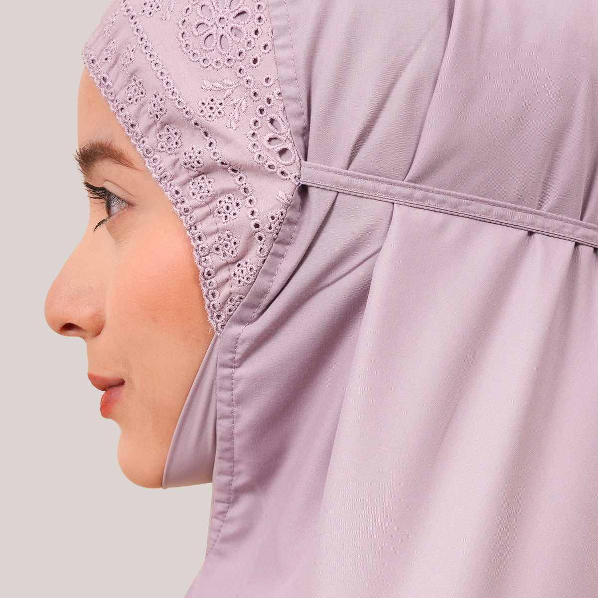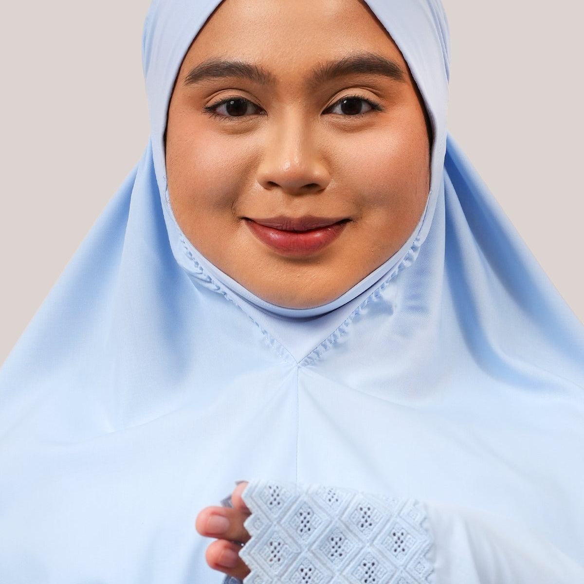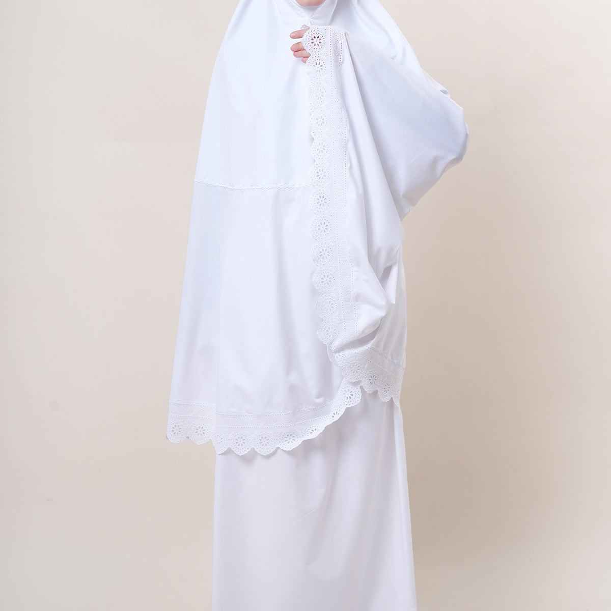 The gentle lace work is sewn with precision, the fabric is airy and cooling, and the fit hugs just right without leaving a mark. It’s the kind of telekung you reach for, again and again.