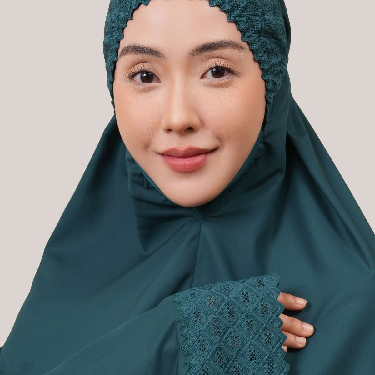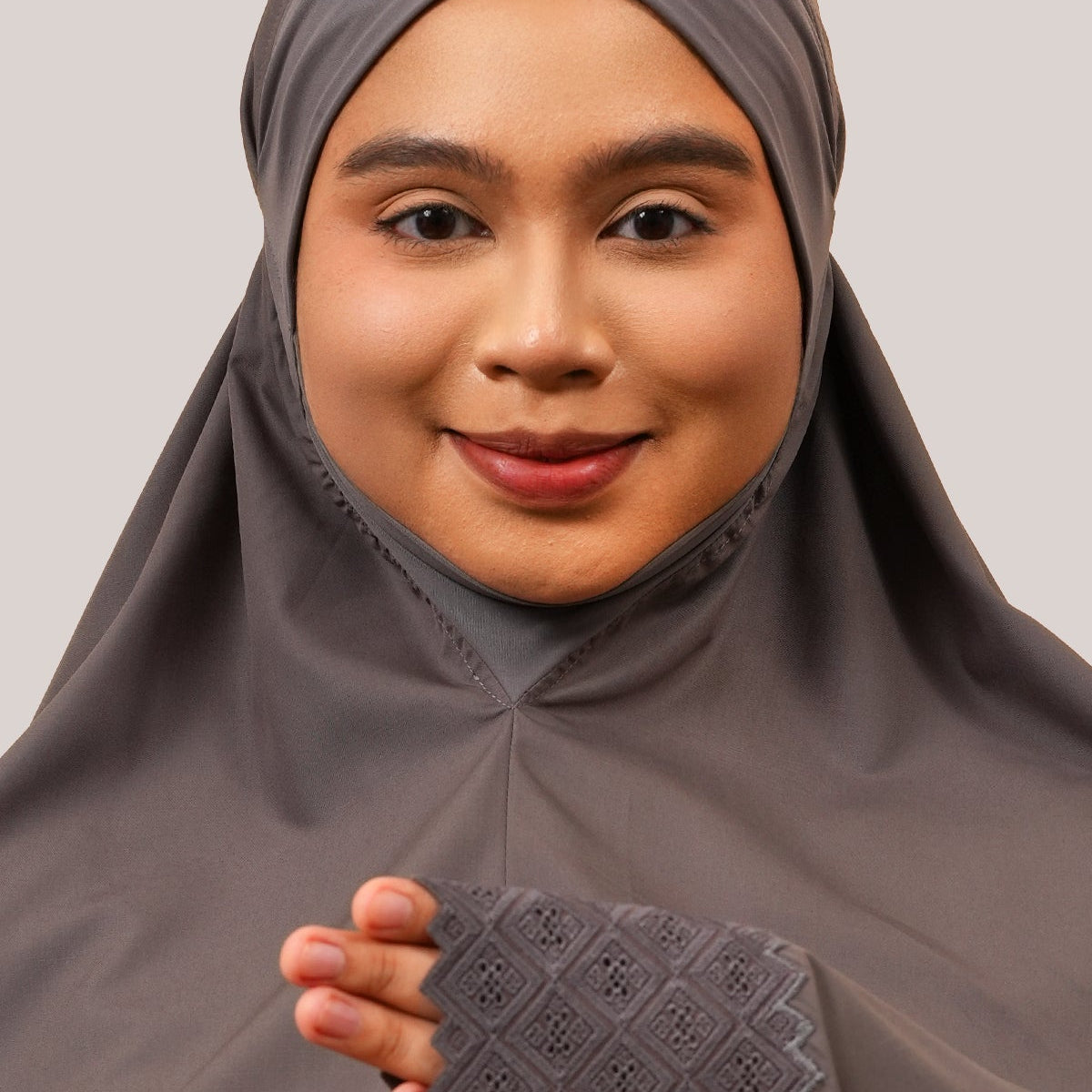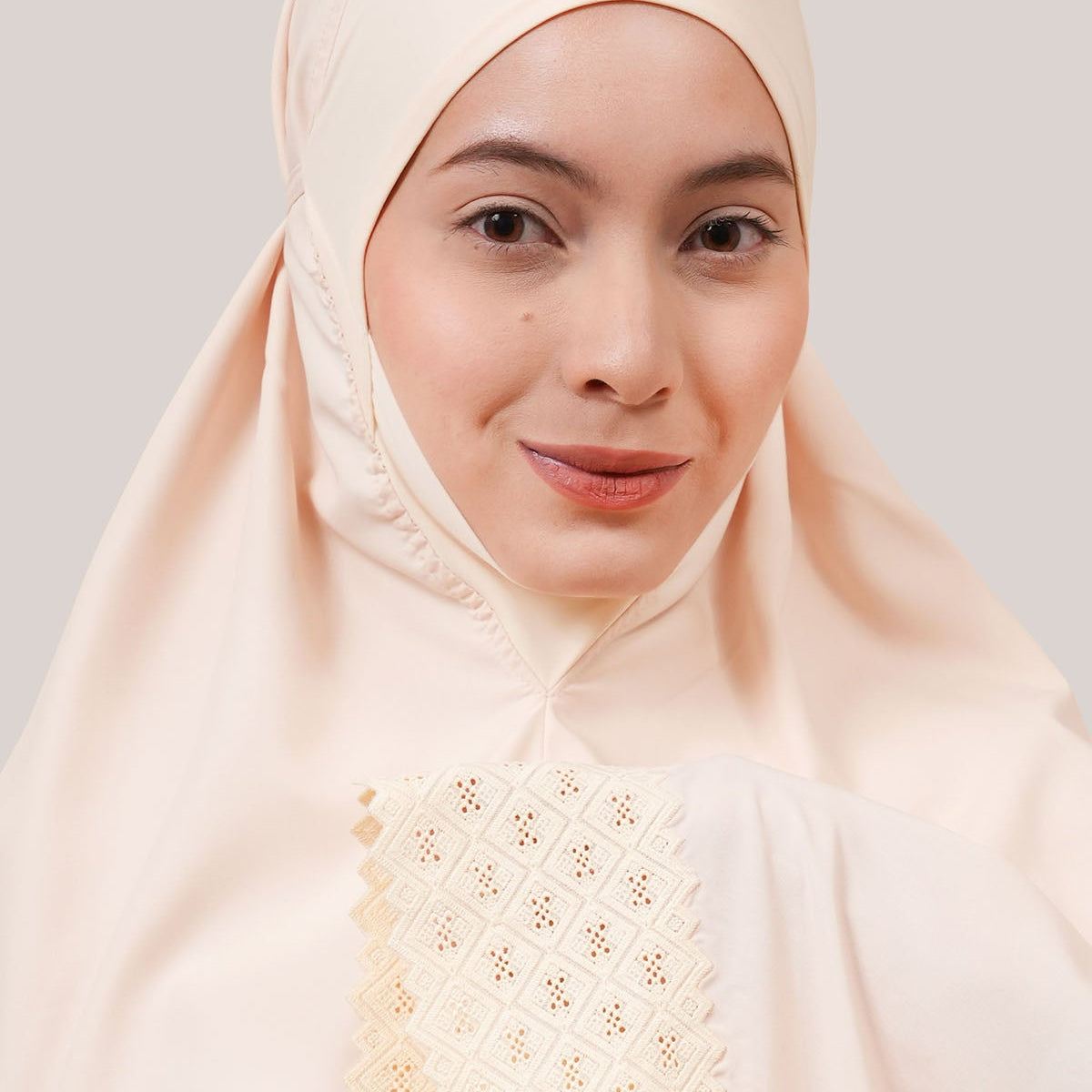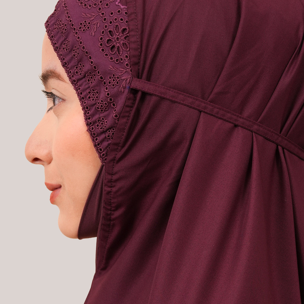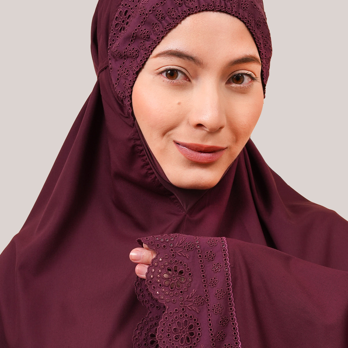 The gentle lace work is sewn with precision, the fabric is airy and cooling, and the fit hugs just right without leaving a mark. It’s the kind of telekung you reach for, again and again.