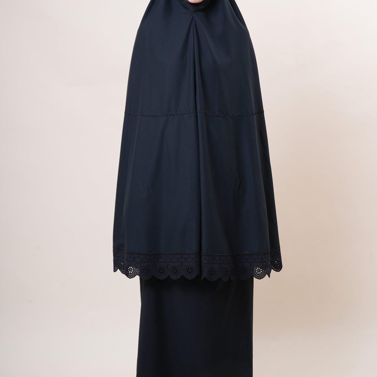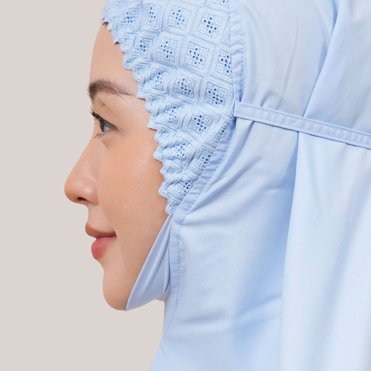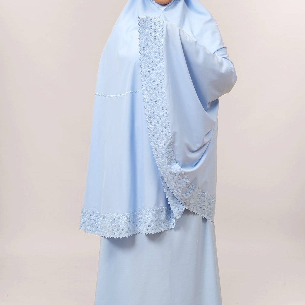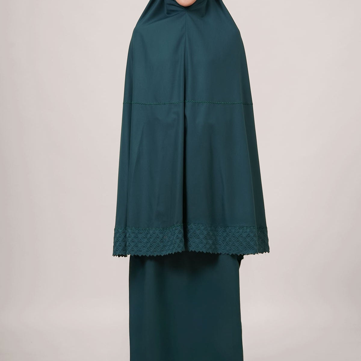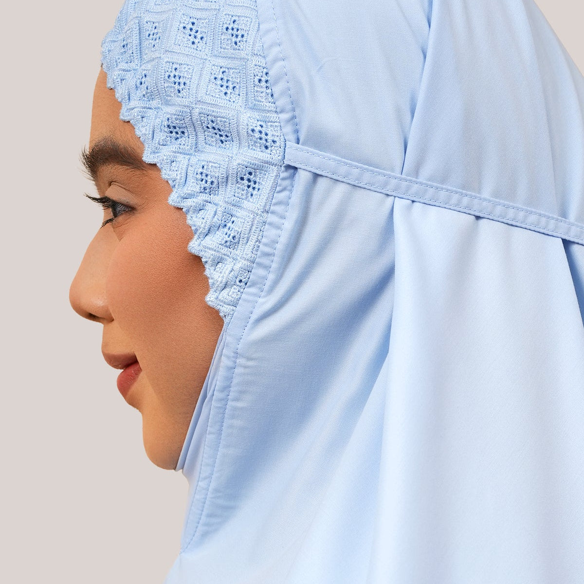 The gentle lace work is sewn with precision, the fabric is airy and cooling, and the fit hugs just right without leaving a mark. It’s the kind of telekung you reach for, again and again.