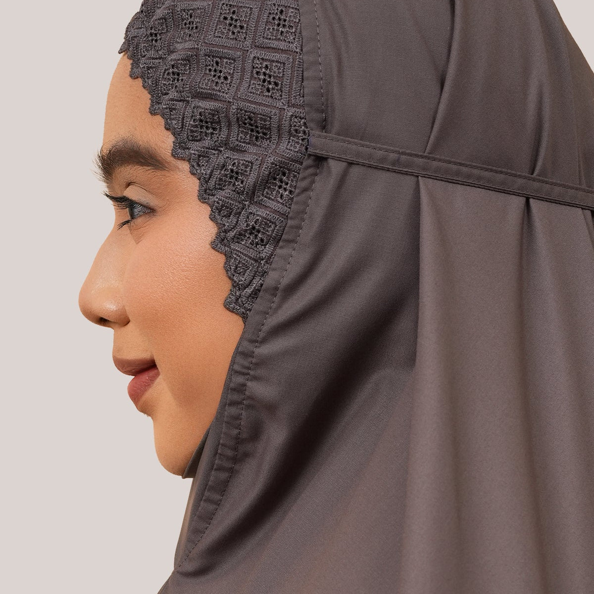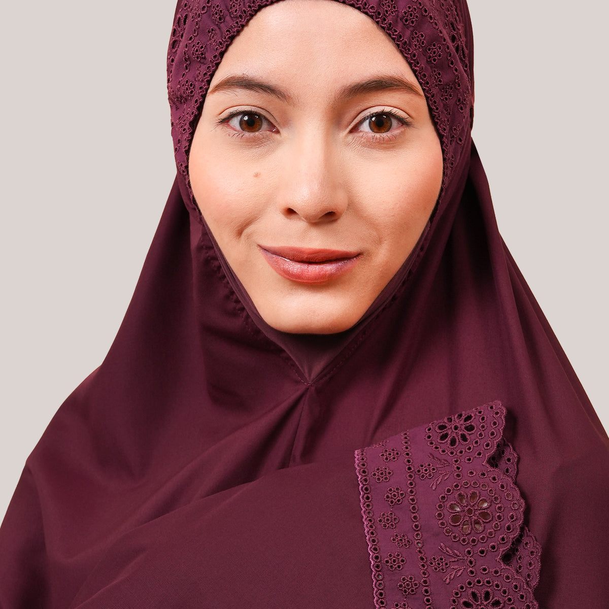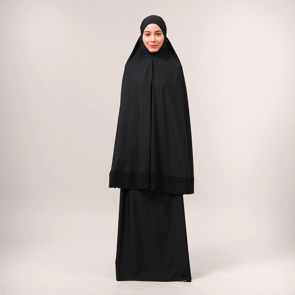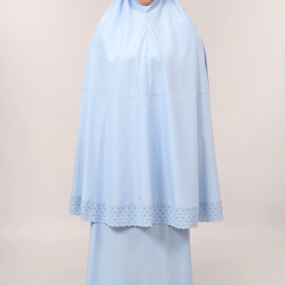 The gentle lace work is sewn with precision, the fabric is airy and cooling, and the fit hugs just right without leaving a mark. It’s the kind of telekung you reach for, again and again.