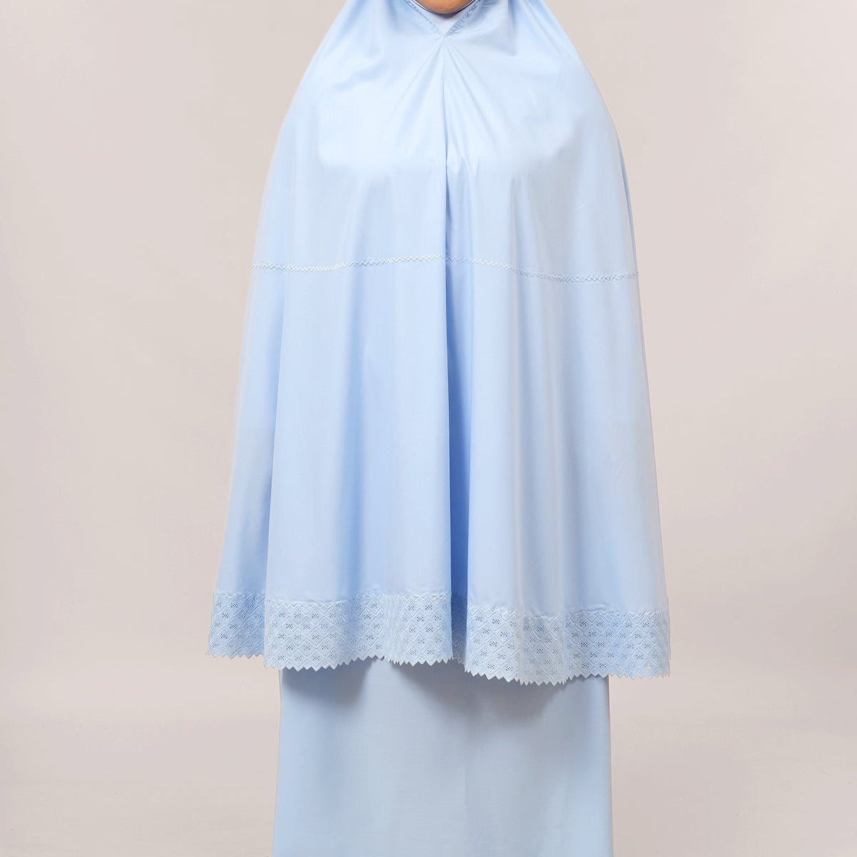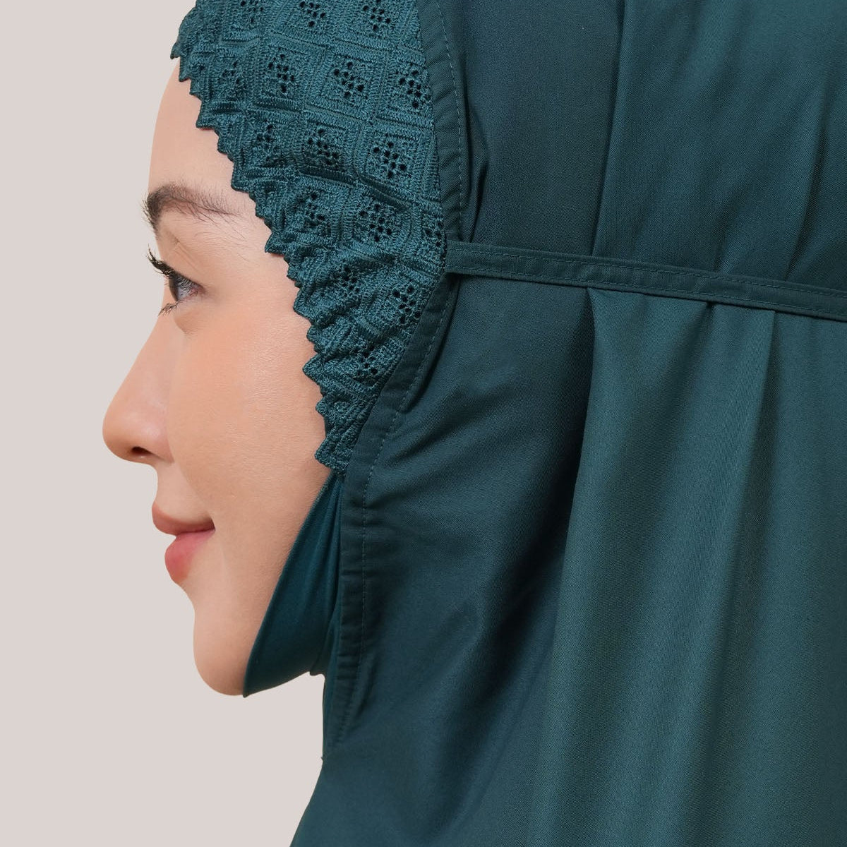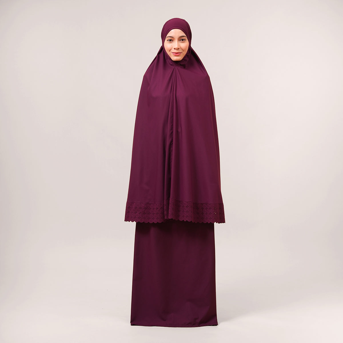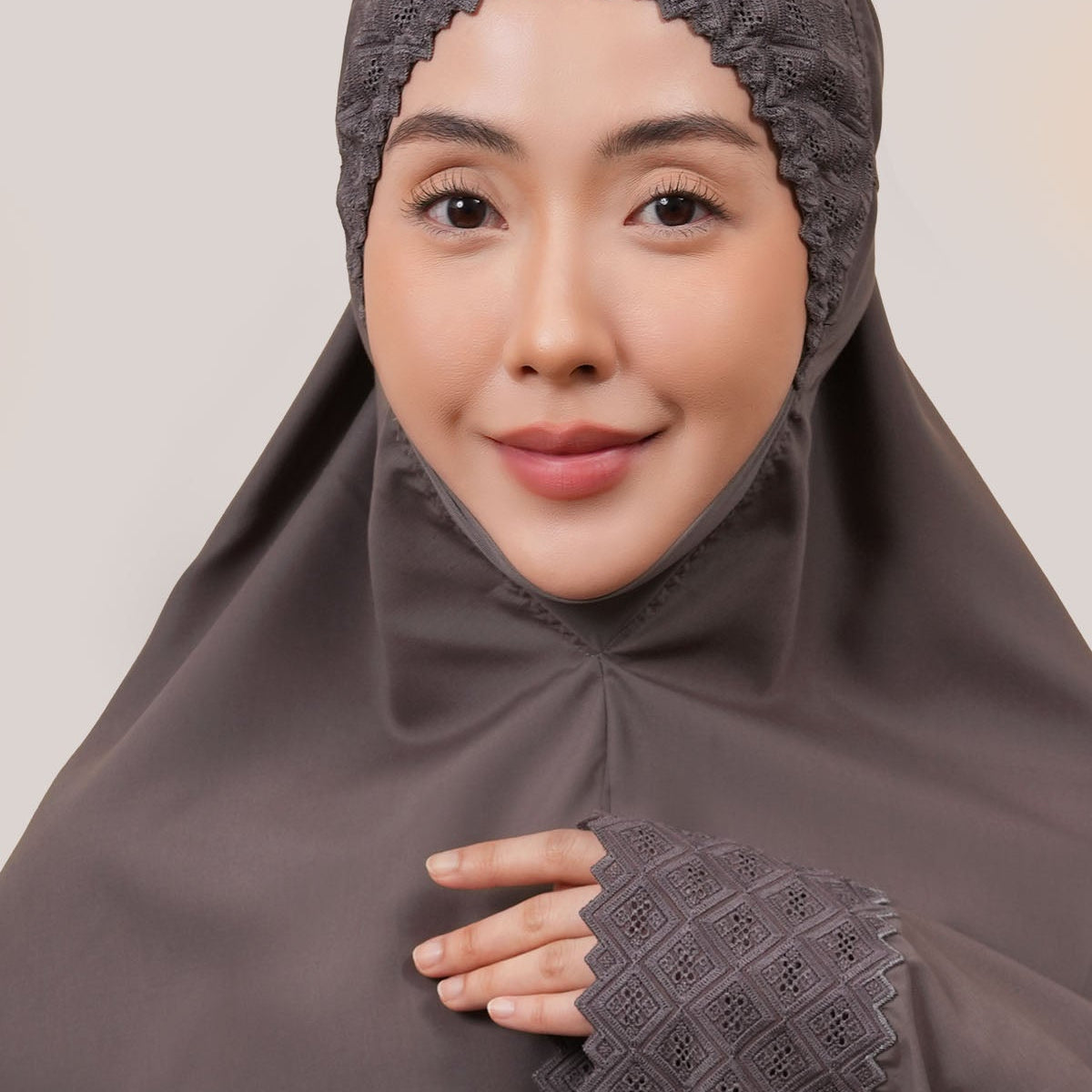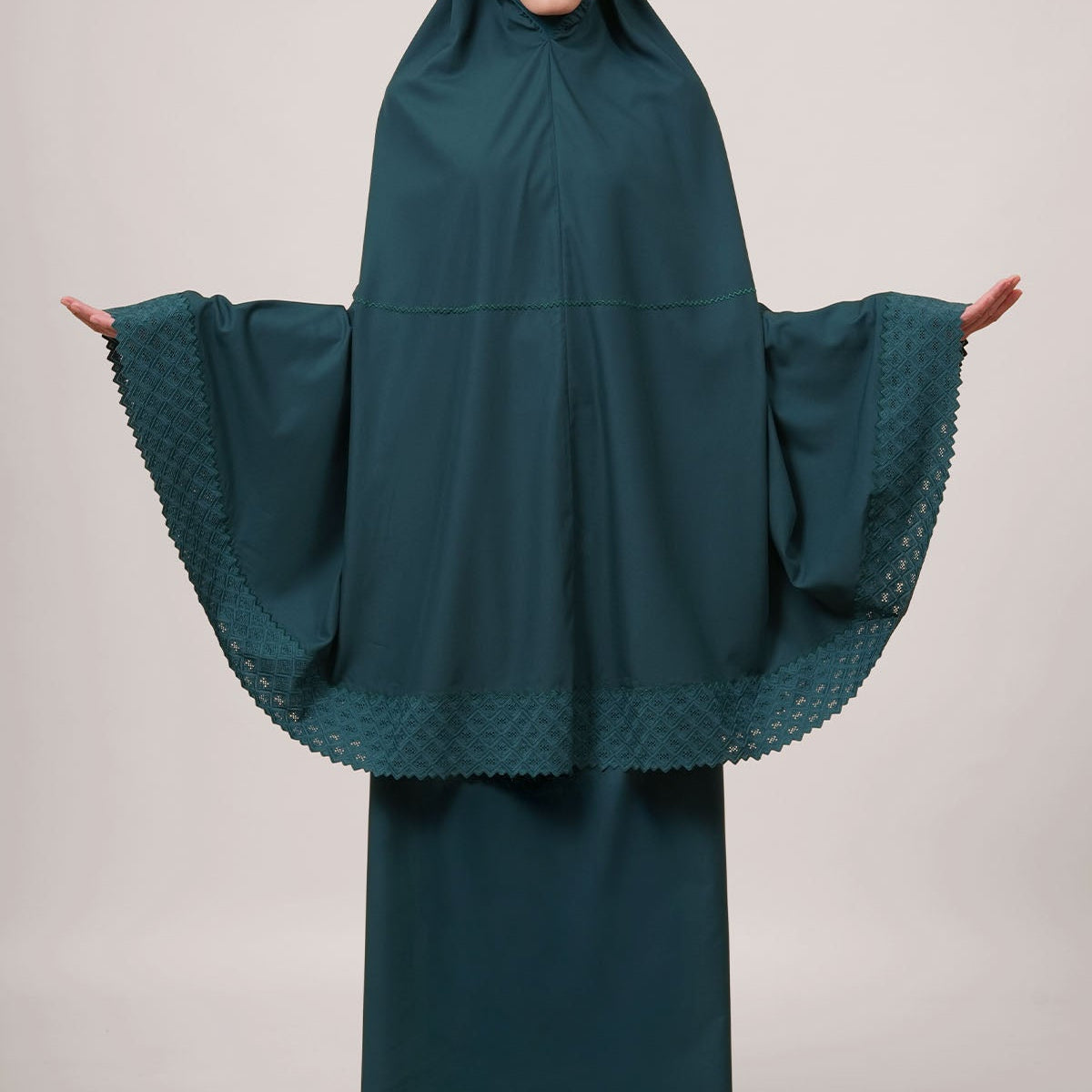 The gentle lace work is sewn with precision, the fabric is airy and cooling, and the fit hugs just right without leaving a mark. It’s the kind of telekung you reach for, again and again.