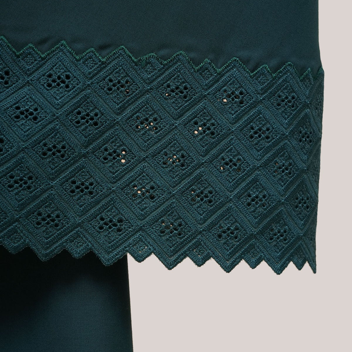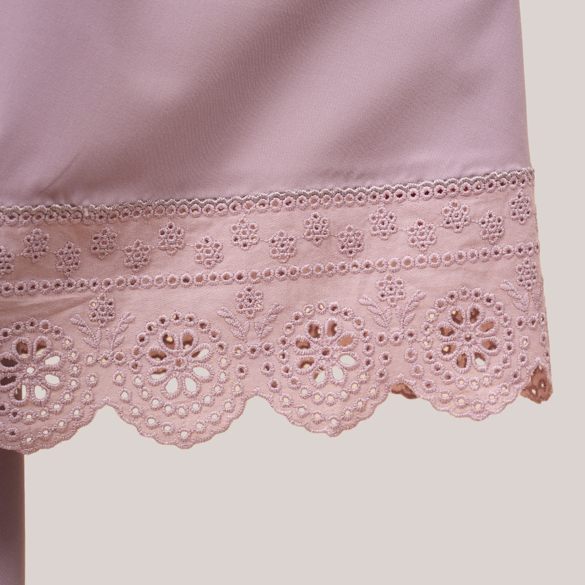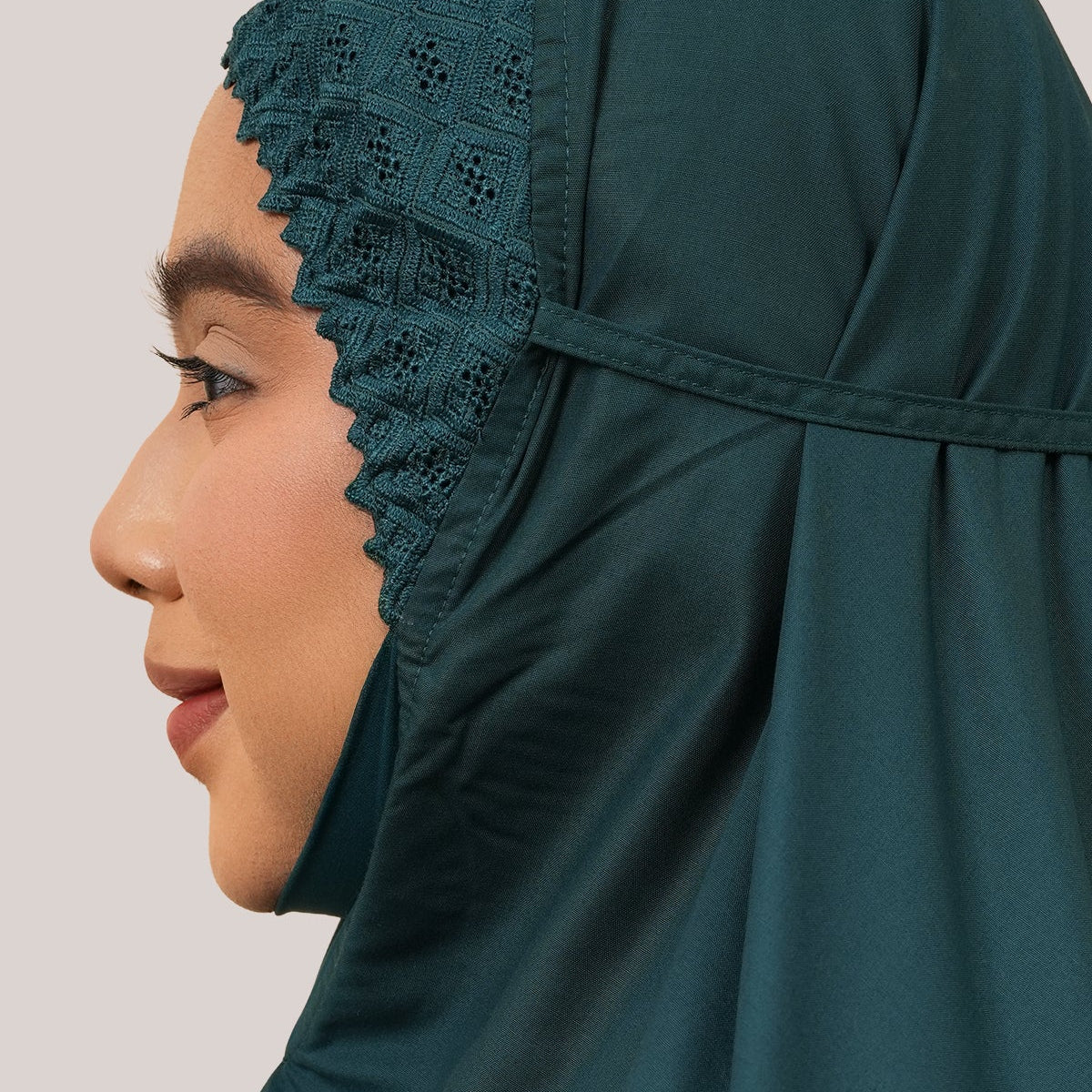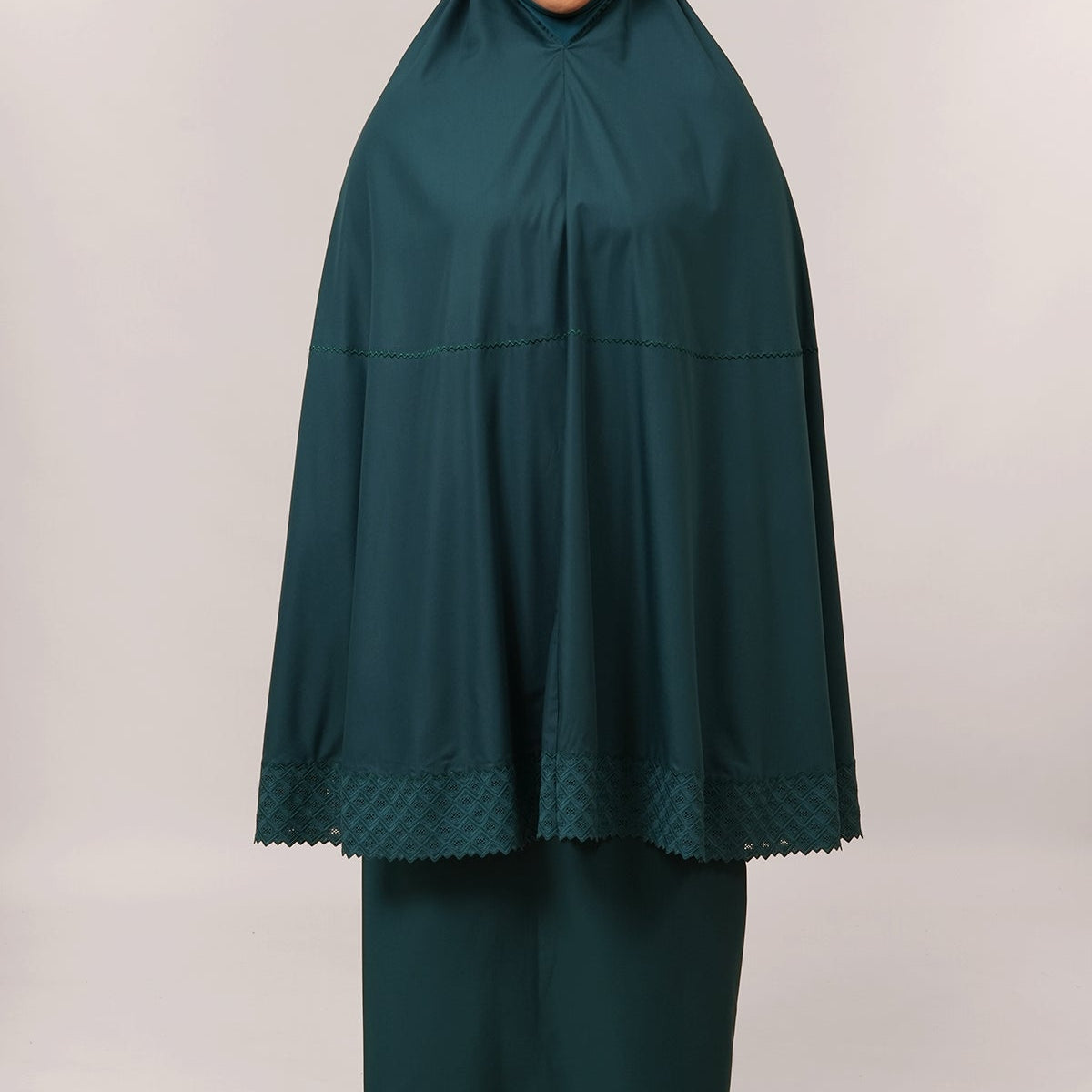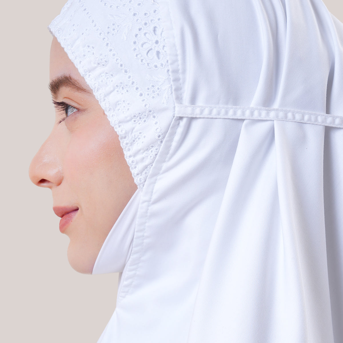 The gentle lace work is sewn with precision, the fabric is airy and cooling, and the fit hugs just right without leaving a mark. It’s the kind of telekung you reach for, again and again.