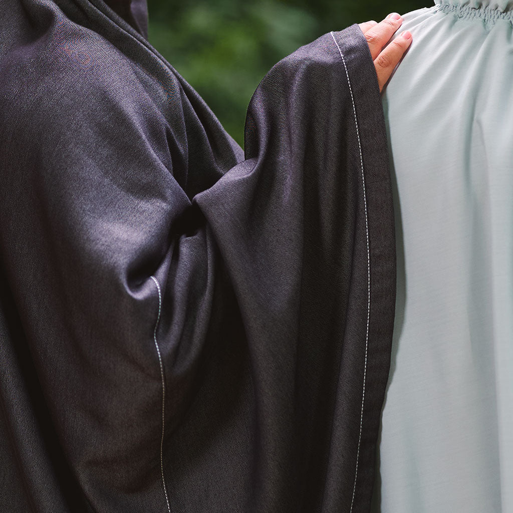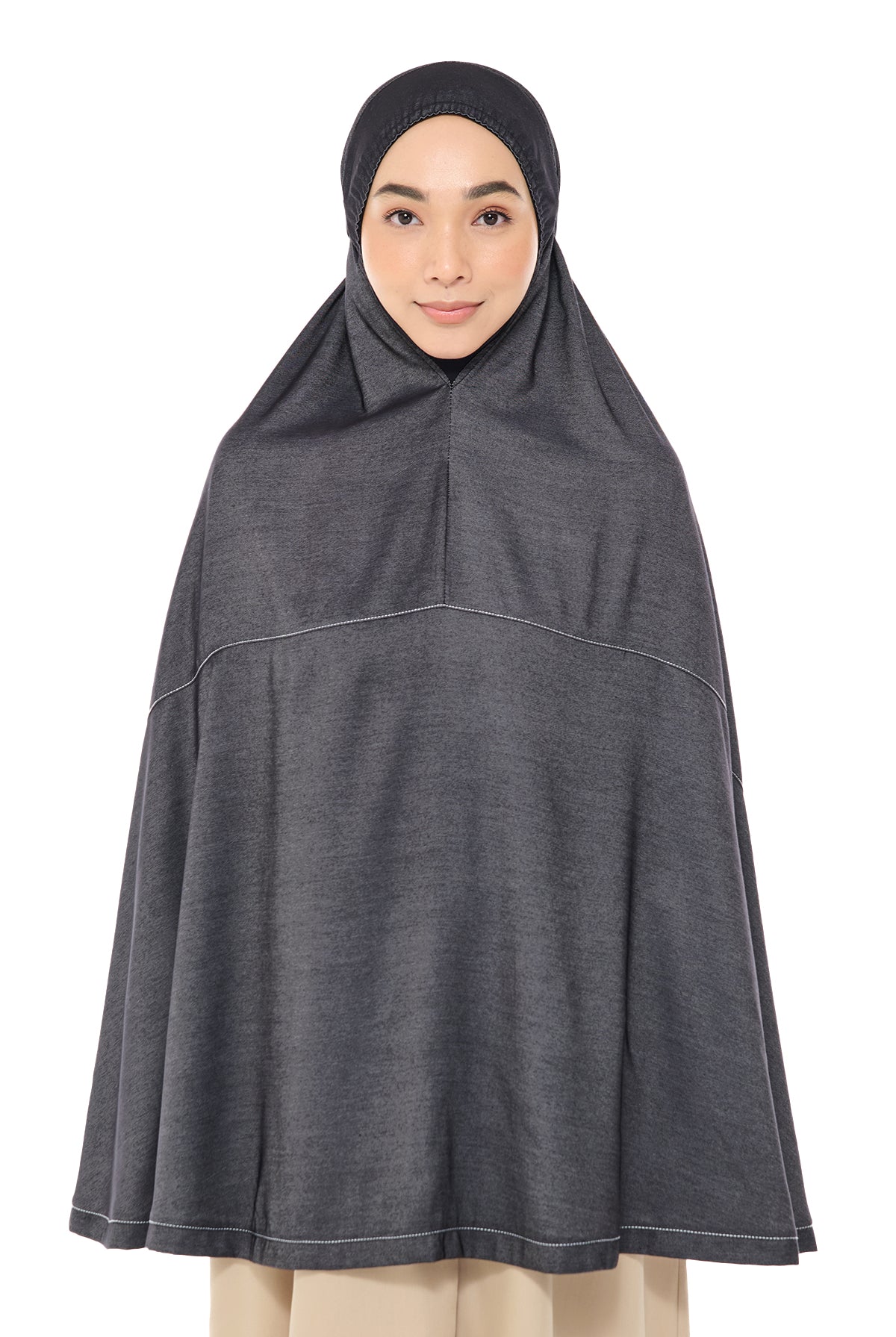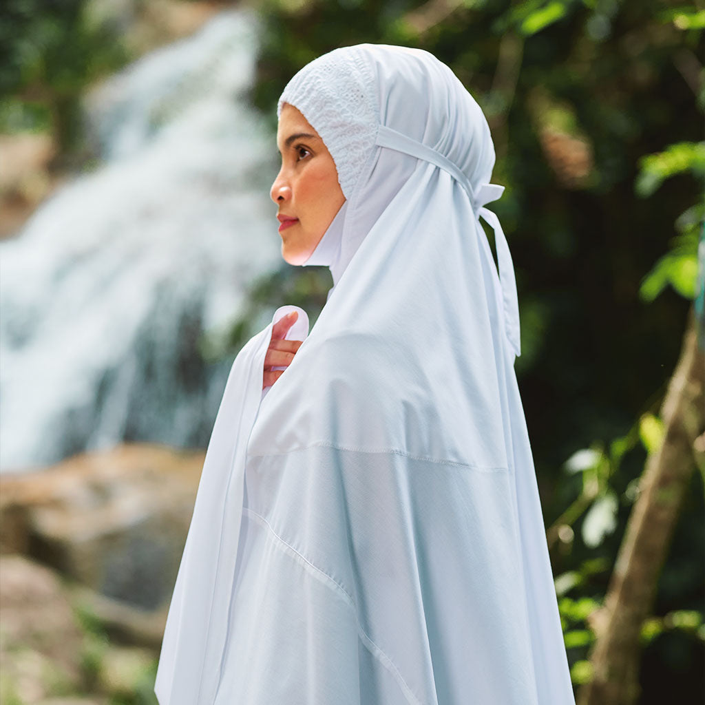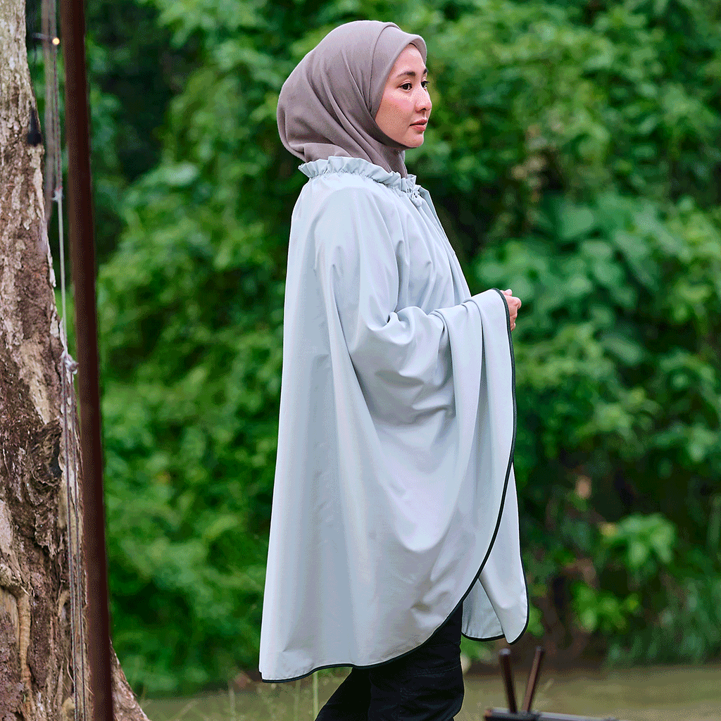 Crafted from Khadijah Basic Poplin, Flair Khadijah Eze is lightweight yet durable, wrinkle-resistant, and provides a cooling sensation. With its poncho-like design, drawstring high-neck collar, and sleek ribbon piping finish, it offers effortless wearing and a minimalistic look for your ibadah.