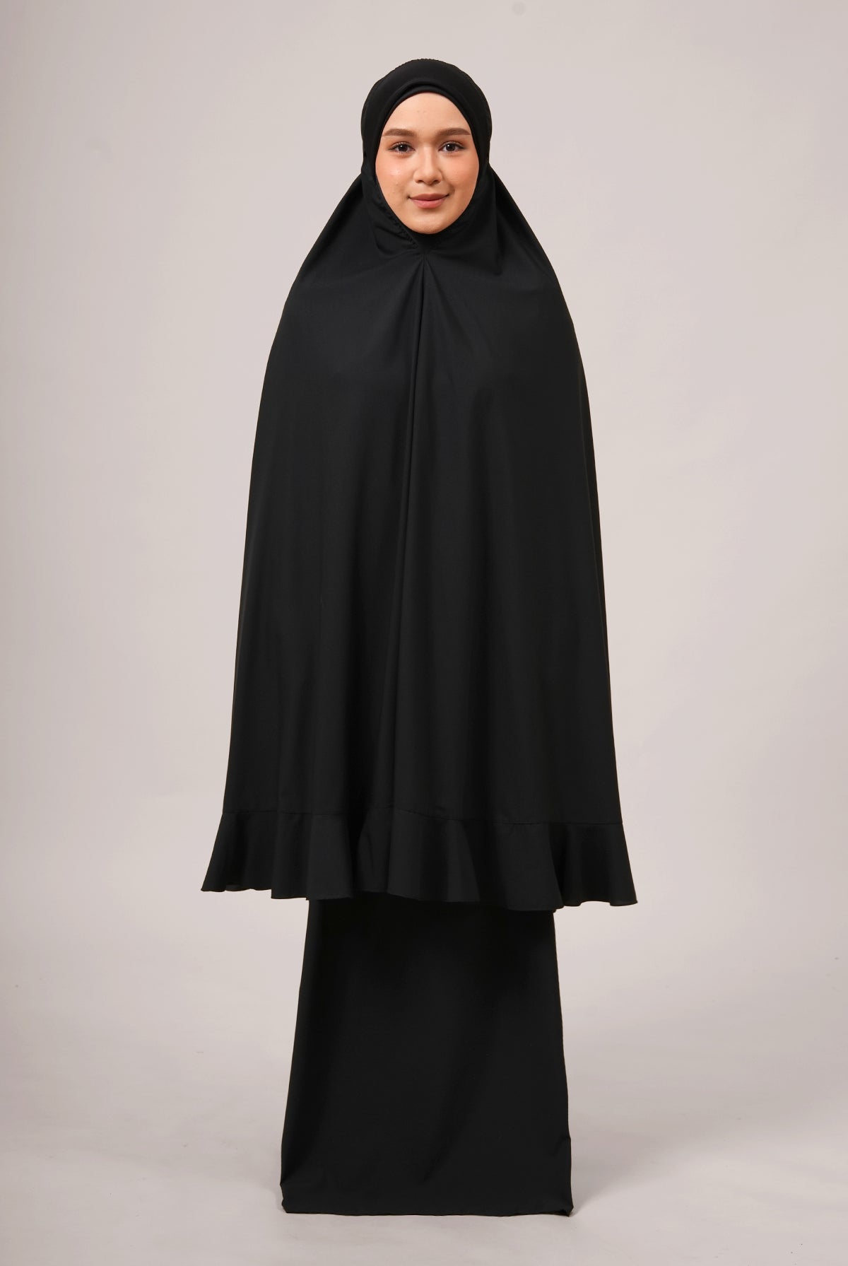 Made from breathable and durable KUF fabric, this telekung dries quickly and remains resilient through wear and wash. Featuring baby seam stitching for a refined finish and a ruffled panel for a gentle feminine flow, Sabira stays true to simplicity without sacrificing charm.