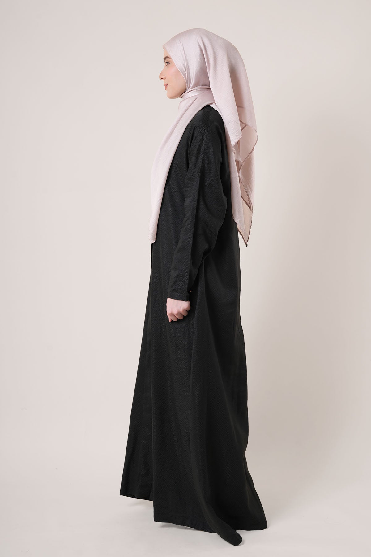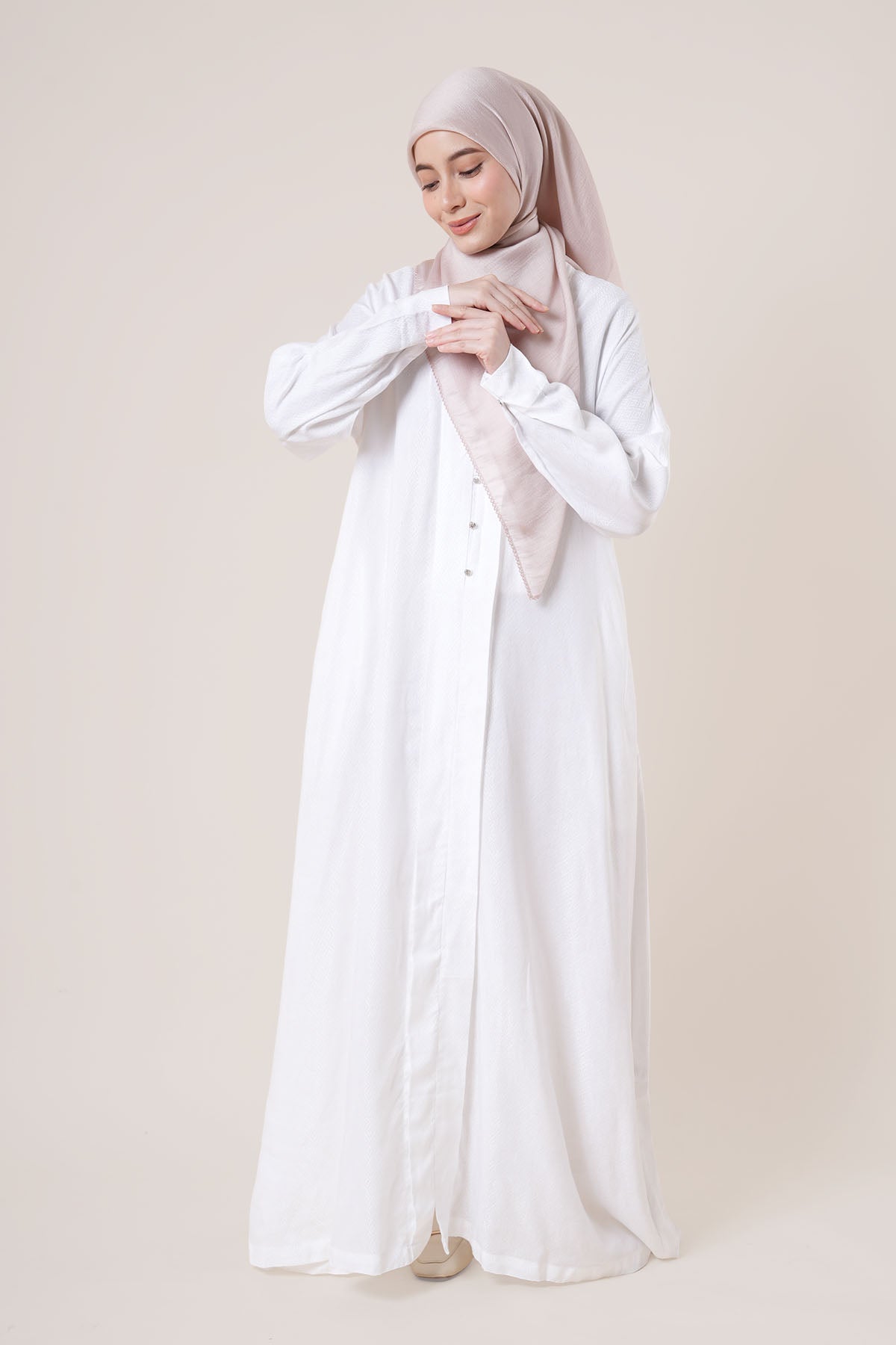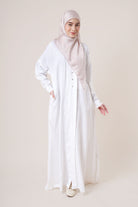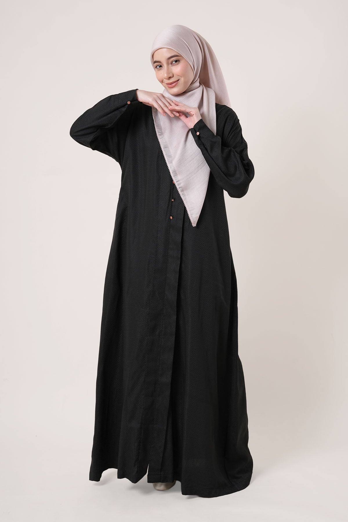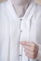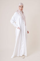 Made from wrinkle-resistant matte satin, the Adra Jubah features a relaxed silhouette with front pleats and a soft drape that flatters all body shapes. The cuffed sleeves, side pockets, and lightweight lining make it a versatile option for formal events or daily wear.