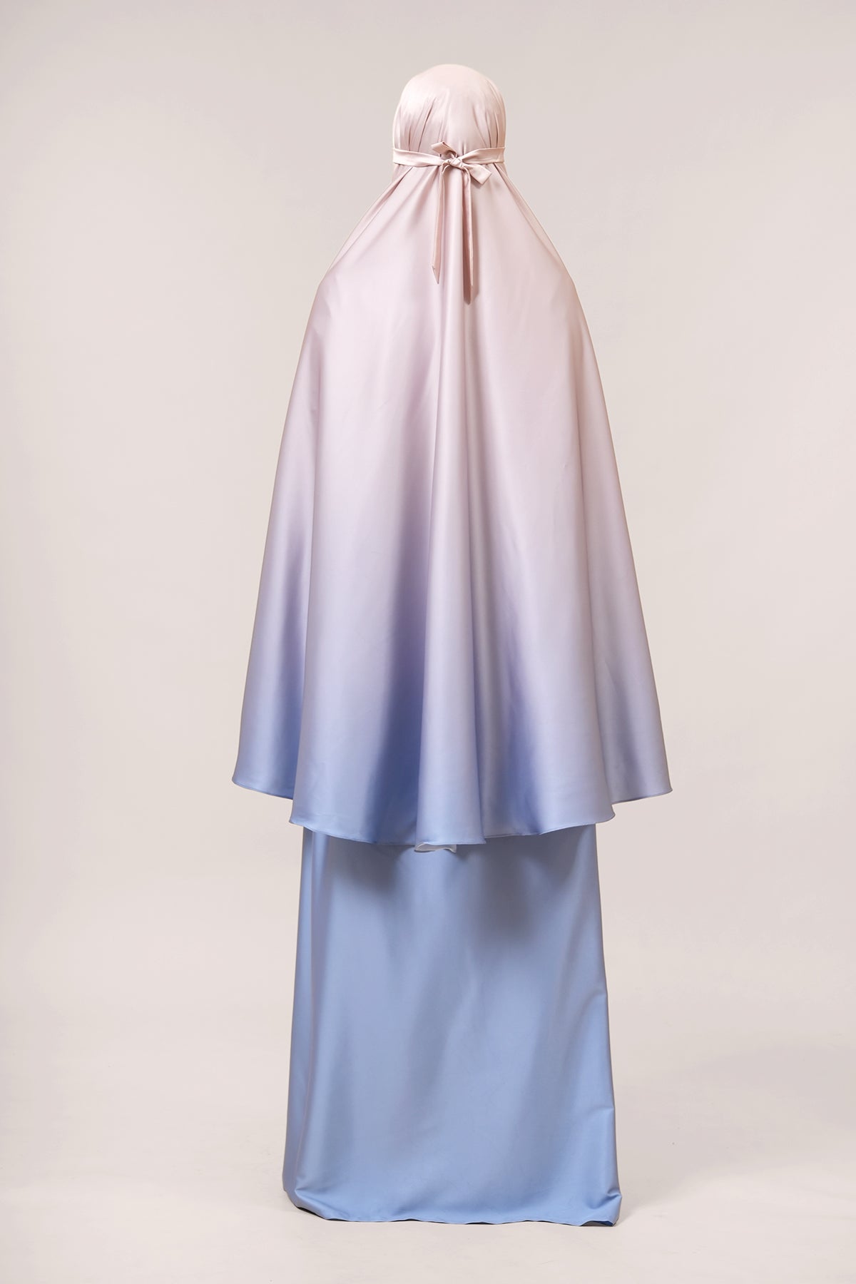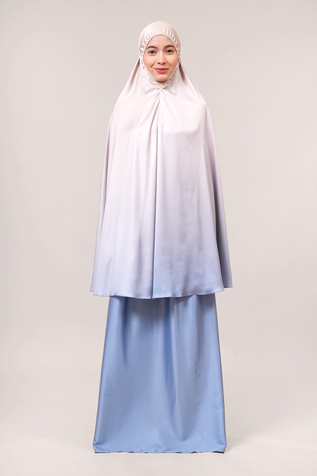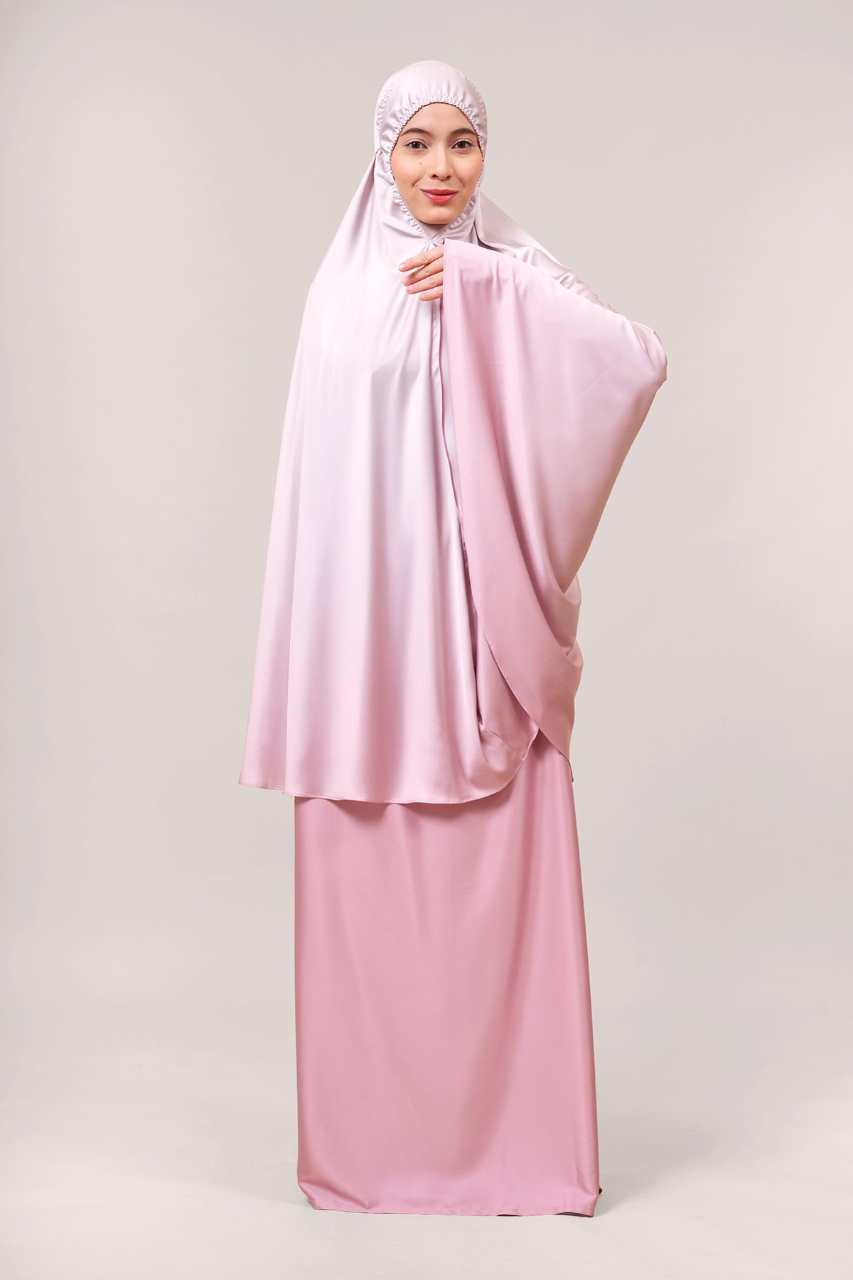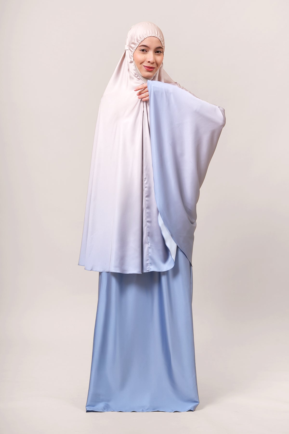 Made from luxurious Amarin Satin, this telekung features a natural sheen and graceful drape that adds an elegant, polished look during prayer. The design showcases a stunning ombre print technique, blending two distinct tones to create a rich, artistic effect. Defined as a symbol of “Timeless Beauty,” the ombre trend remains versatile and relevant across all age groups. Finely stitched with reinforced edges to prevent fraying, this telekung offers both lasting durability and refined style, even with frequent washing.