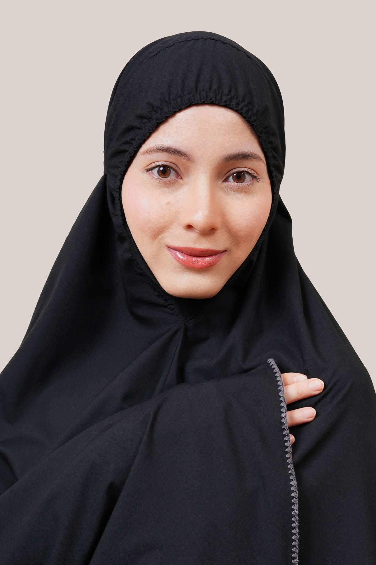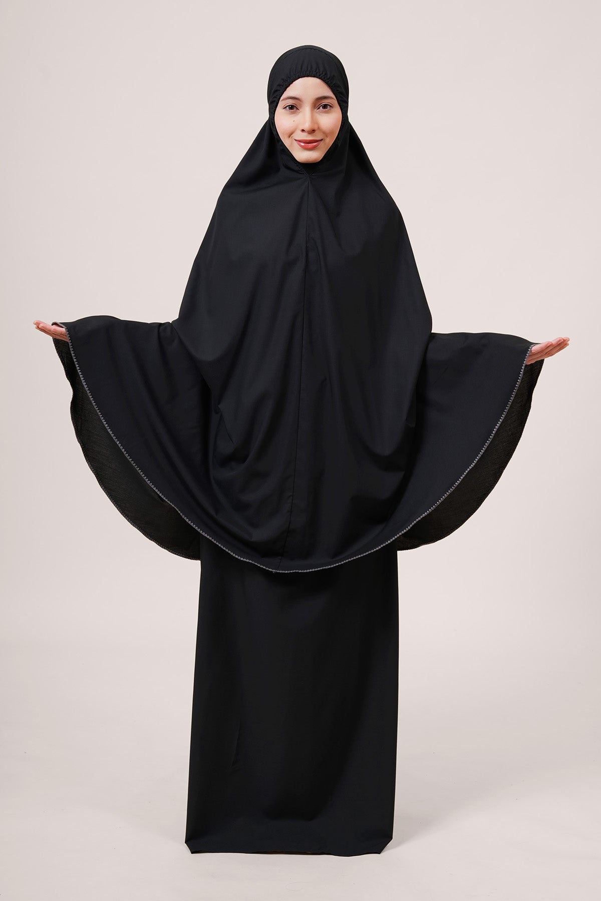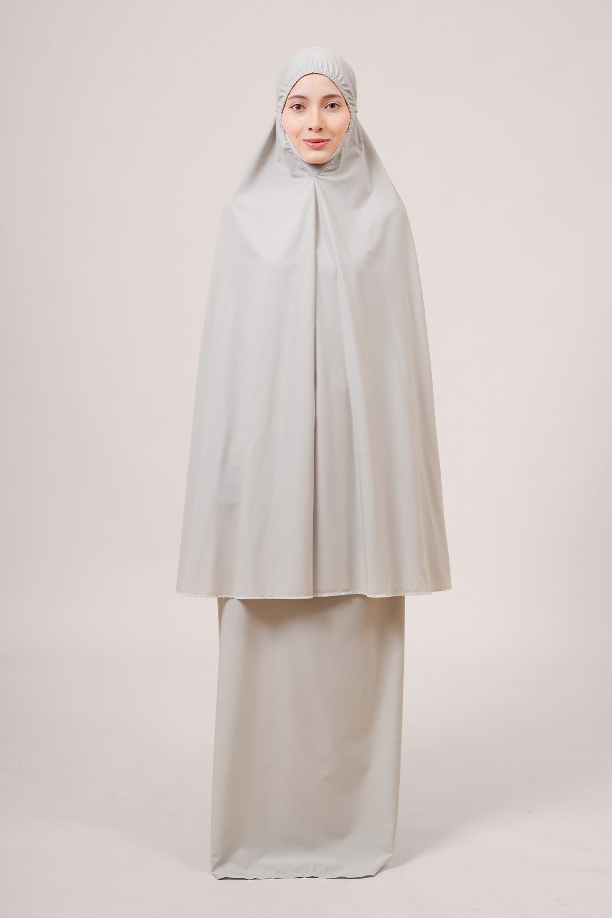 The Khadijah Basic Fine (KBF) telekung offers comfort, modesty, and practicality. Made from cool, breathable fabric that feels extra soft on the skin, it includes a soft ITY chin cover and a Classic headband with cushioned elastic that doesn't leave marks. The simple design is finished with neat shell stitch details, inspired by blooming petals. The fabric is strong, stretchable, and the color stays bright even after washing – perfect for everyday use and a symbol of a fresh start.